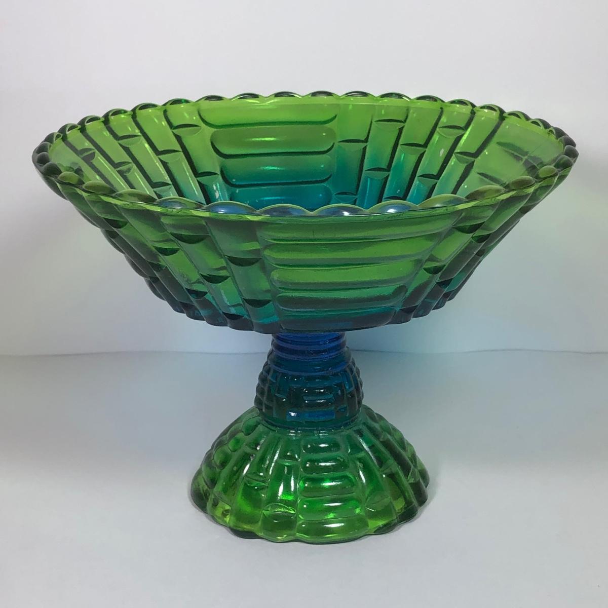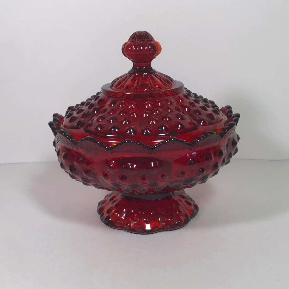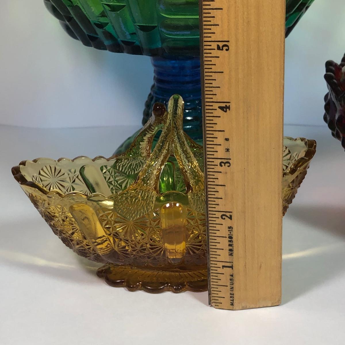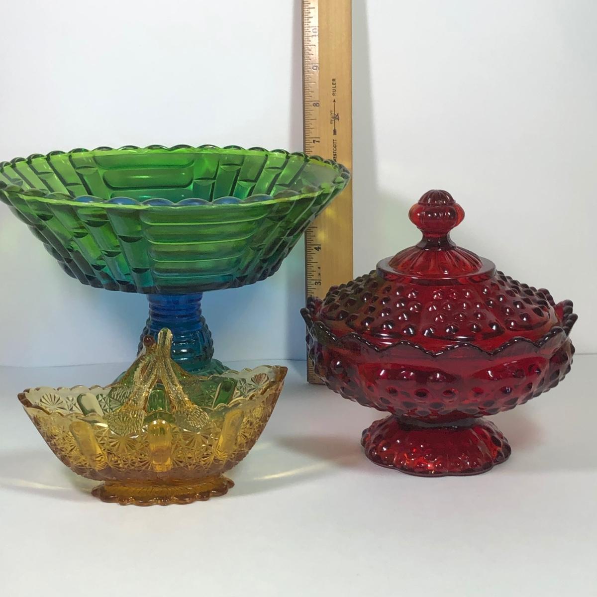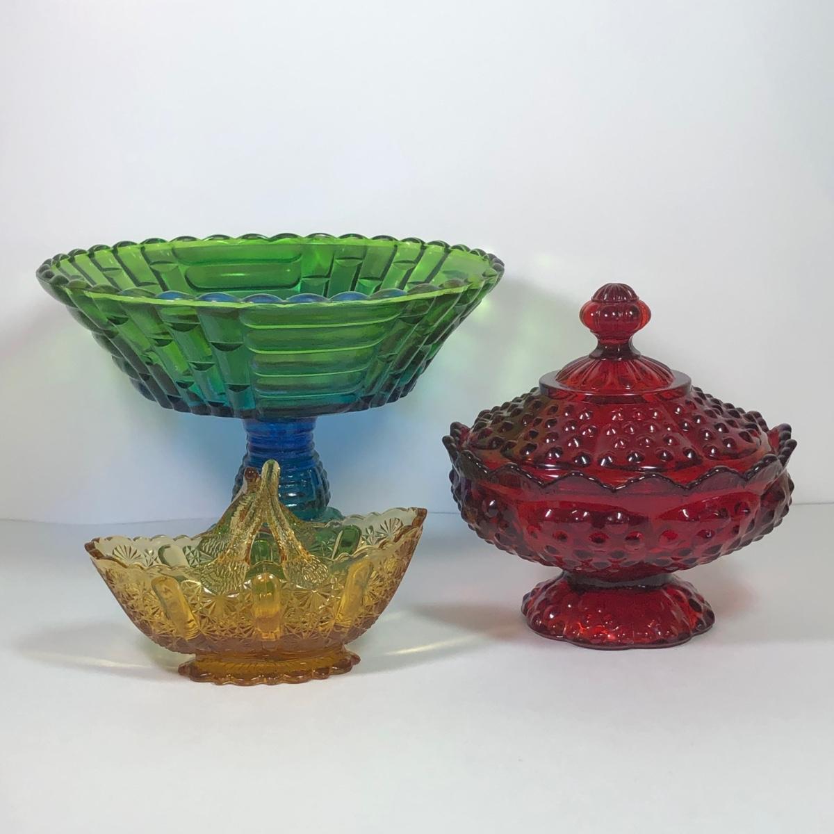 LOT 43M: Fenton Ruby Glass Lidded Dish, Beautiful Bleu and Green Pedestal Dish & Miniature Basket