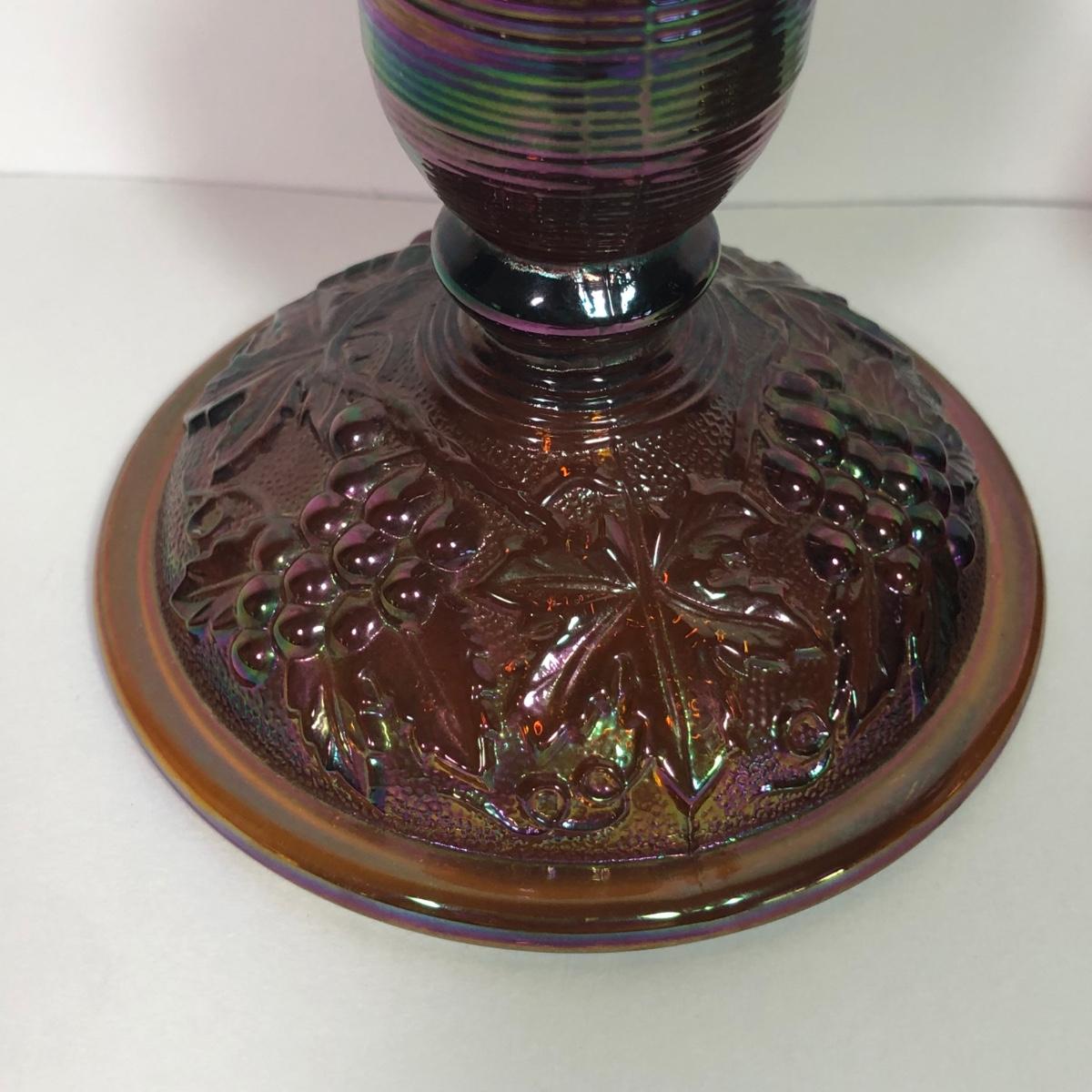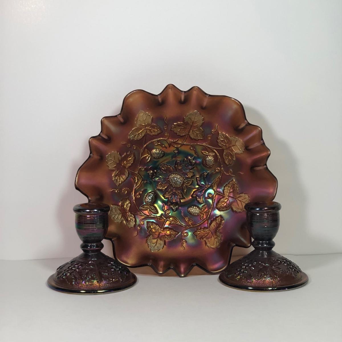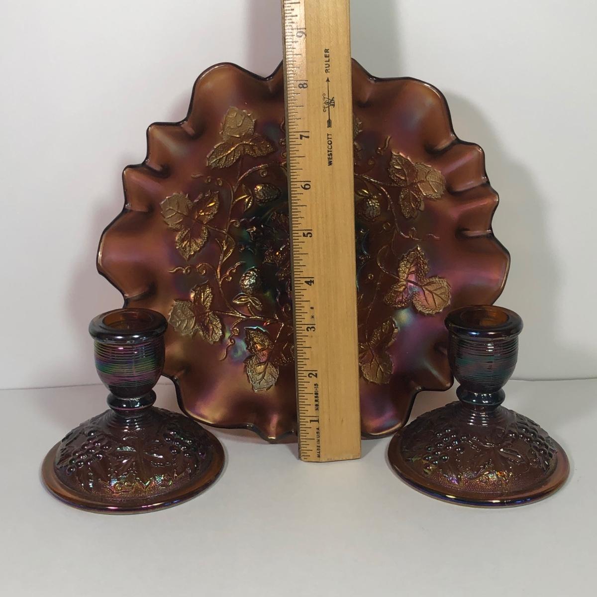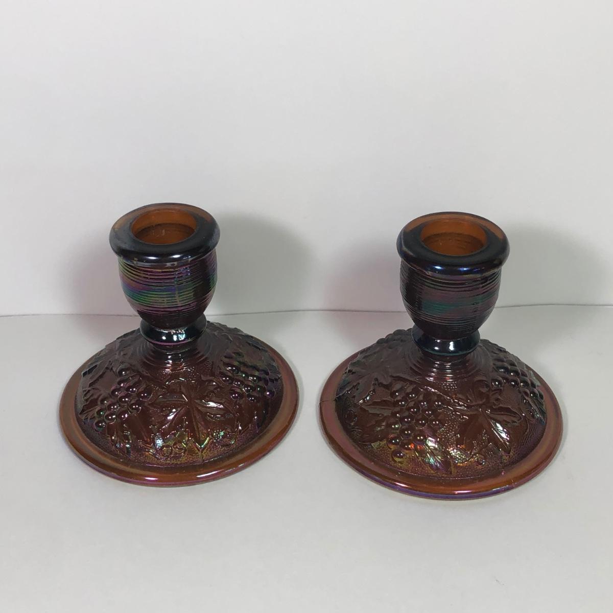 LOT 45M: Vintage Iridescent Carnival Glass - Imperial Glass Company Grape Candlestick Holders & Unmarked Berry Bowl