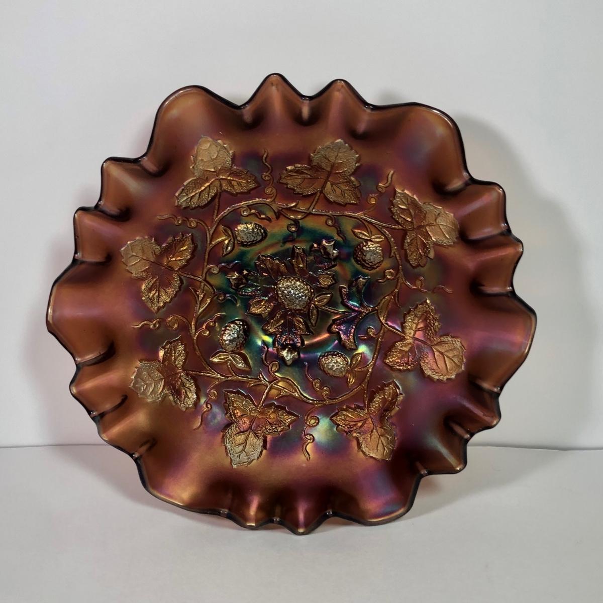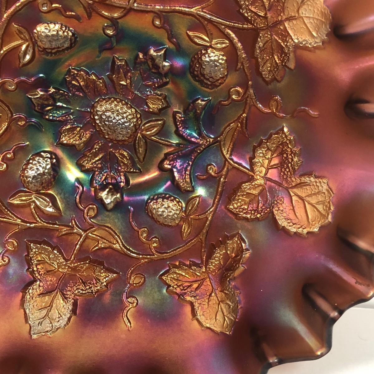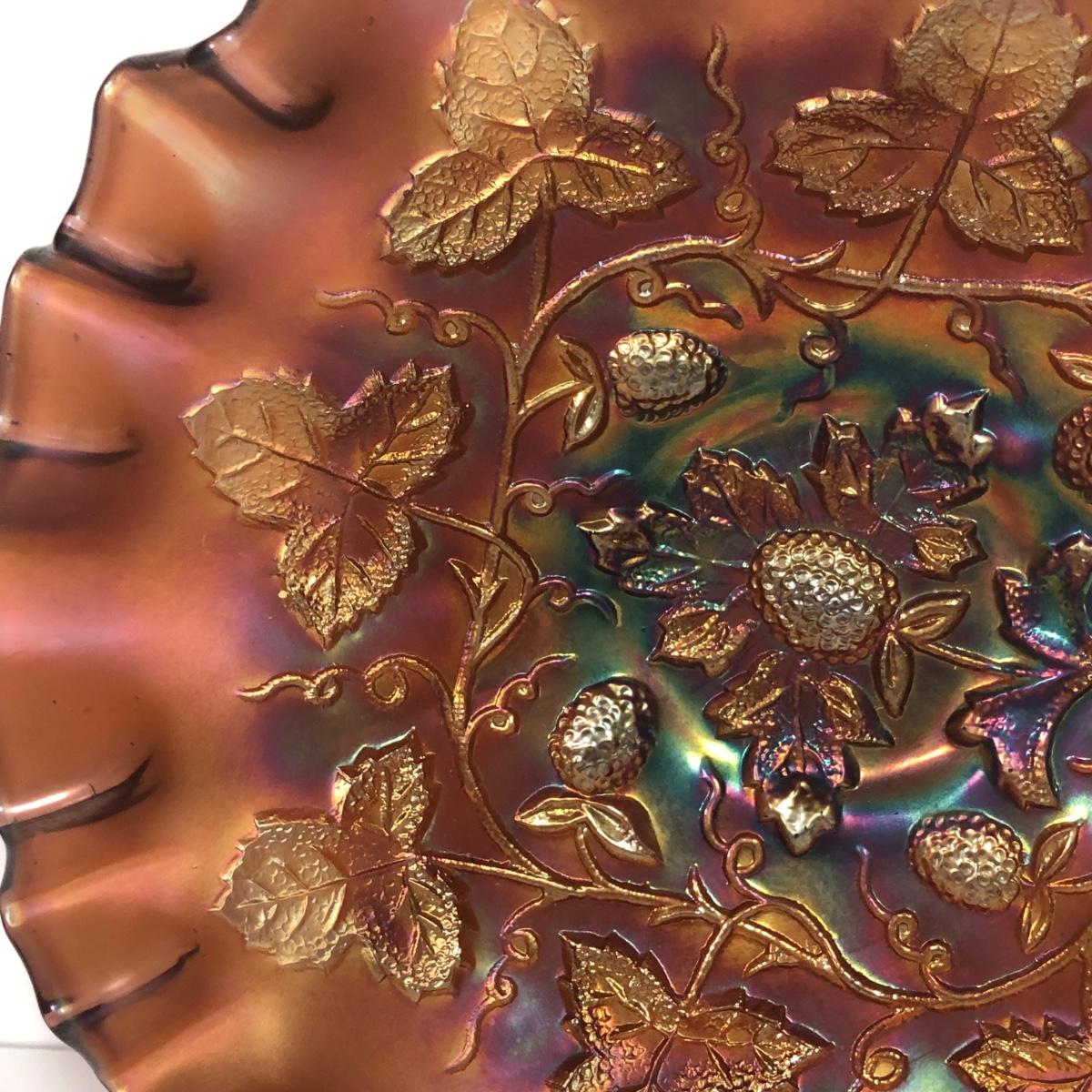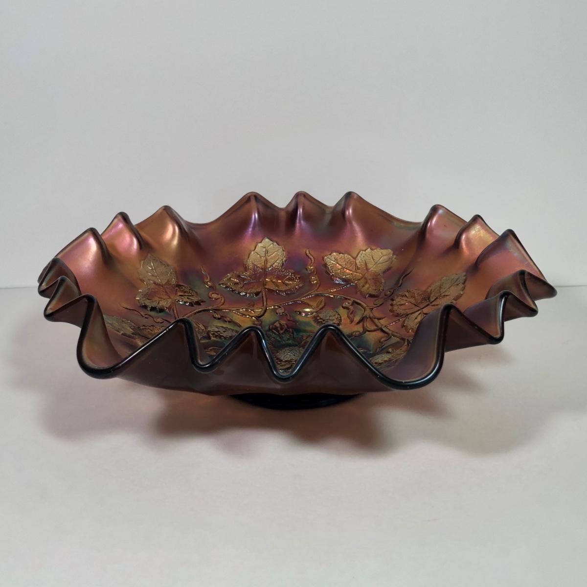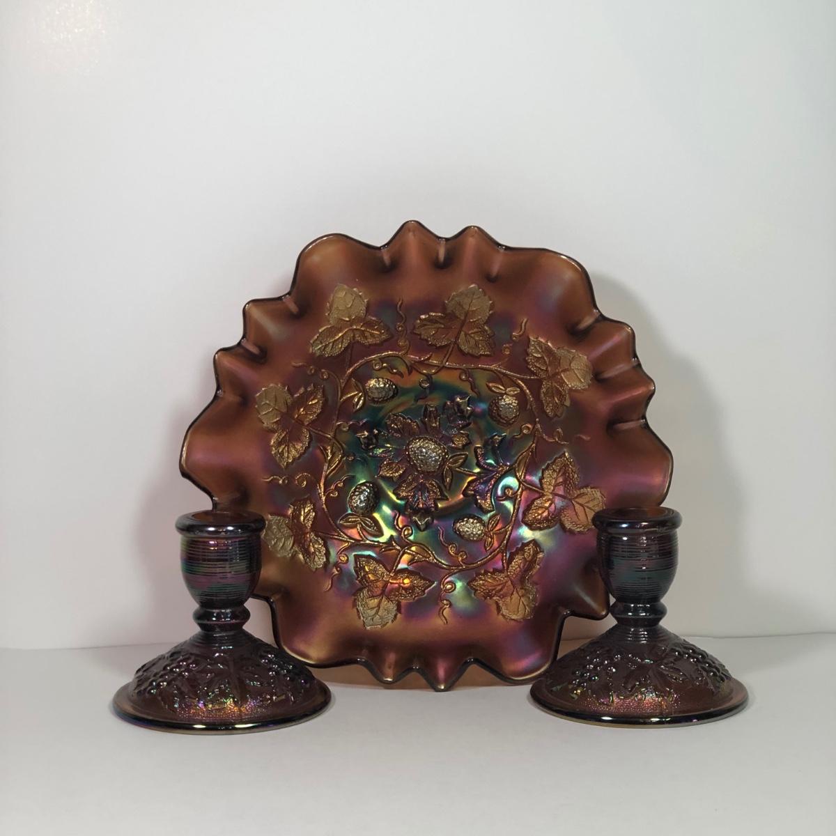 LOT 45M: Vintage Iridescent Carnival Glass - Imperial Glass Company Grape Candlestick Holders & Unmarked Berry Bowl