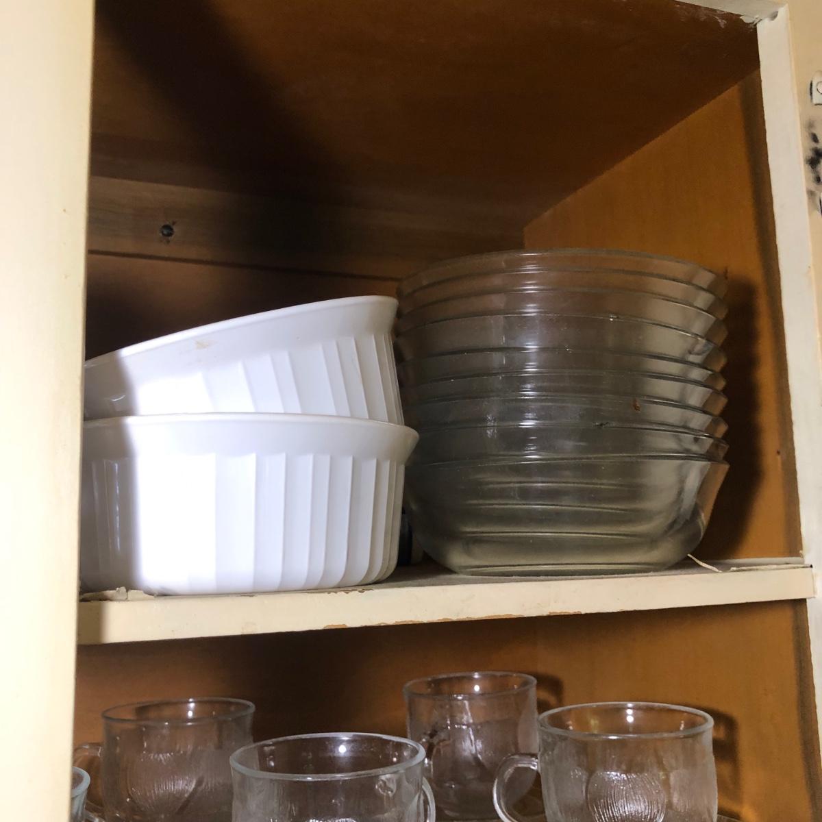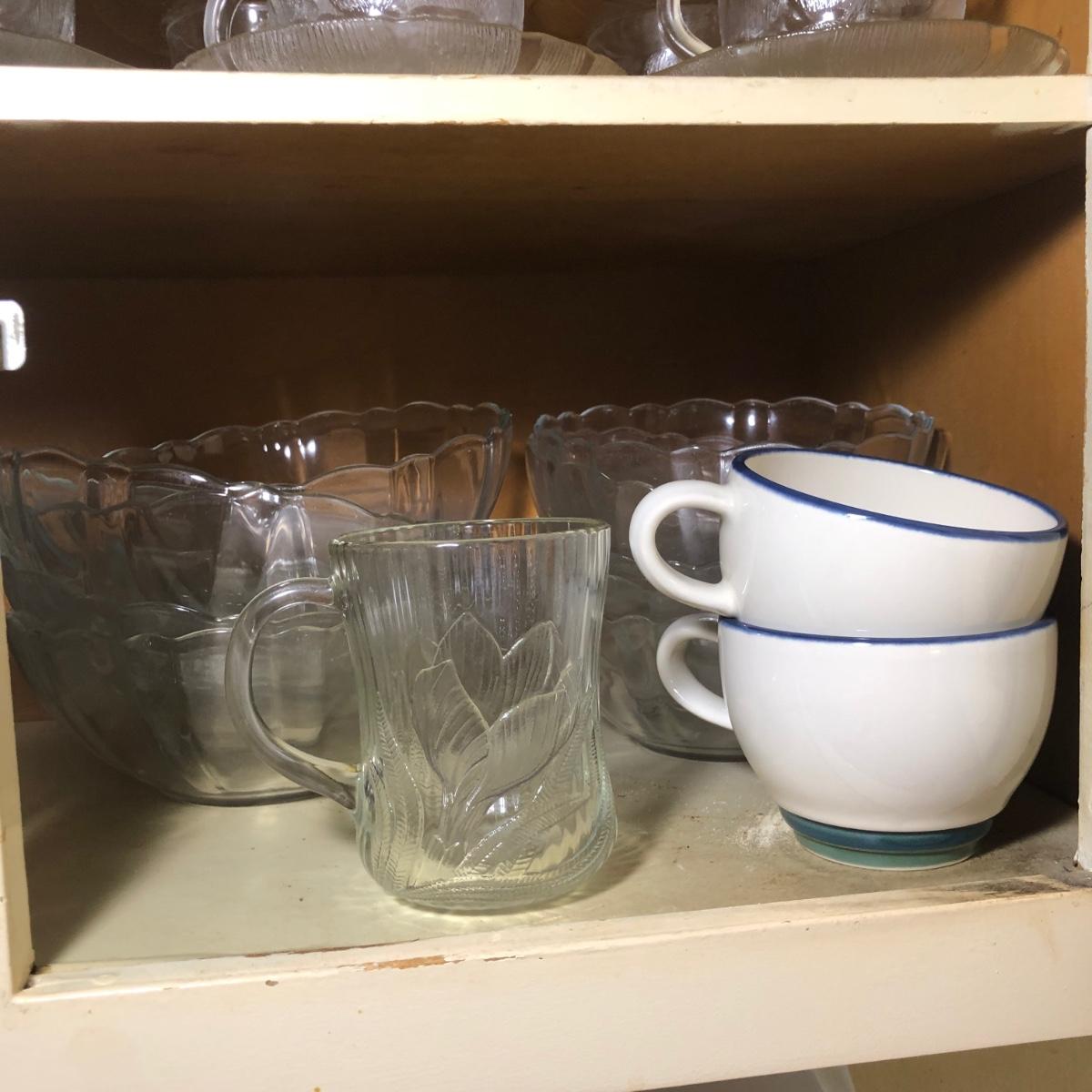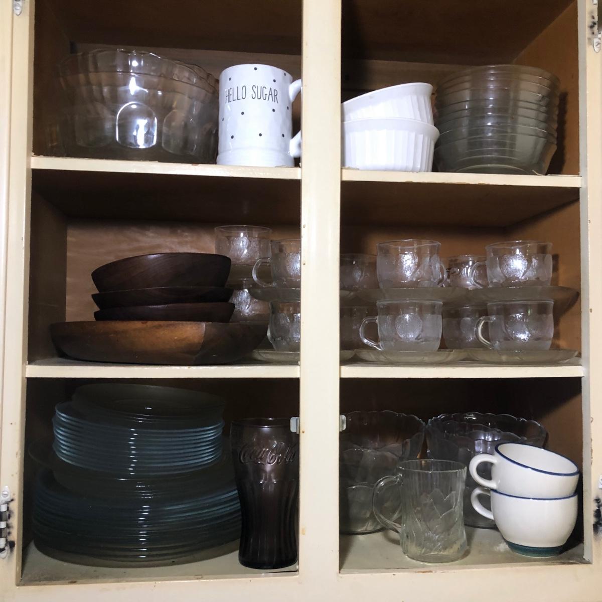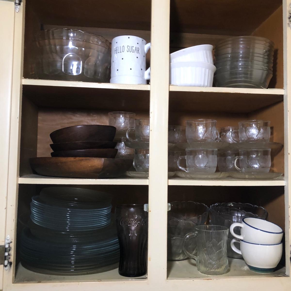 LOT 63M: Kitchen Cabinet Contents - Glass Mugs, Glass Plates/Bowls, Wooden Bowls & More