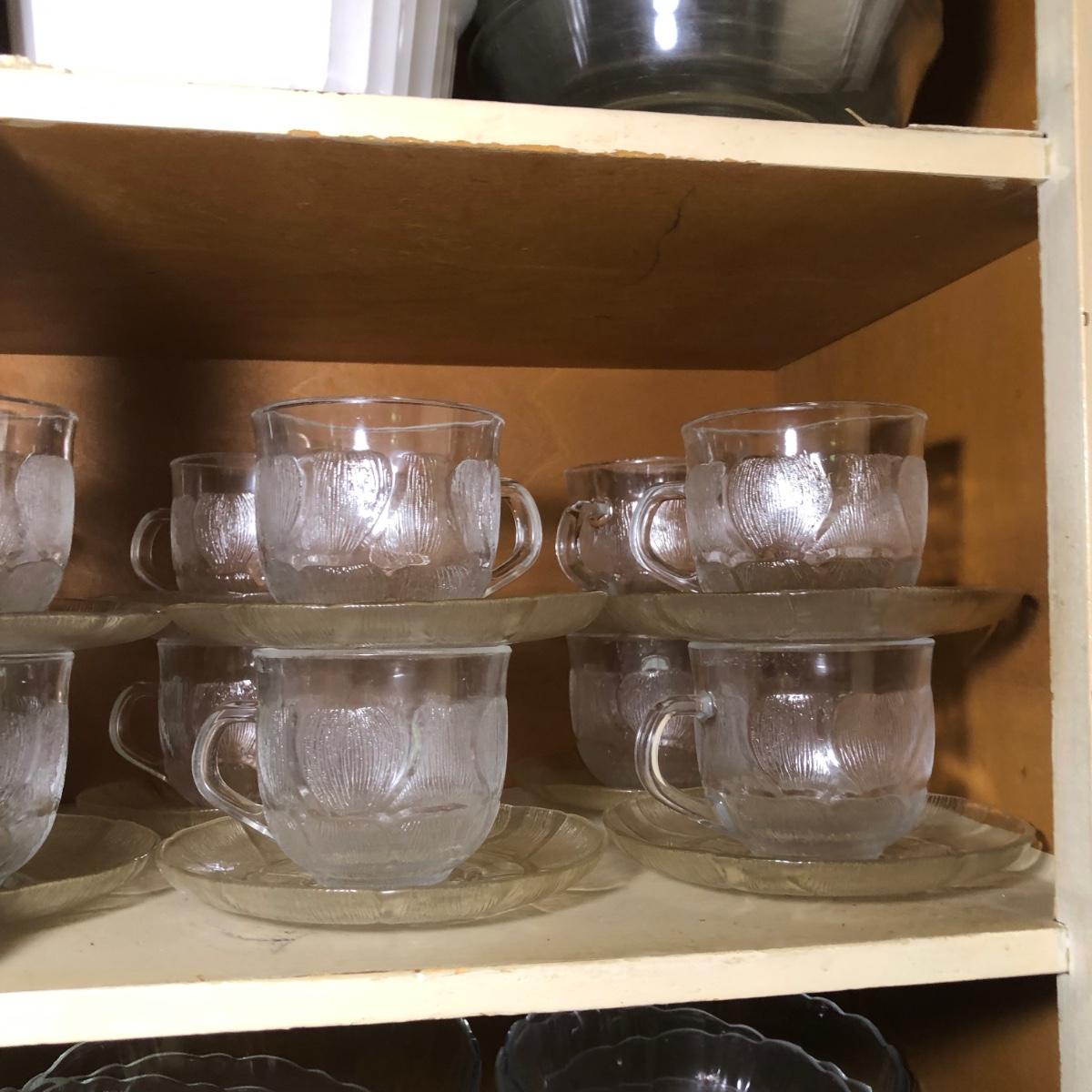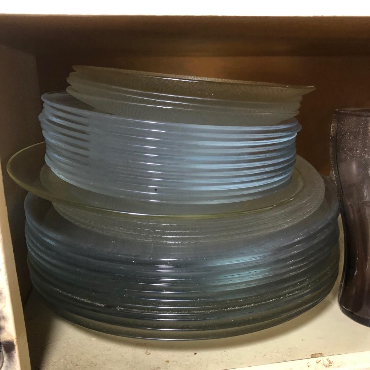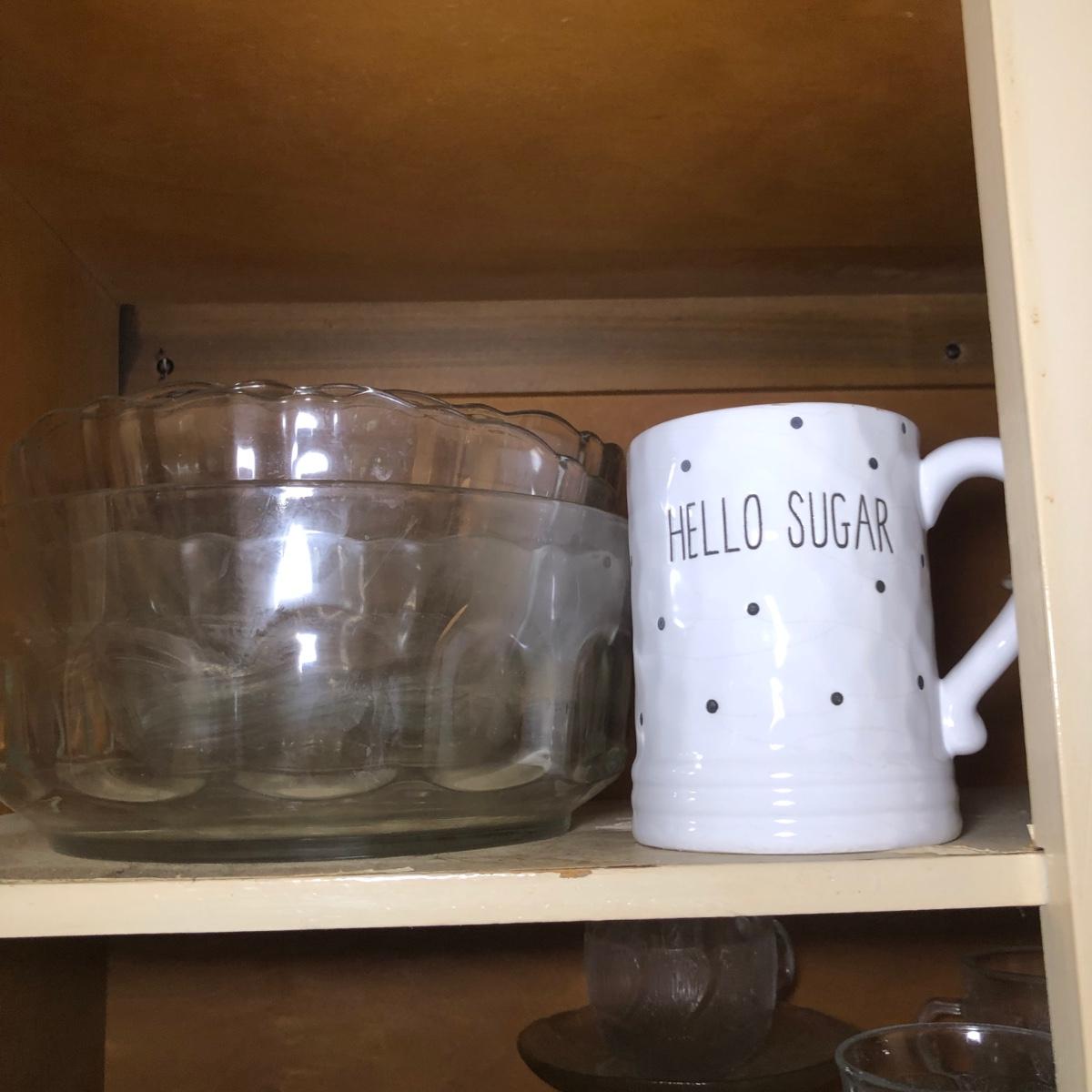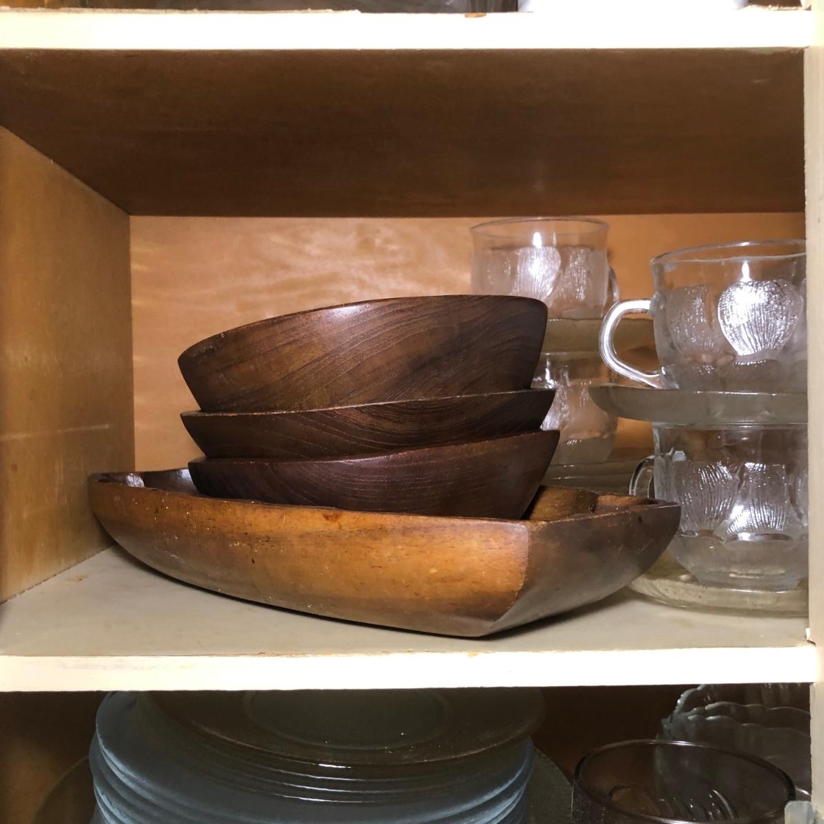 LOT 63M: Kitchen Cabinet Contents - Glass Mugs, Glass Plates/Bowls, Wooden Bowls & More