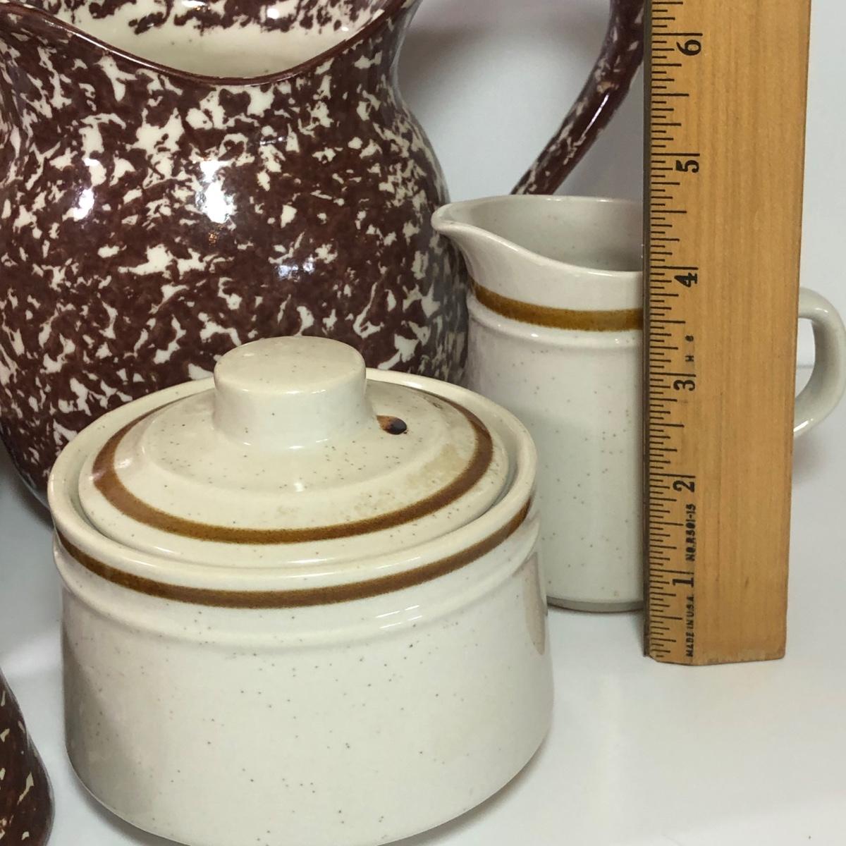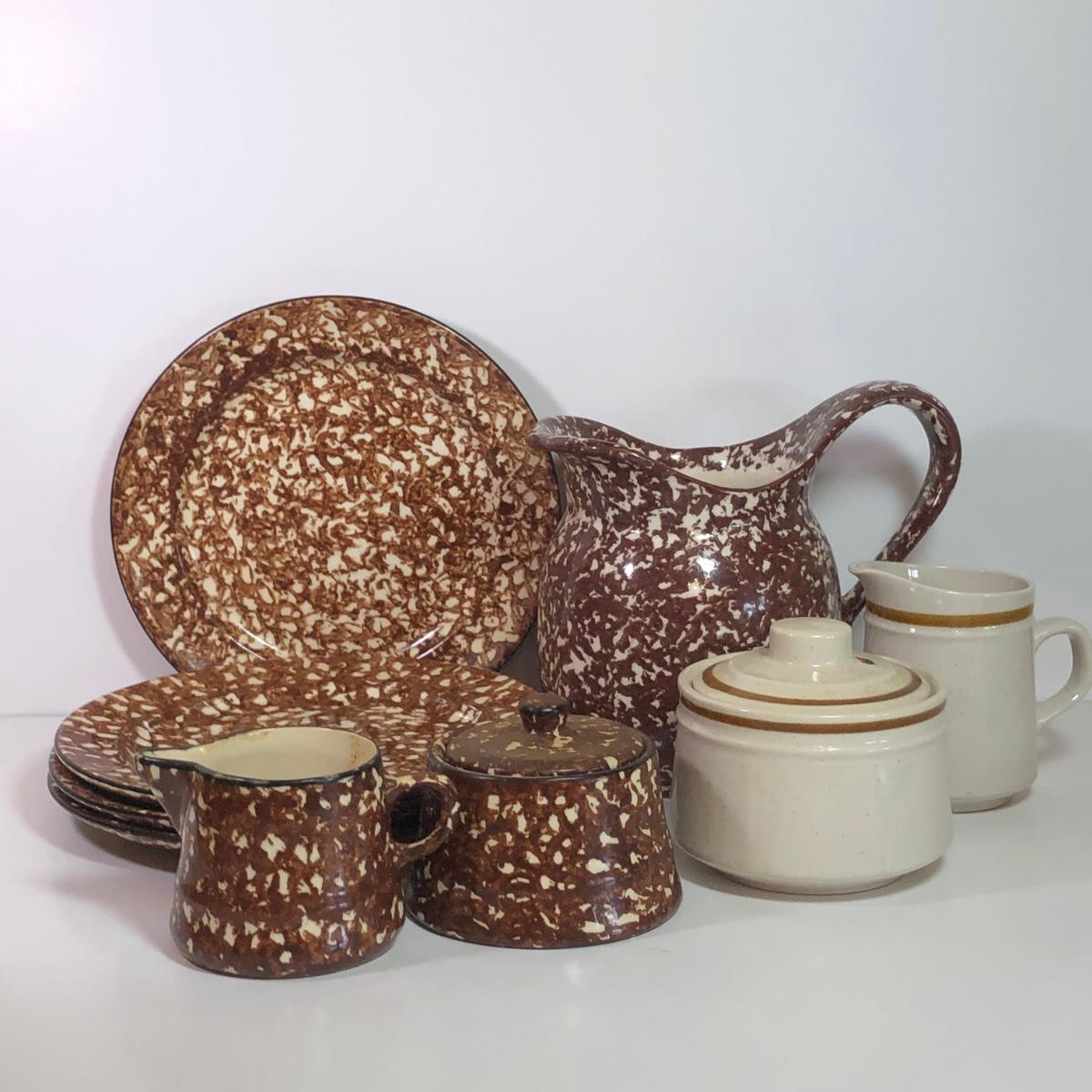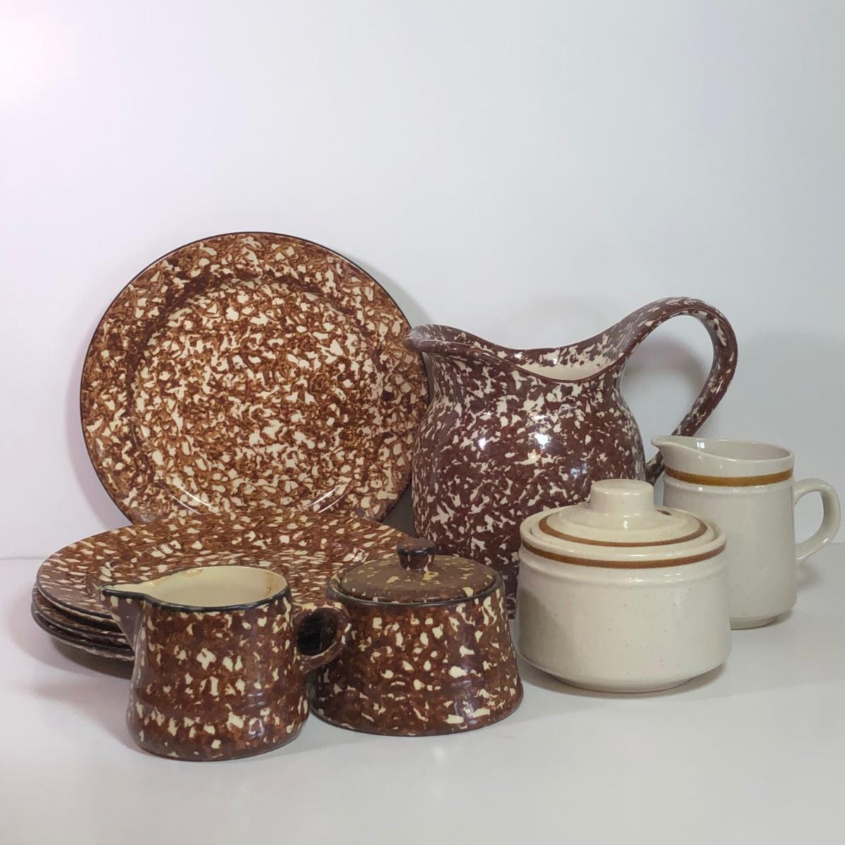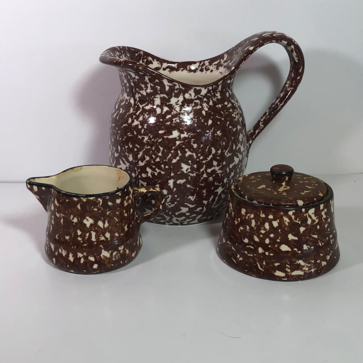 LOT 71M: Royal Cumberland for Royal Copenhagen Brown/White Spongeware Pottery & Old Brook Collection Stoneware Creamer & Sugar