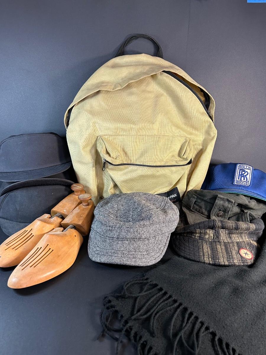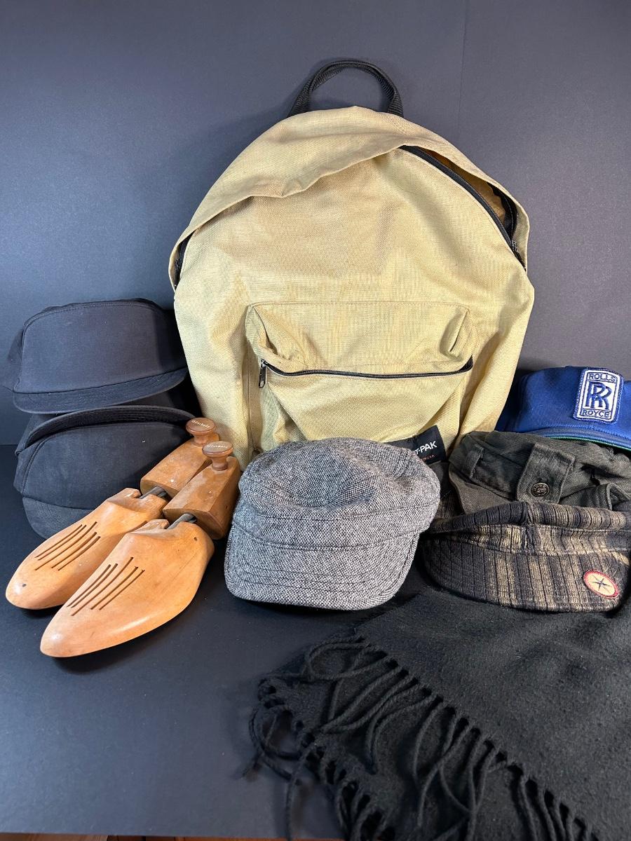 LOT 83C: Men's Closet Finds: Jansport Backpack, hats, scarf and wood shoe stretchers.
