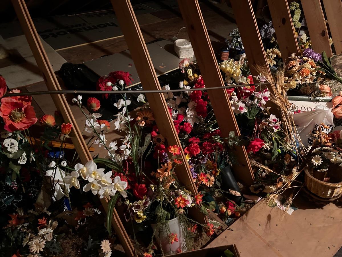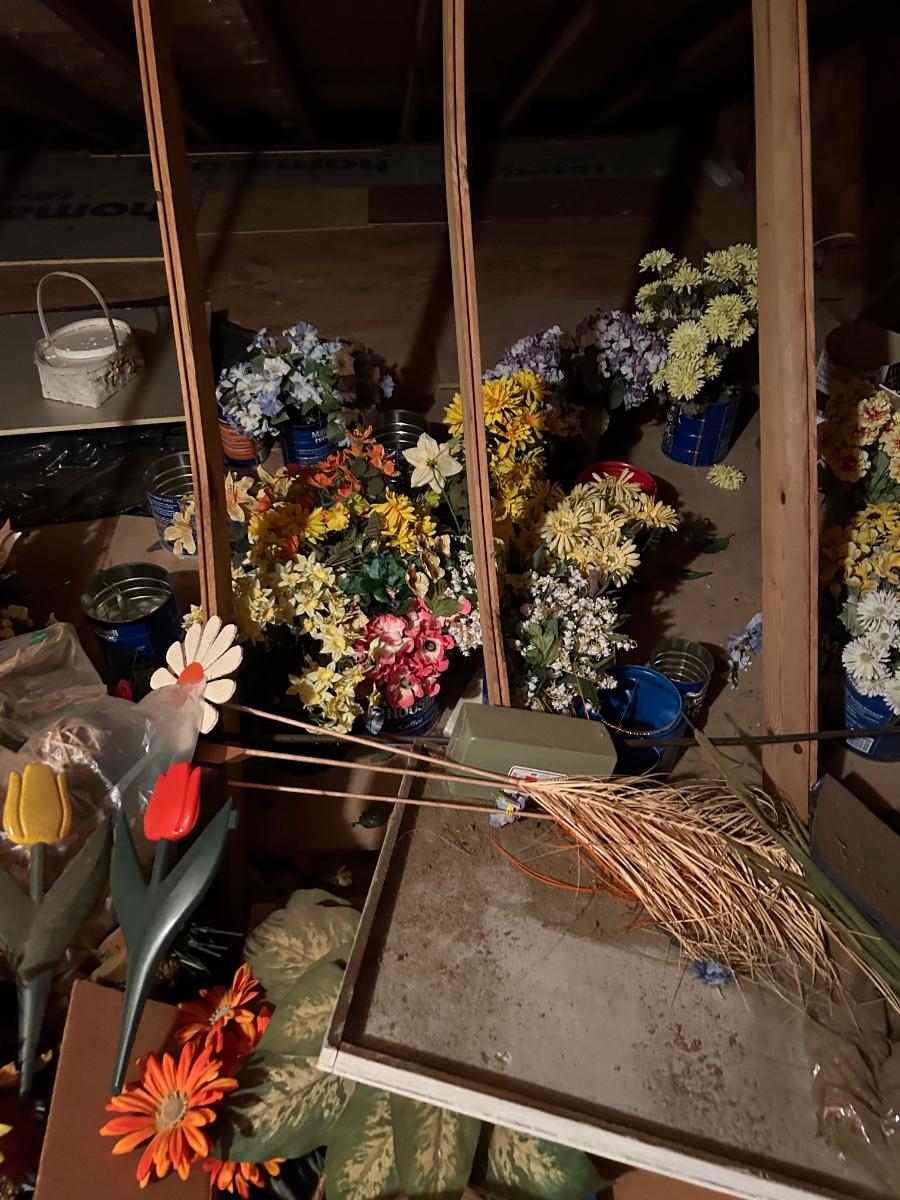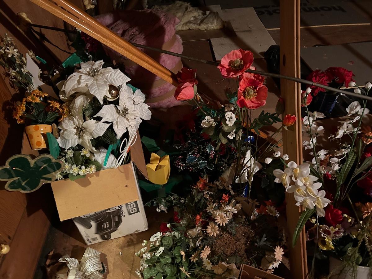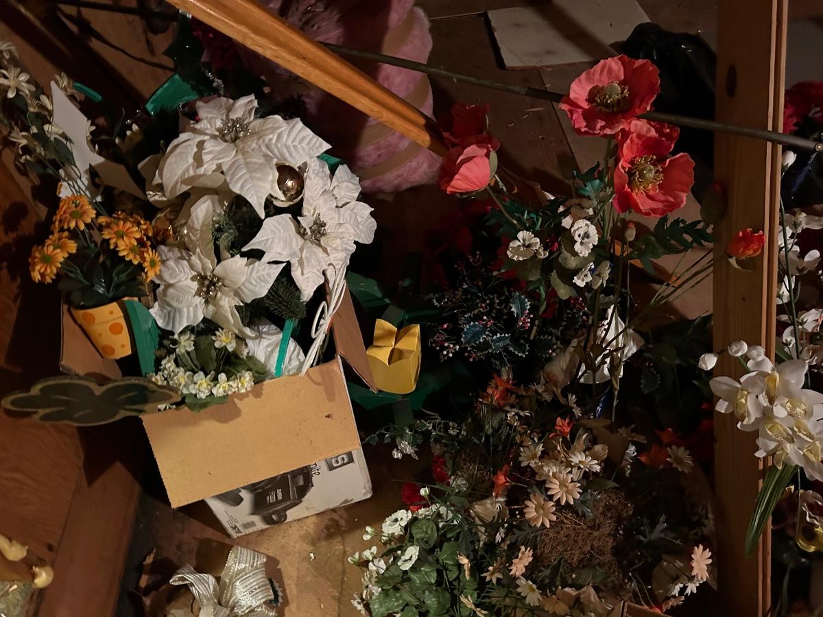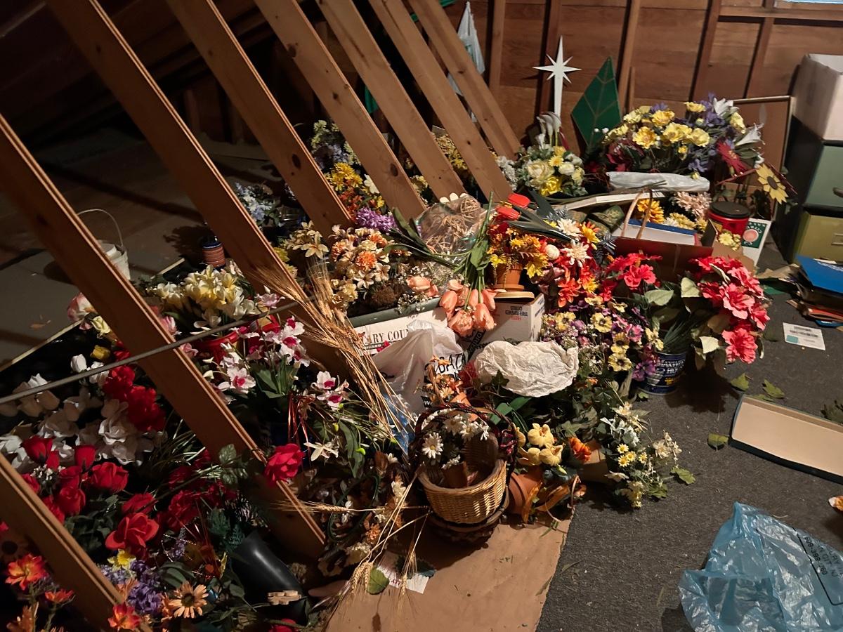 Lot includes all contents in attic. Silk flowers, holiday flowers, outdoor wood decor, Christmas decor and more.