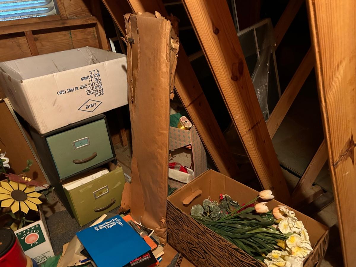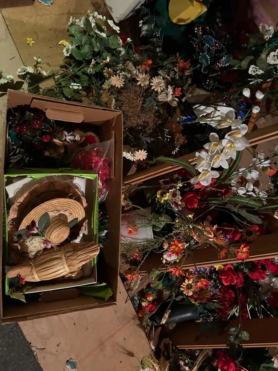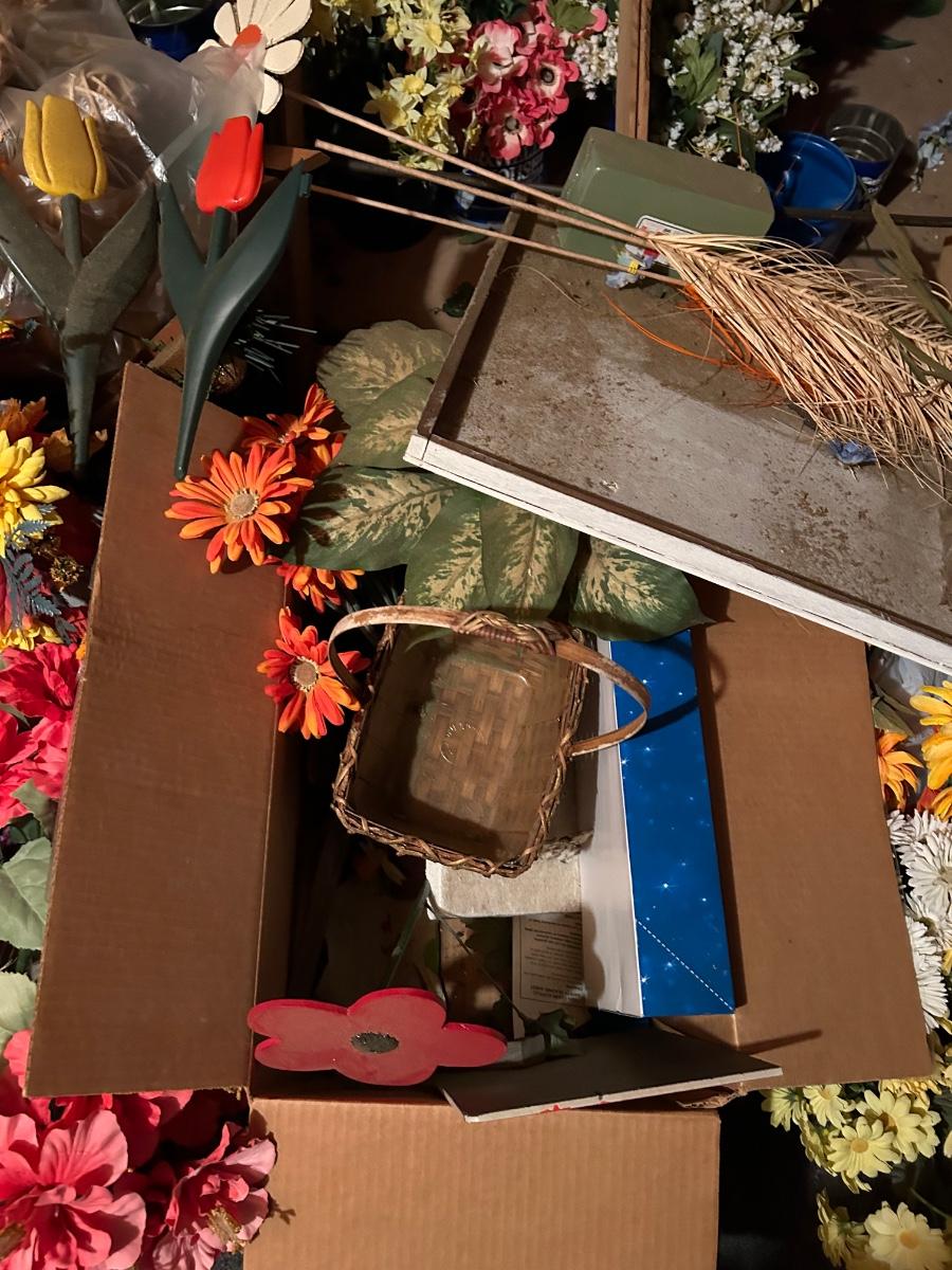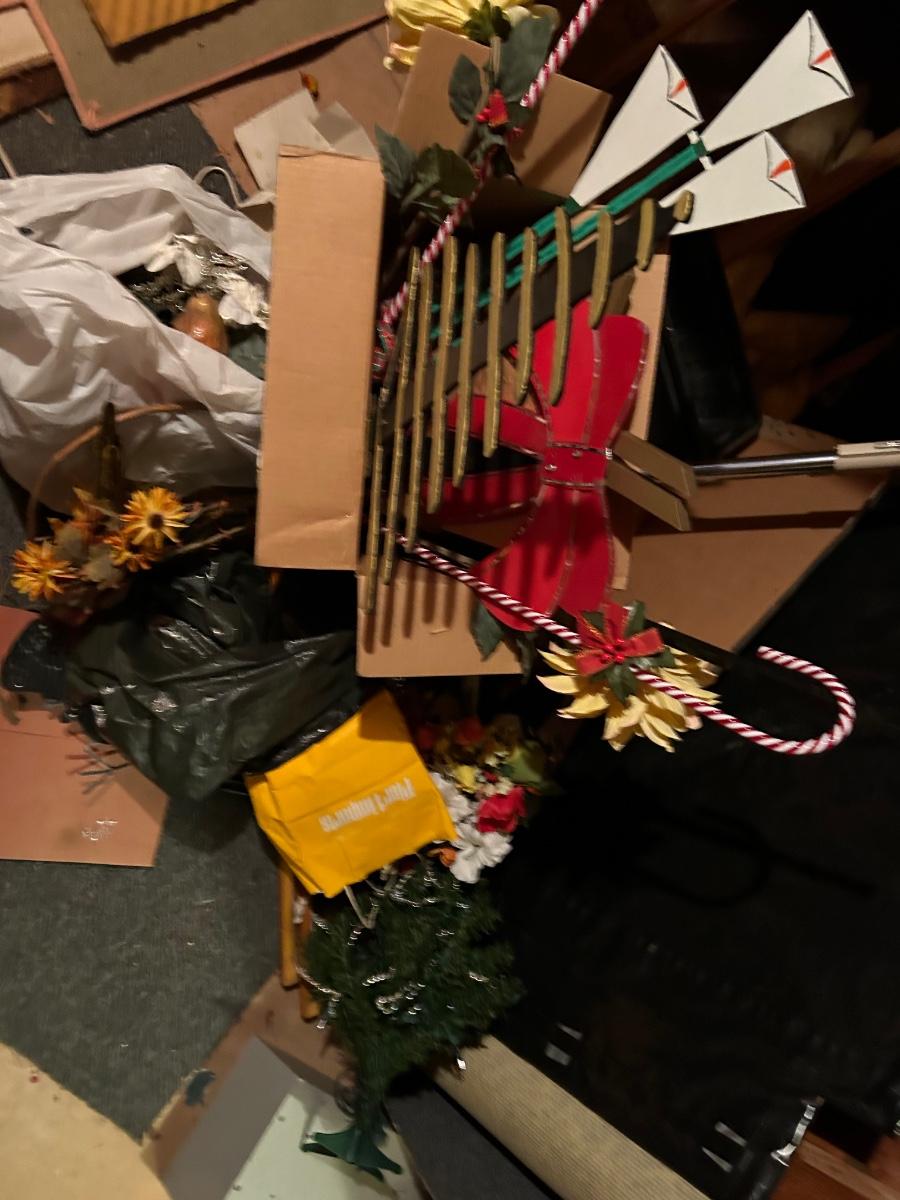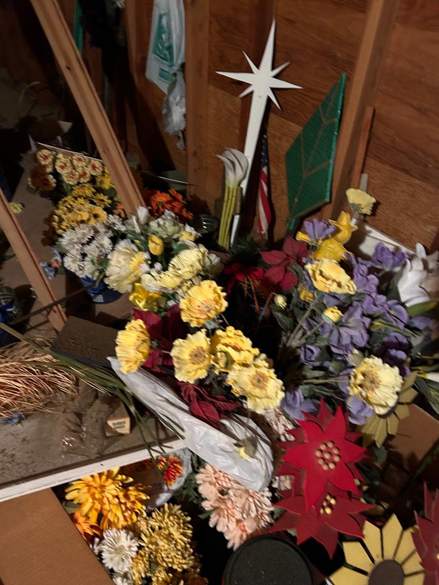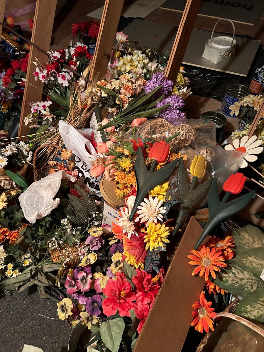 Lot includes all contents in attic. Silk flowers, holiday flowers, outdoor wood decor, Christmas decor and more.