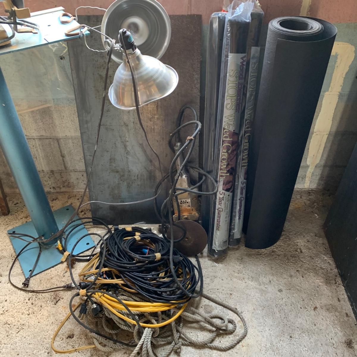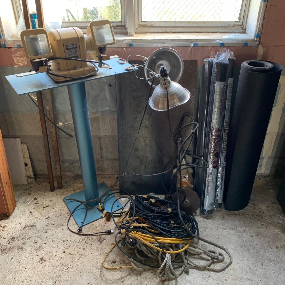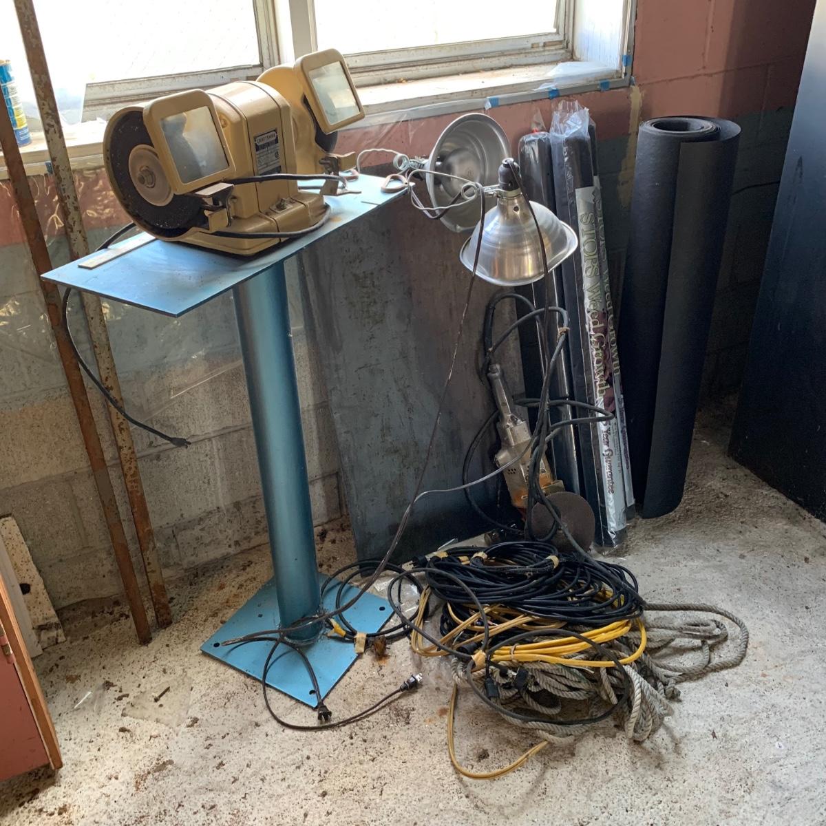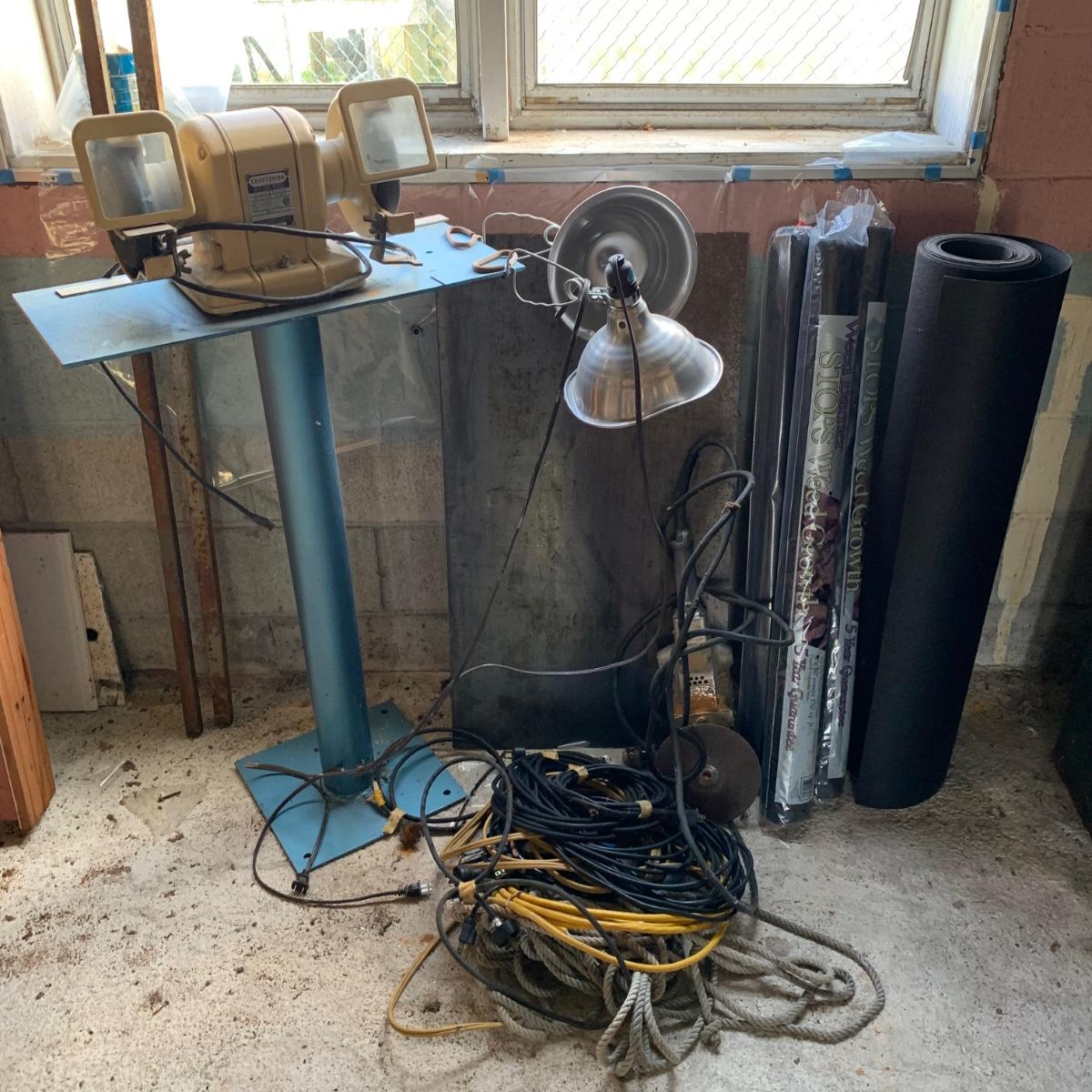 LOT 114R: Craftsman 1/4H.P. Grinder, Lights, Steel Plate, Weed Barriers & More