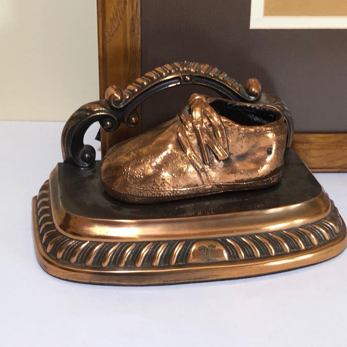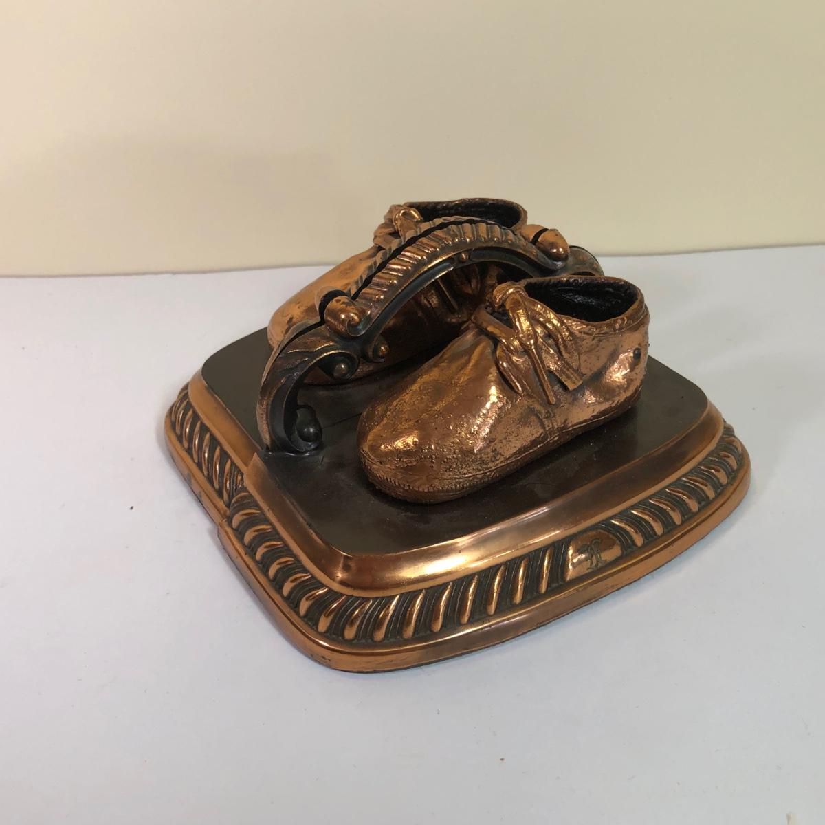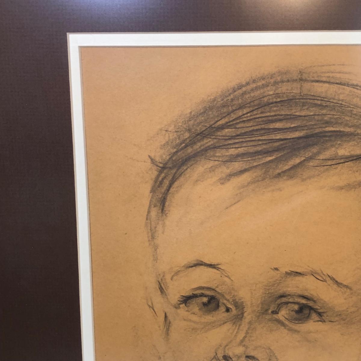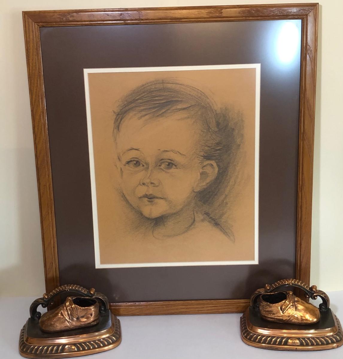 LOT 166M: Signed Baby Drawn Portrait & Bronze Baby Shoes Bookends