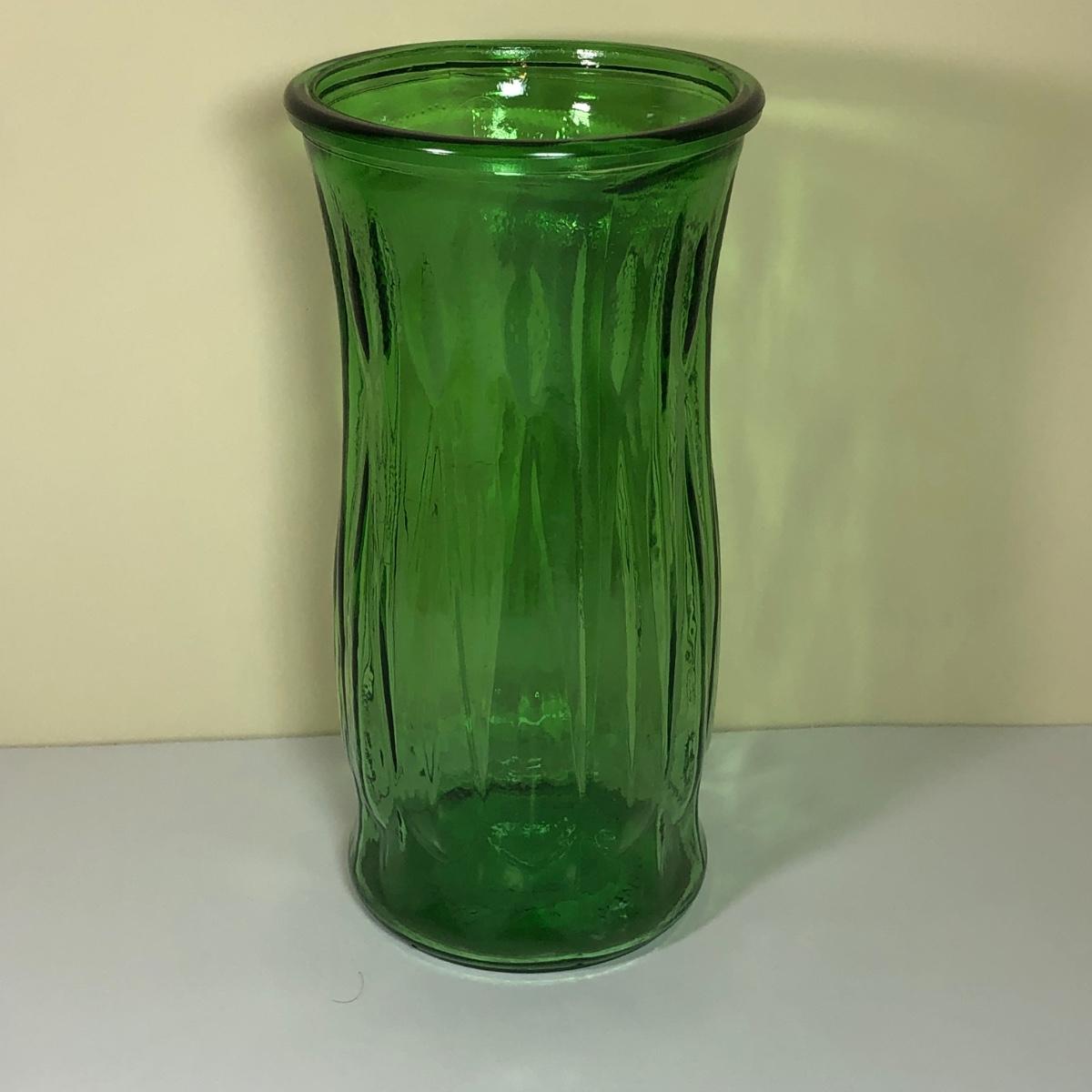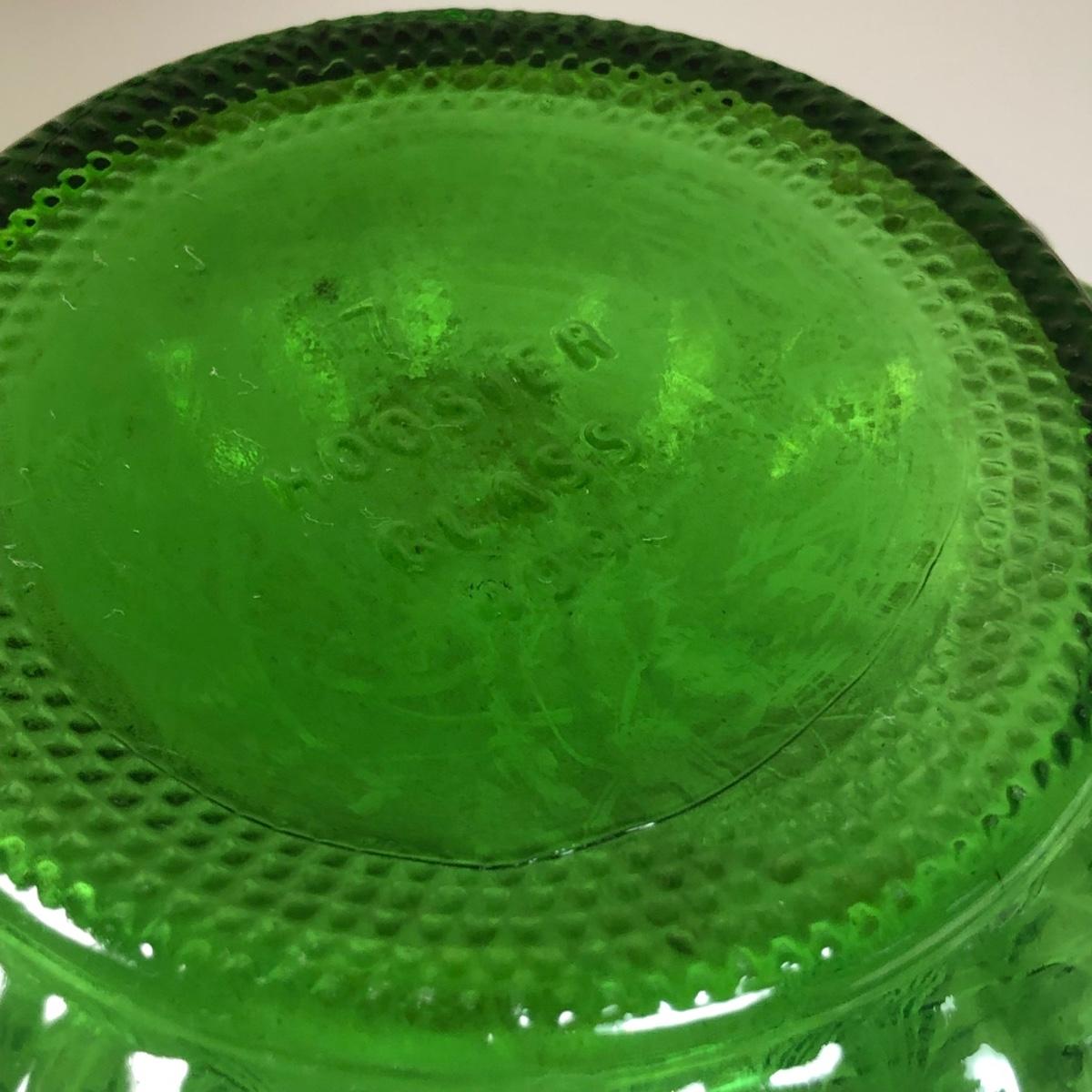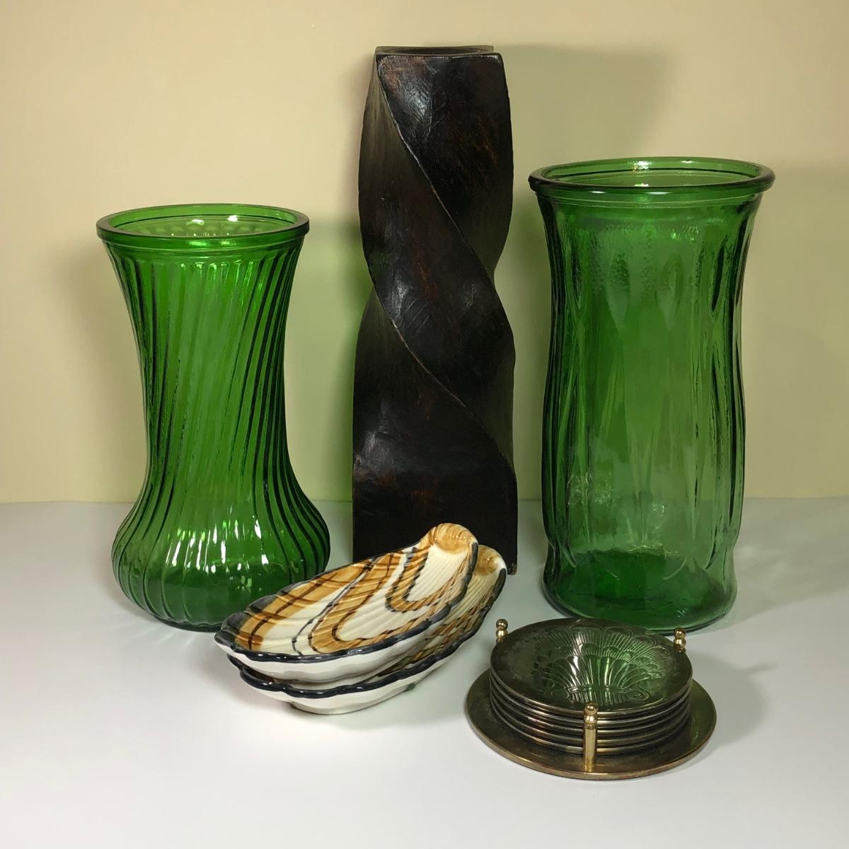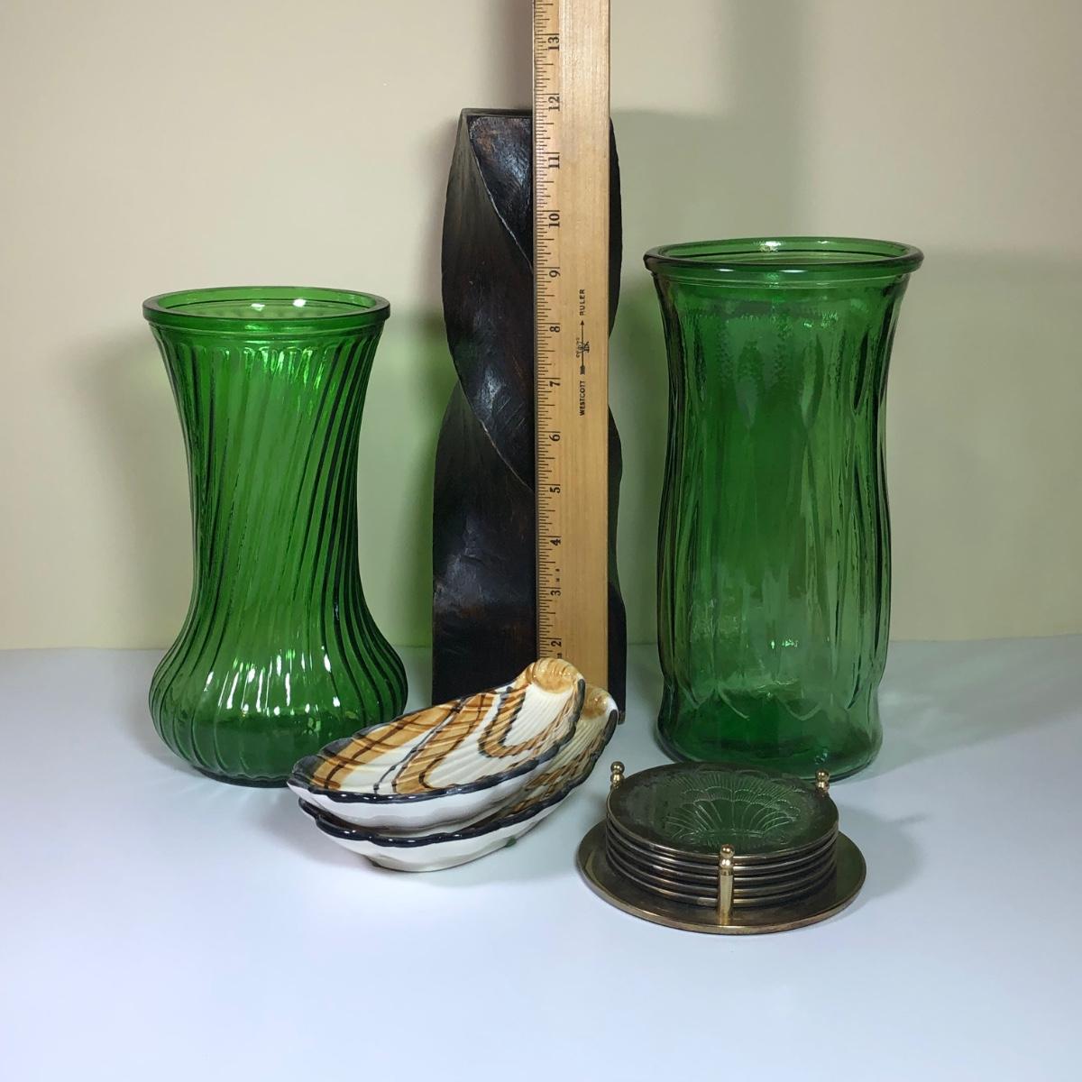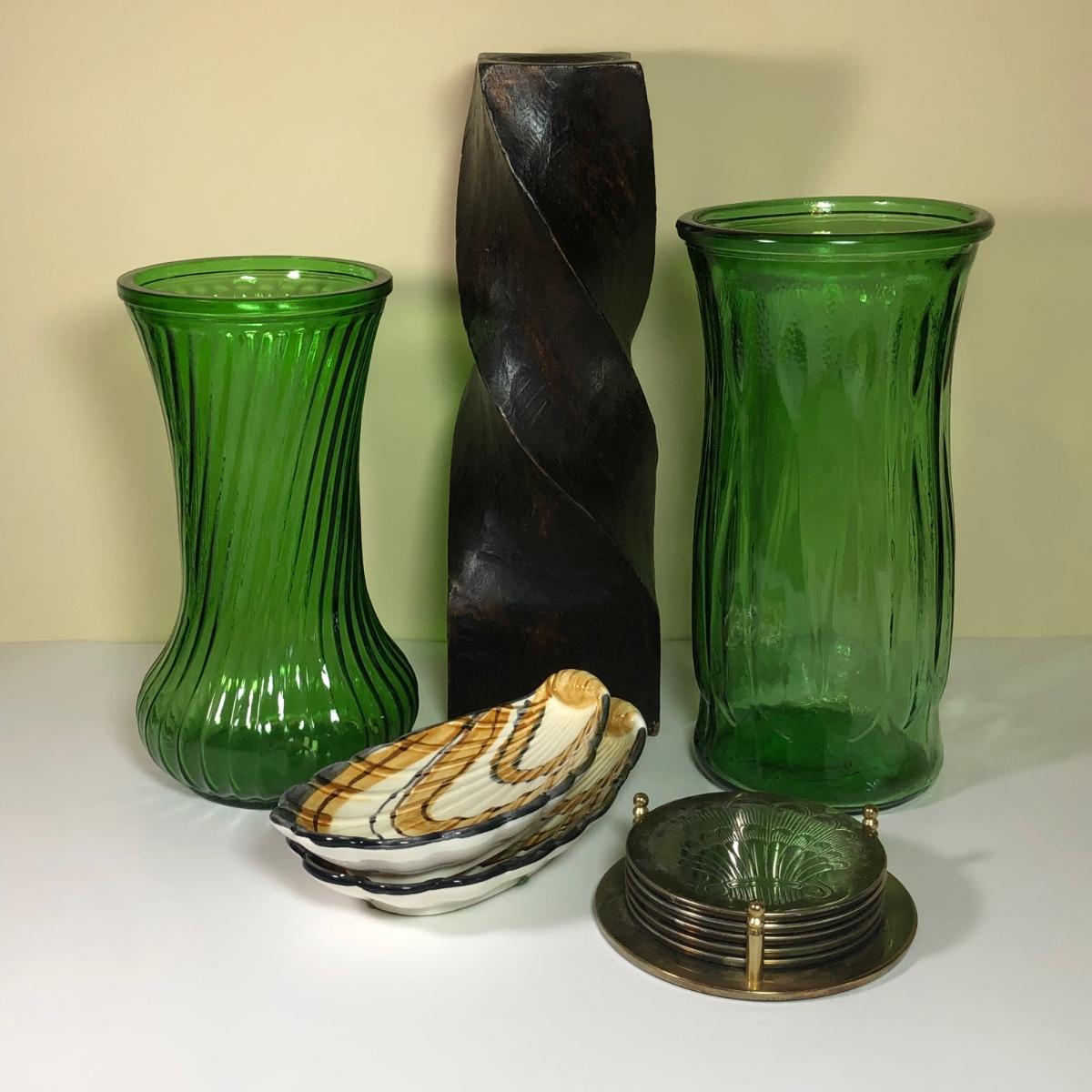 LOT 173M: E. O. Brsby Co Green Glass Vase, Hoosier Glass Green Vase, Wooden Candle Holder & More