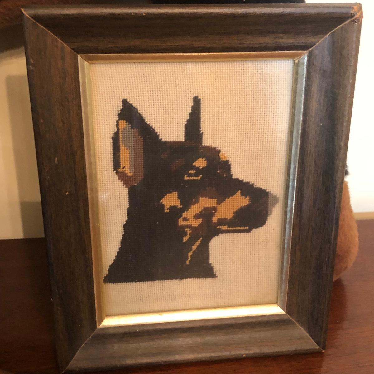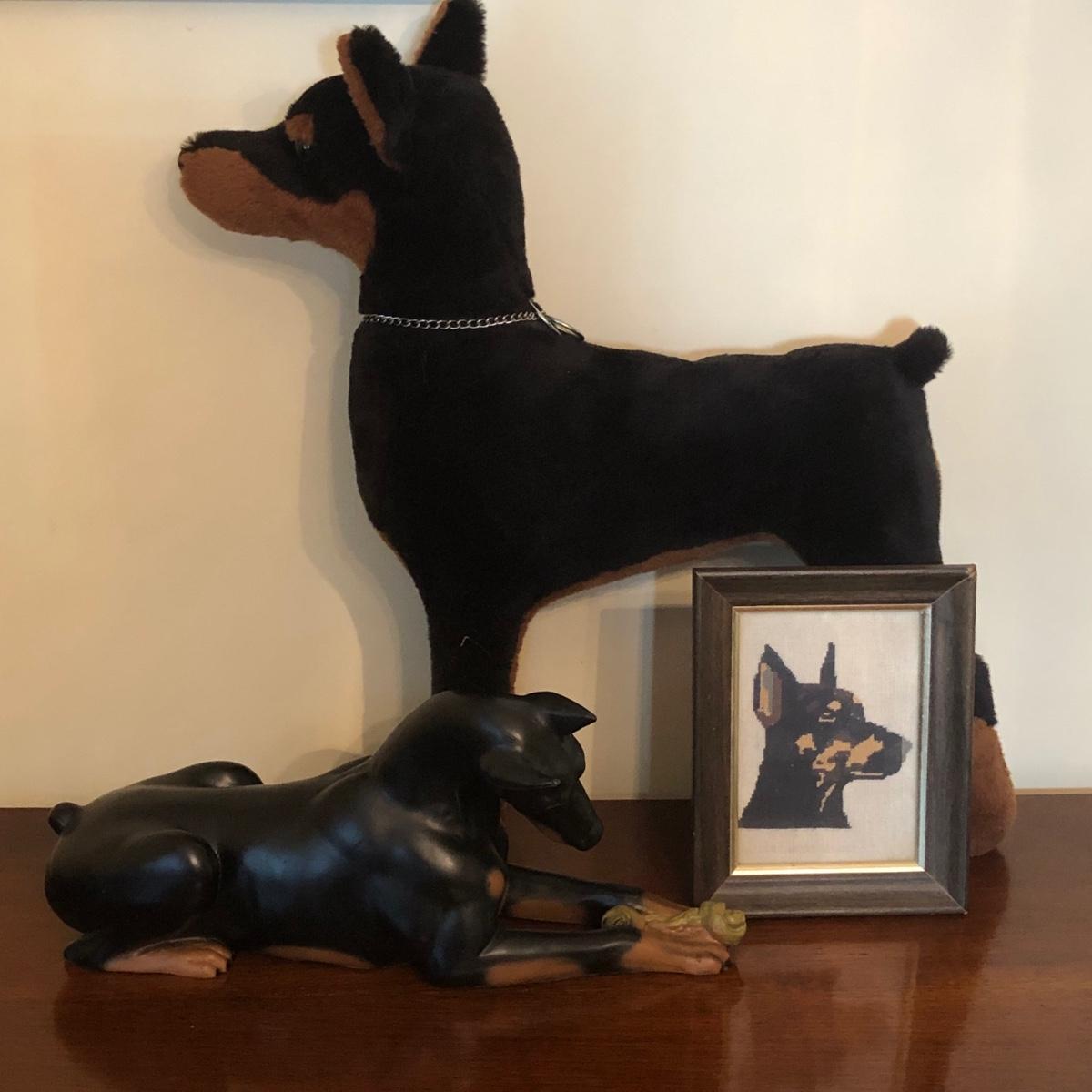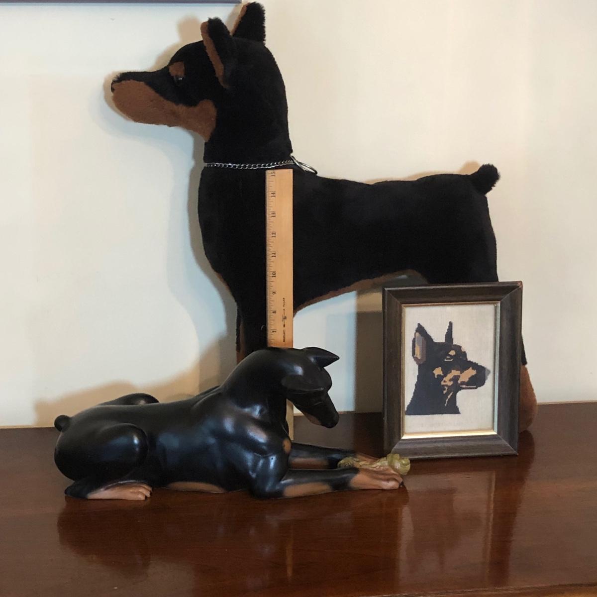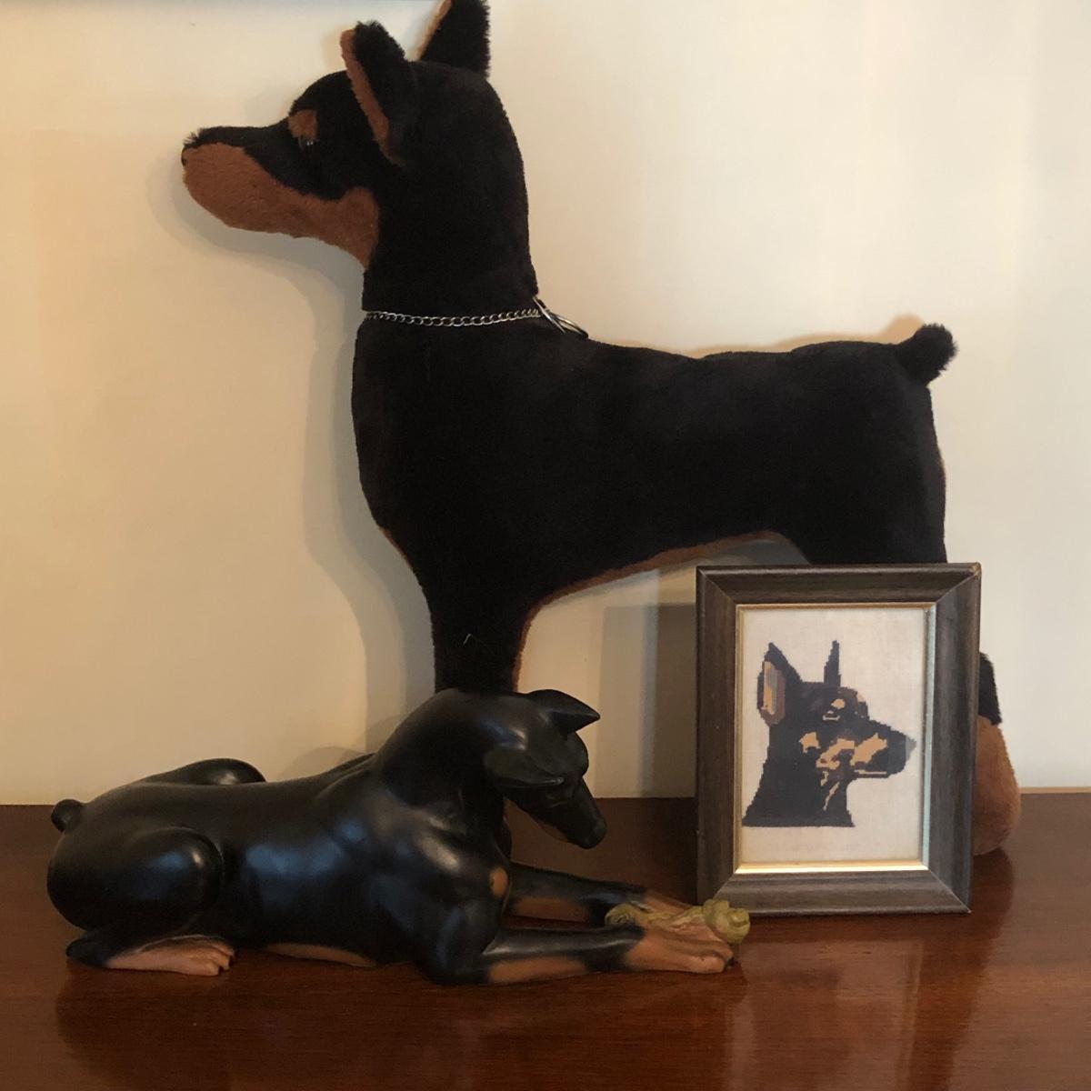 LOT 175M: Doberman Collection - Statue, Large Stuffed Animal & Framed Cross Stitch