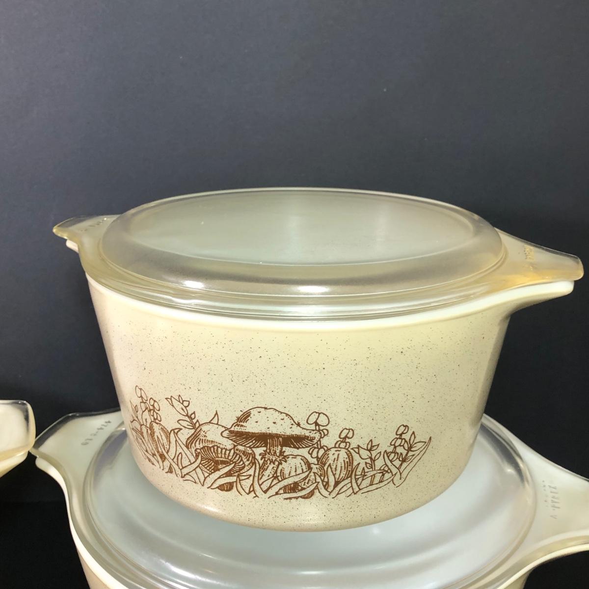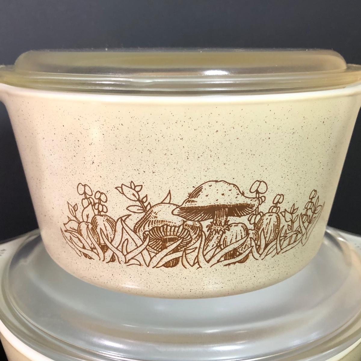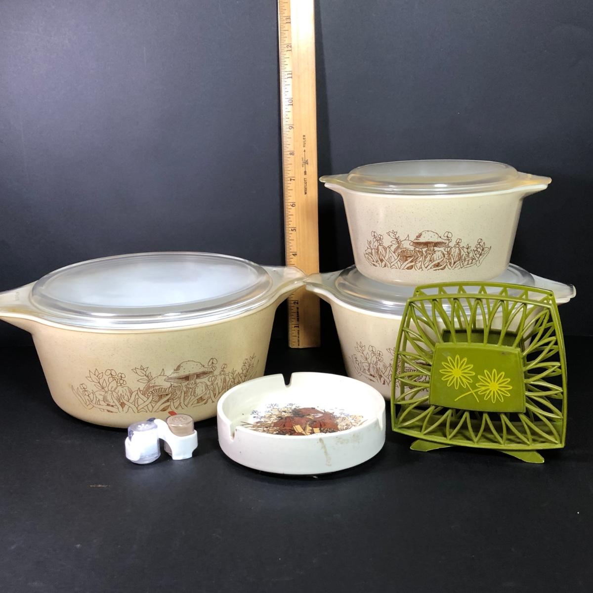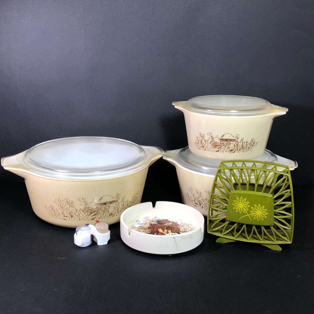 LOT 189: Corning Ware Fall Mushroom Pattern Baking Dishes w/ Matching Pyrex Lids, Otagiri Mushroom Ash Tray & More