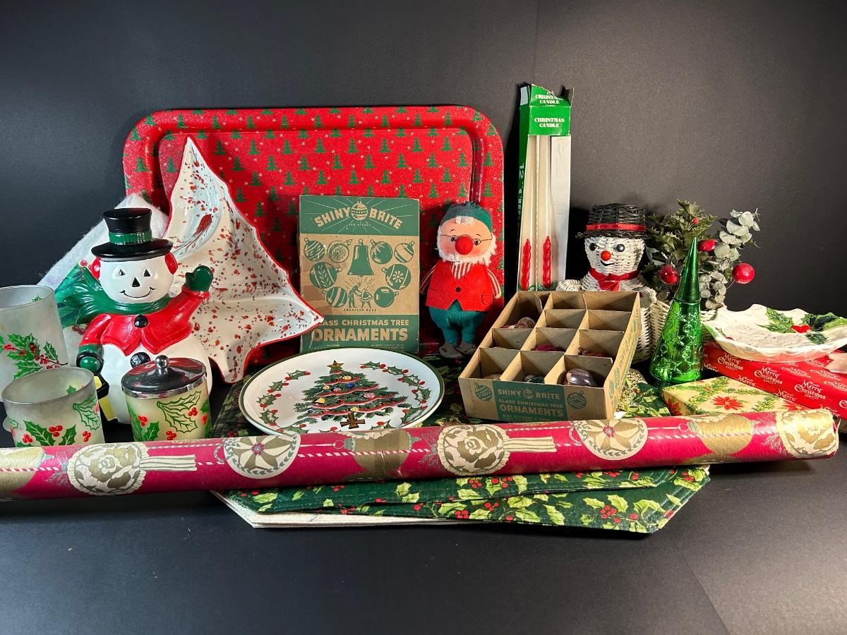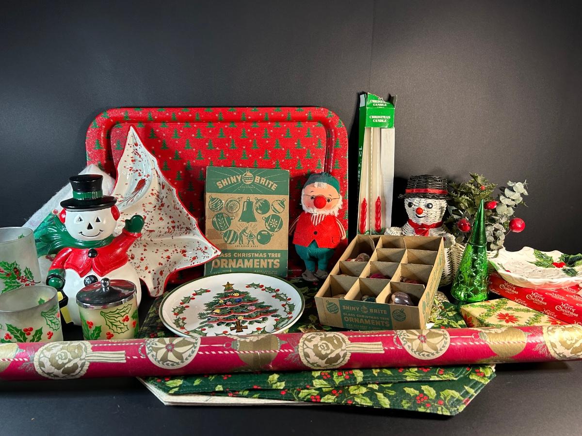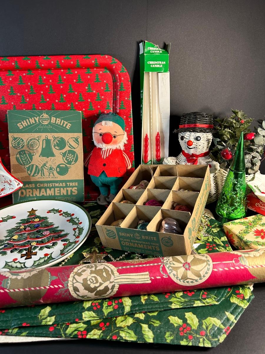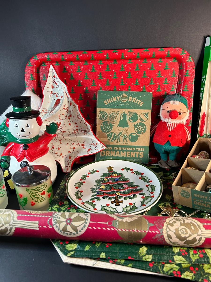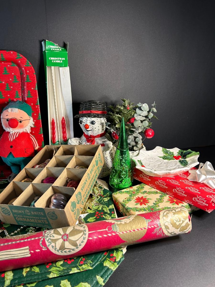 Vintage ornaments, candles, wrapping paper, tray, Lefton plate and holly candy dish, elf and more.
