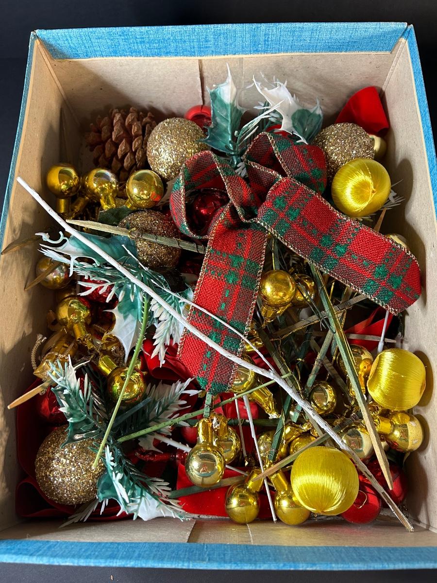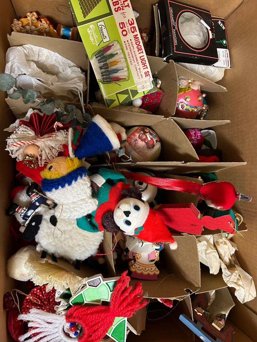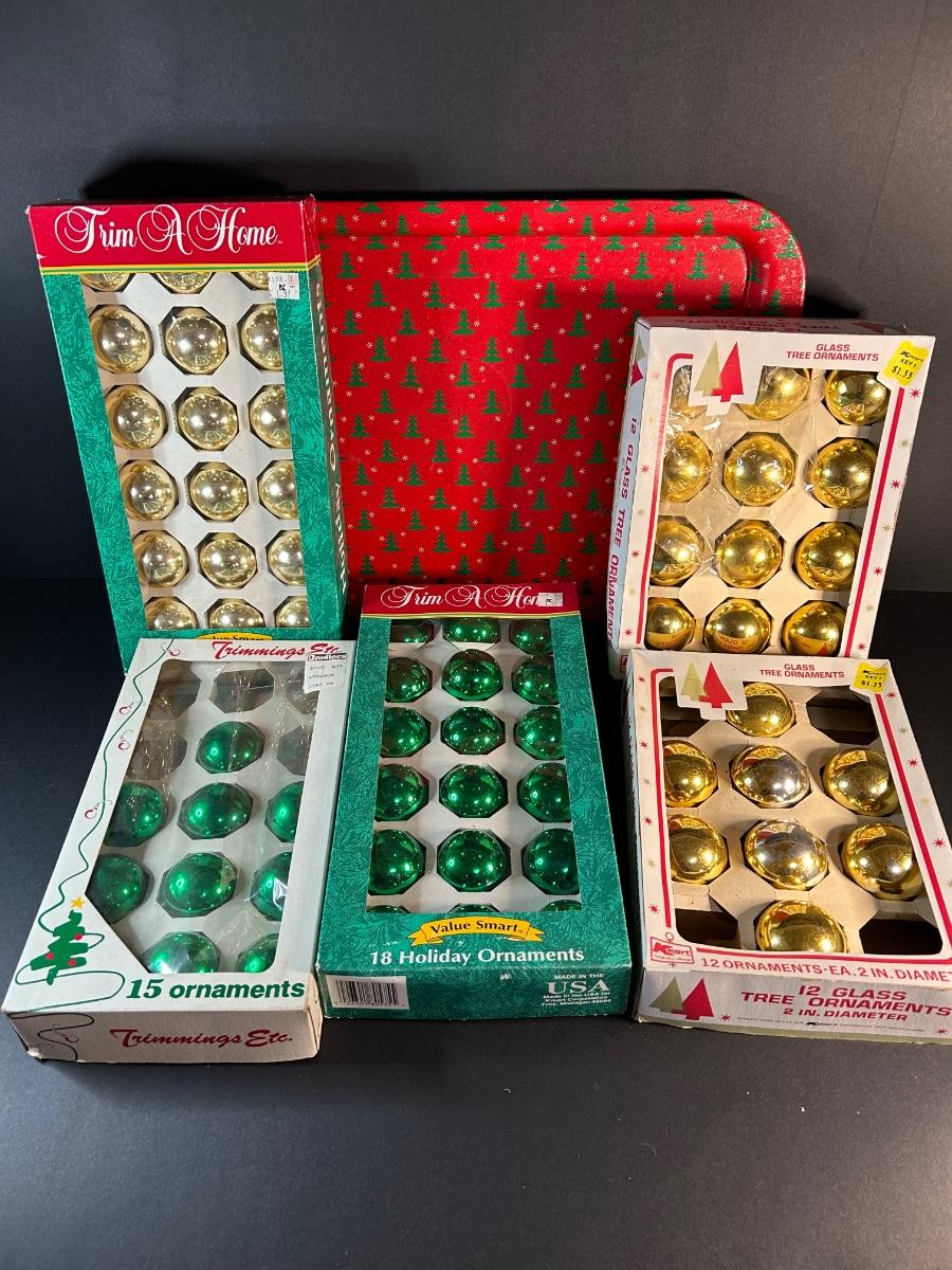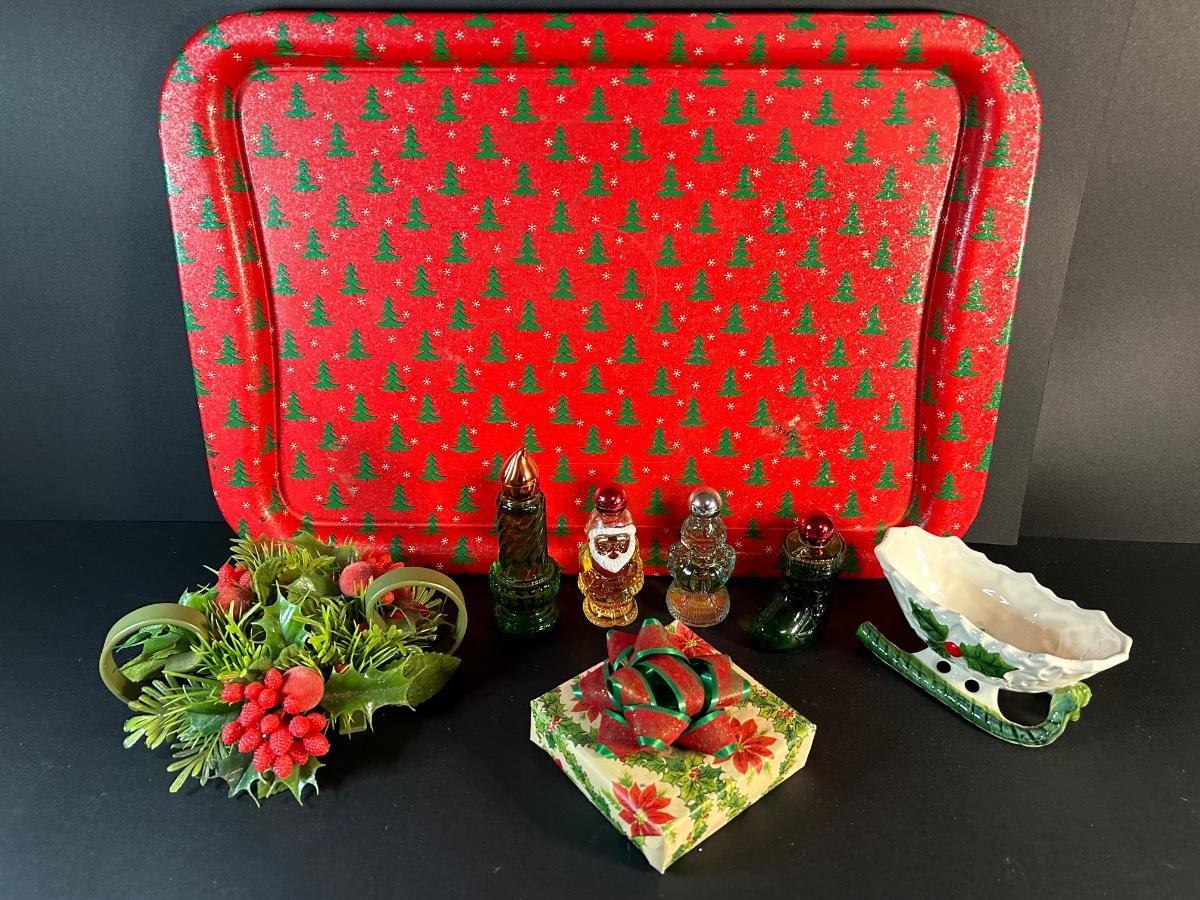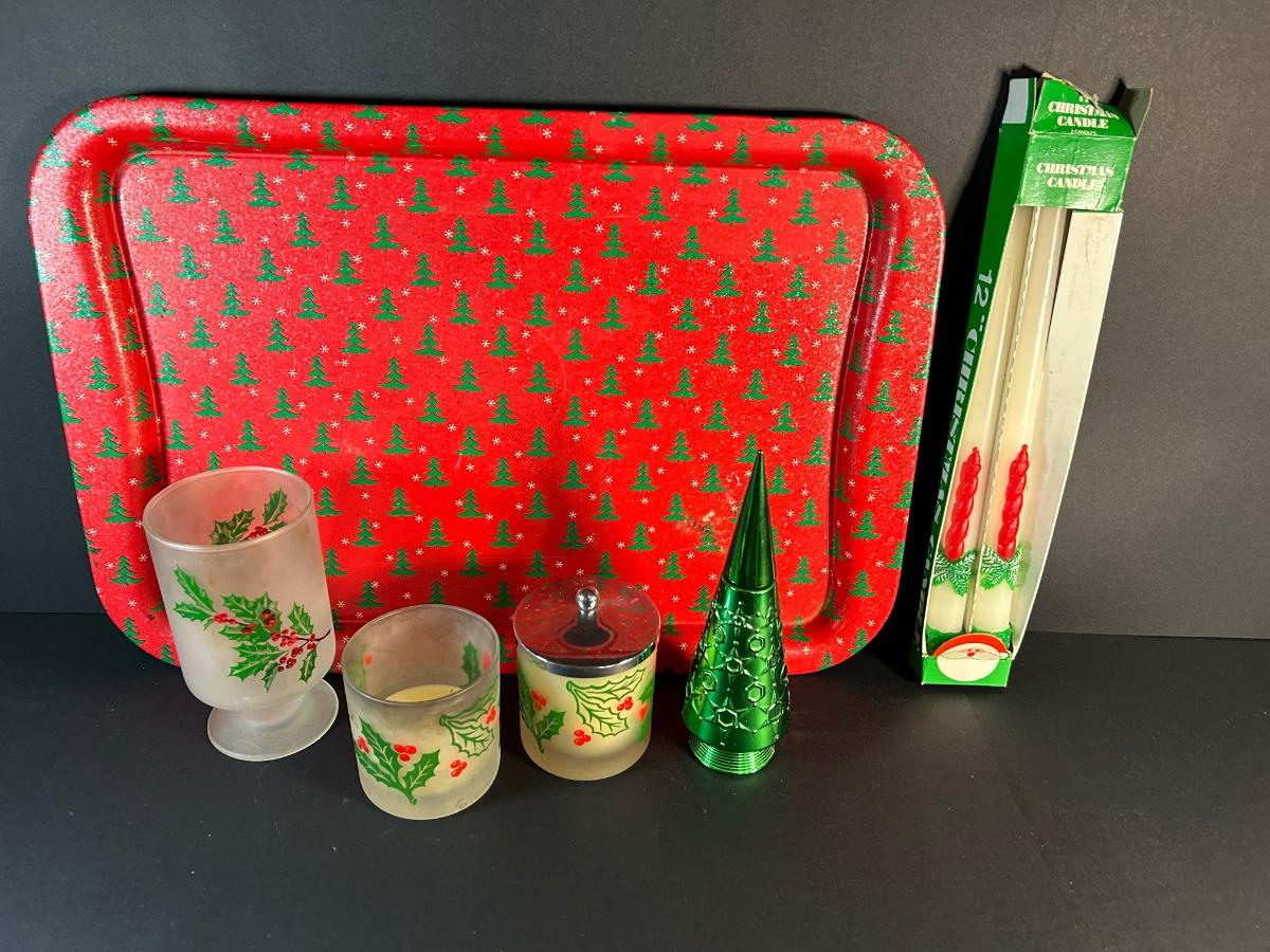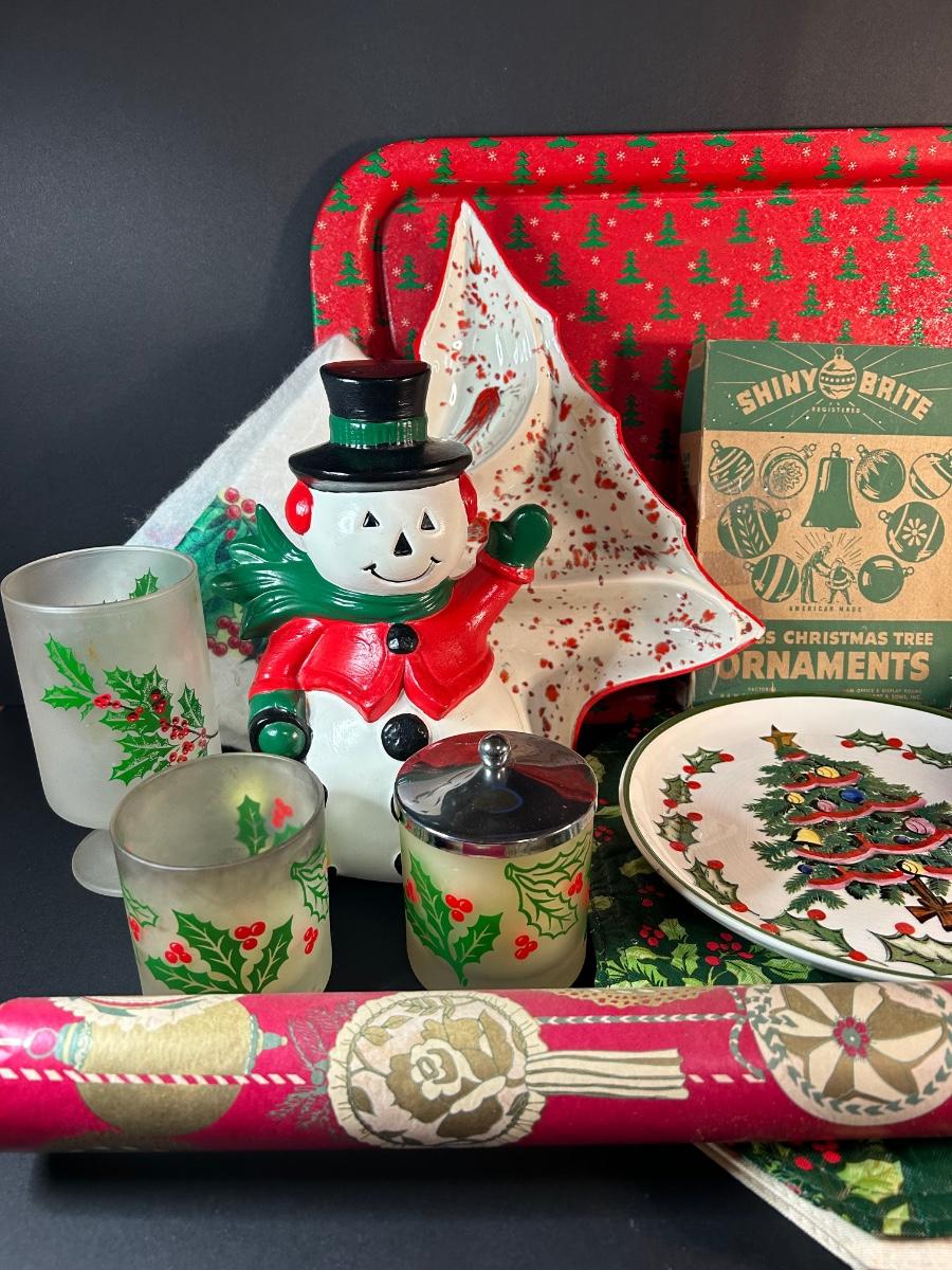 Vintage ornaments, candles, wrapping paper, tray, Lefton plate and holly candy dish, elf and more.