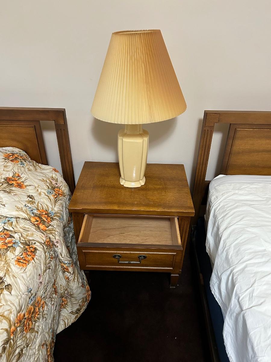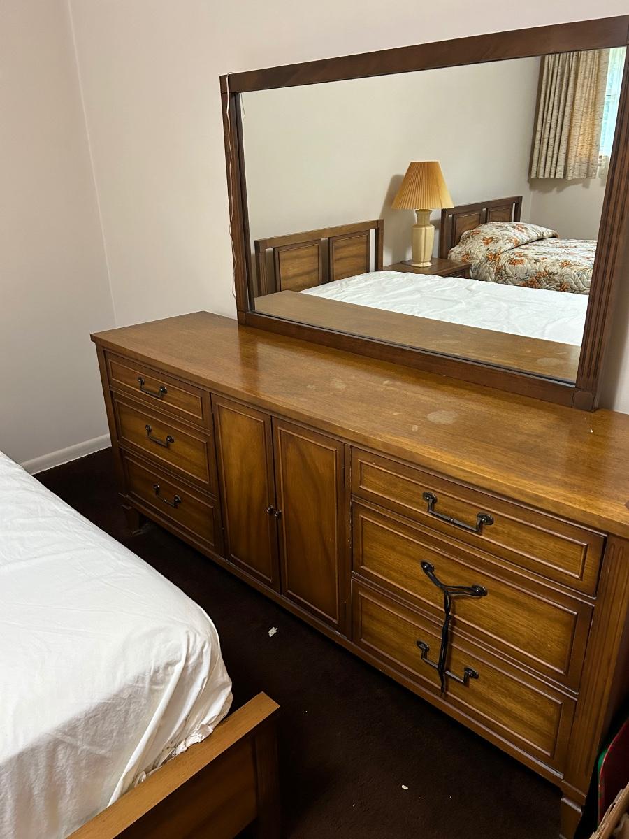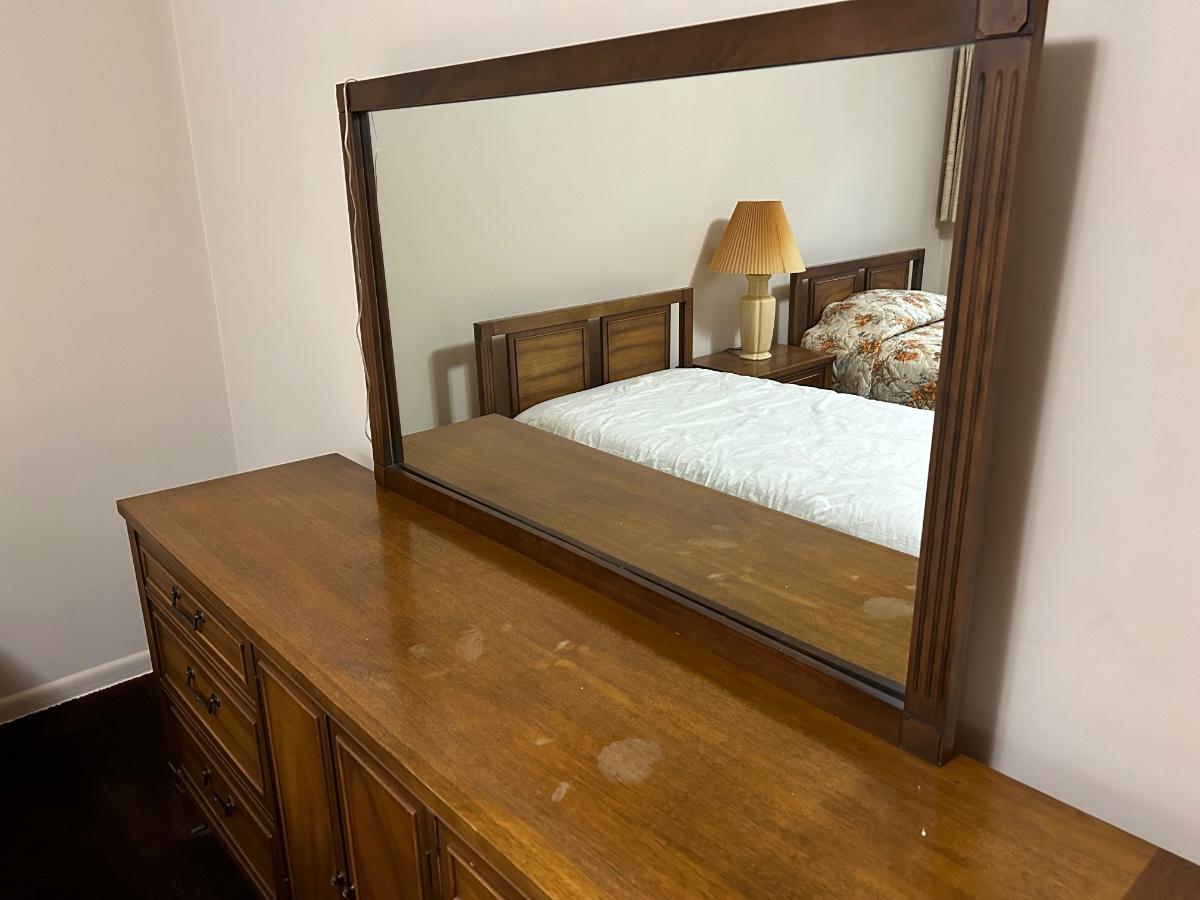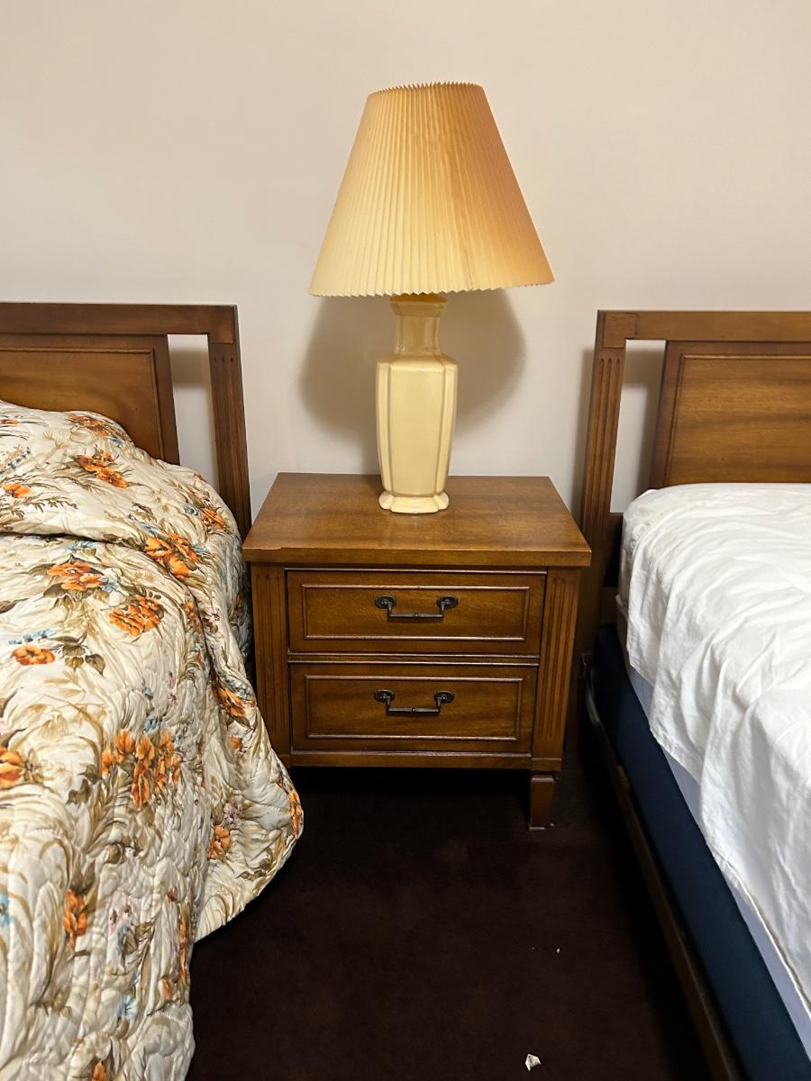 Six Pieces of bedroom furniture, Two twin beds, Dresser with mirror, nightstand and lamp. lot incudes everything shown in pictures.