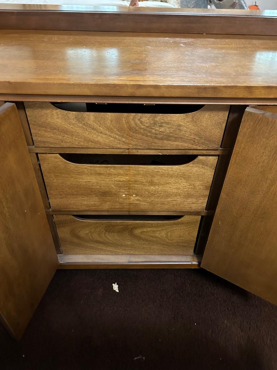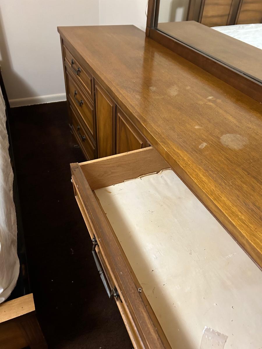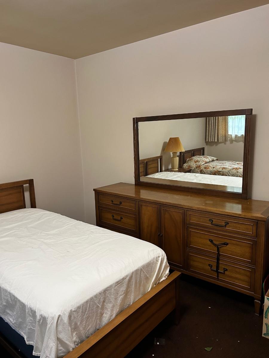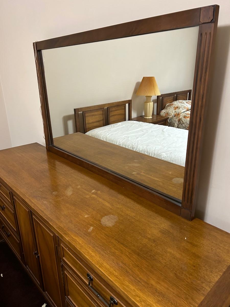 Six Pieces of bedroom furniture, Two twin beds, Dresser with mirror, nightstand and lamp. lot incudes everything shown in pictures.