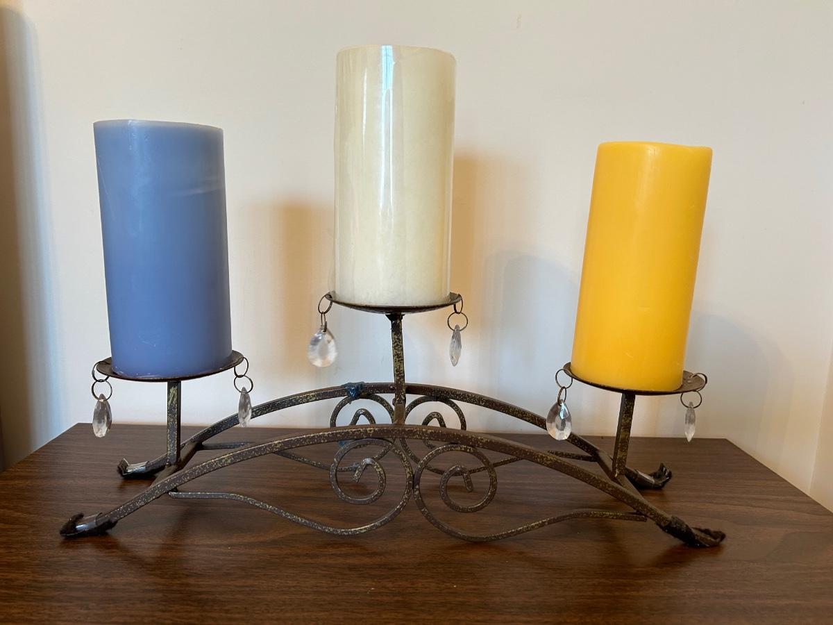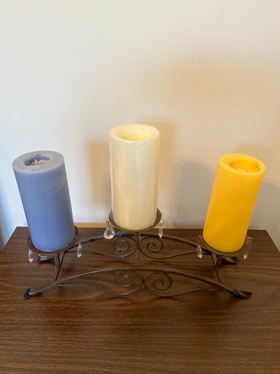 Unique vintage dolphin lamp. three pillar candles on metal stand