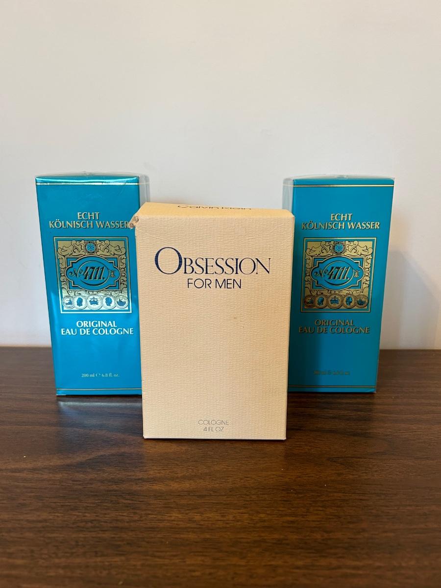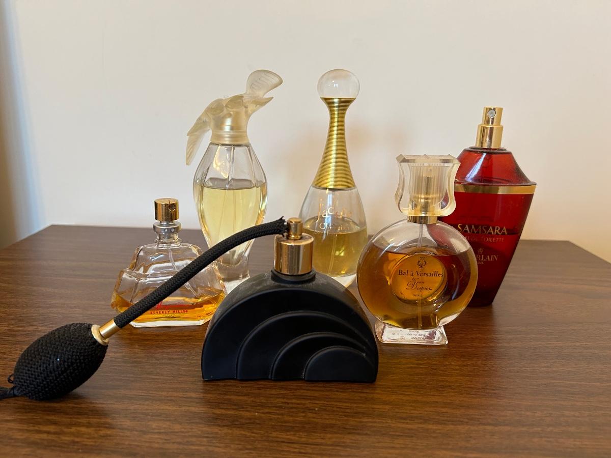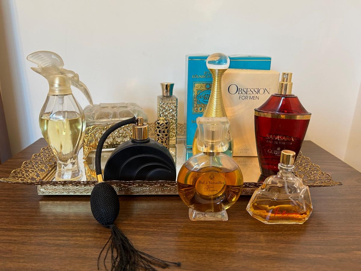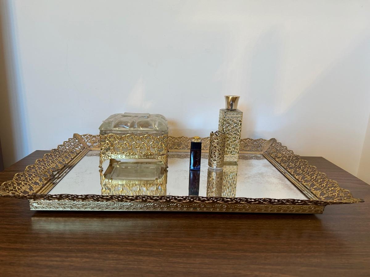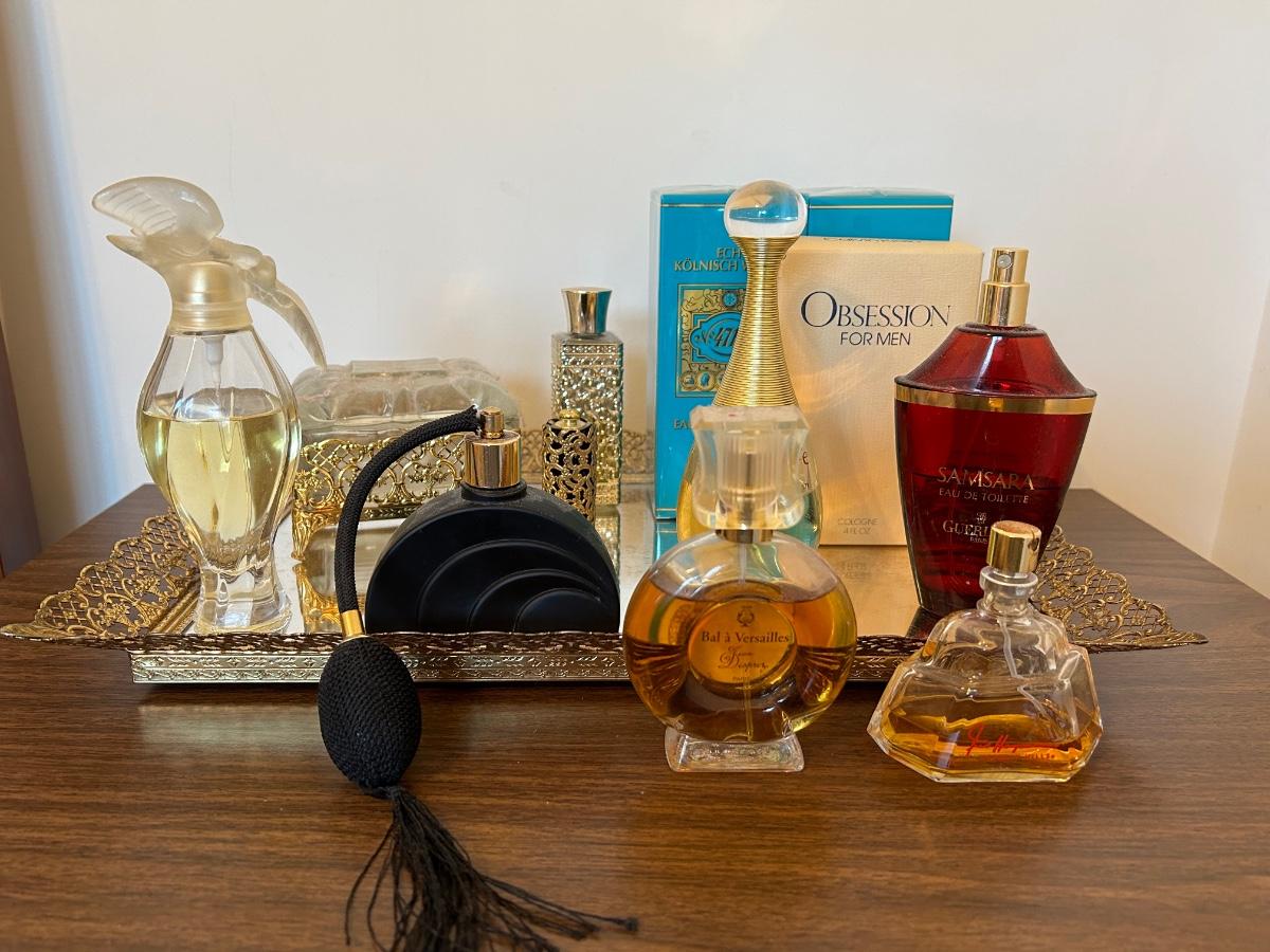 Variety of perfumes and cologne on a vintage vanity tray and vanity accessories.
