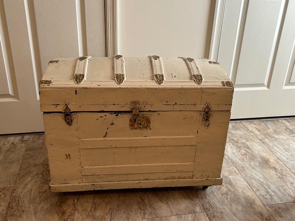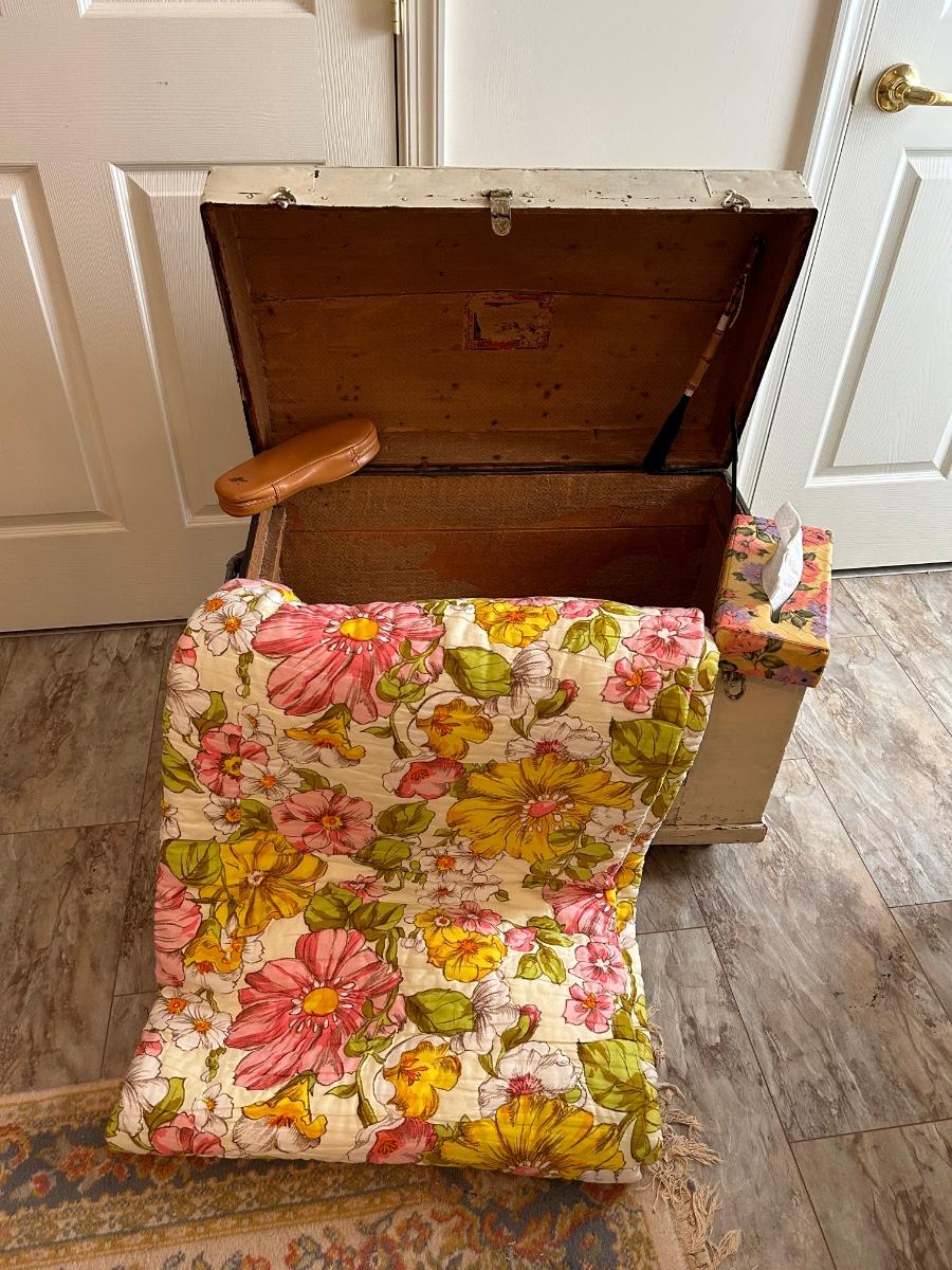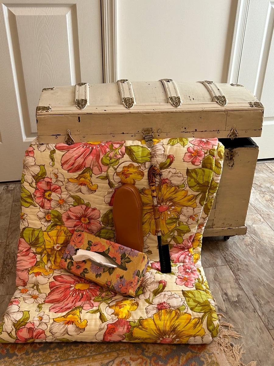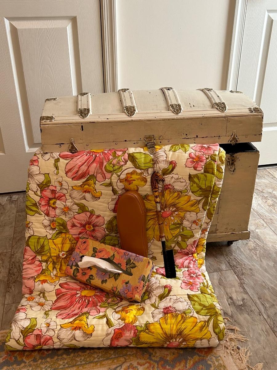 Trunk is on wheels and measures 30"x20"24". Vintage bedspread is in great used condition. Vintage floral tissue box, leather slippers and horse shoehorn.