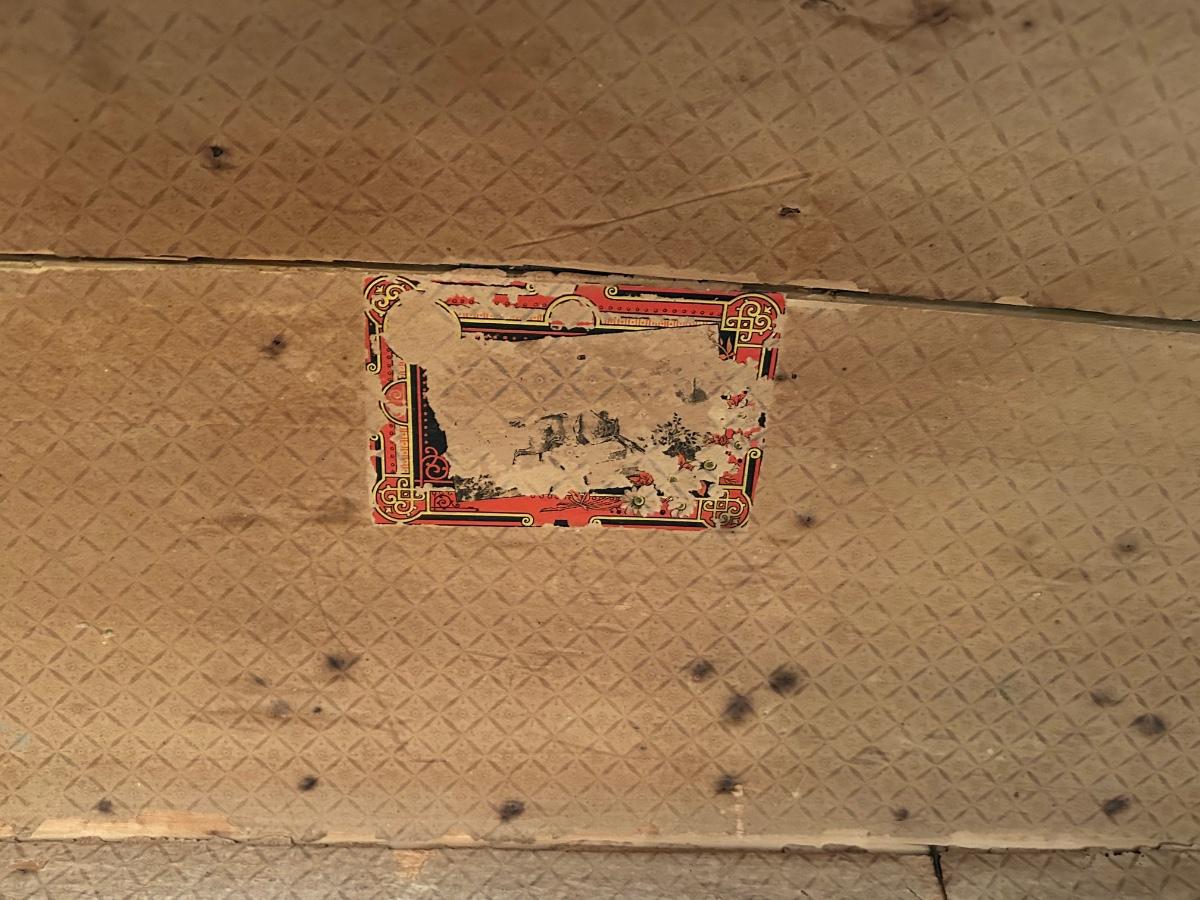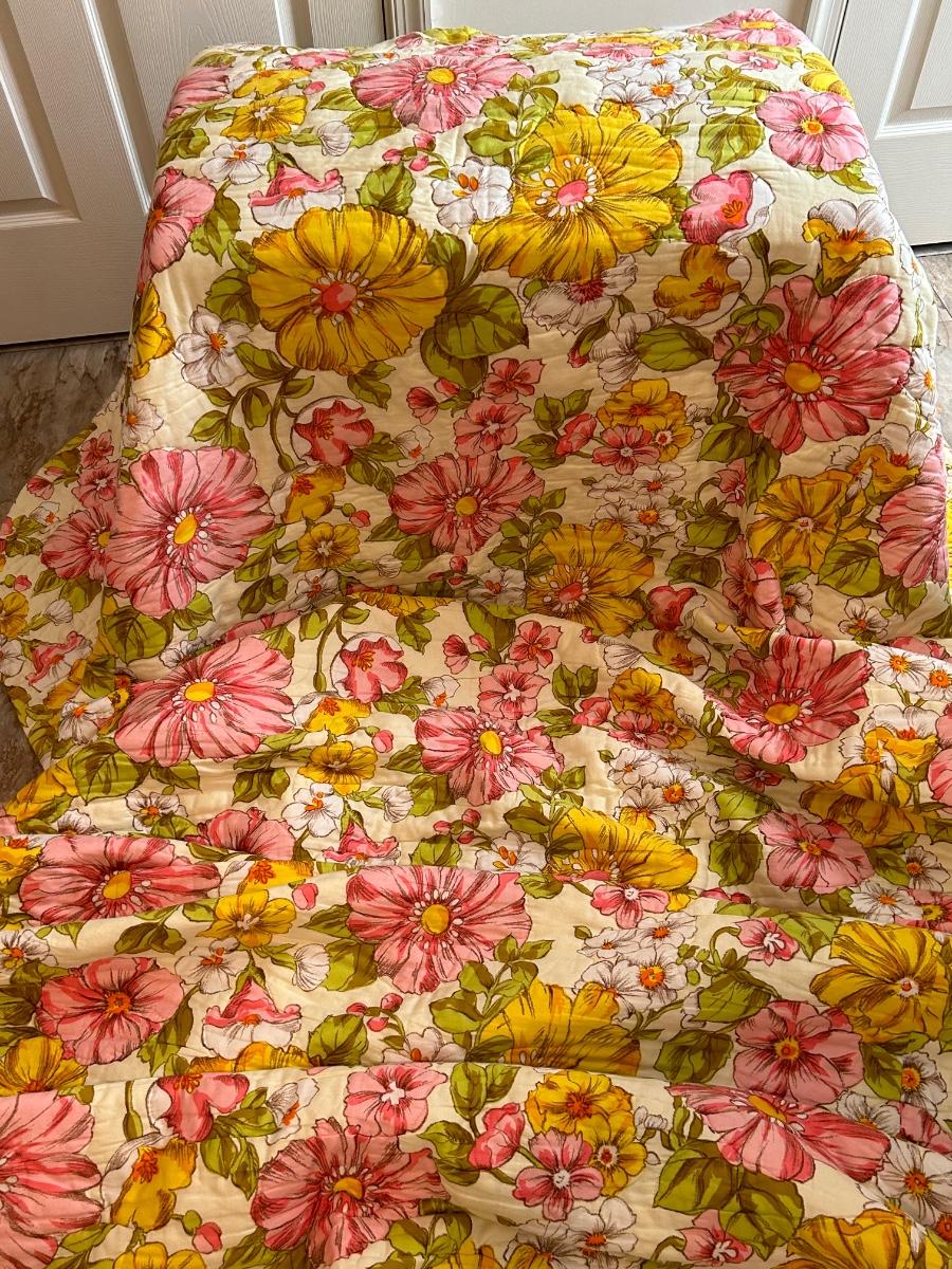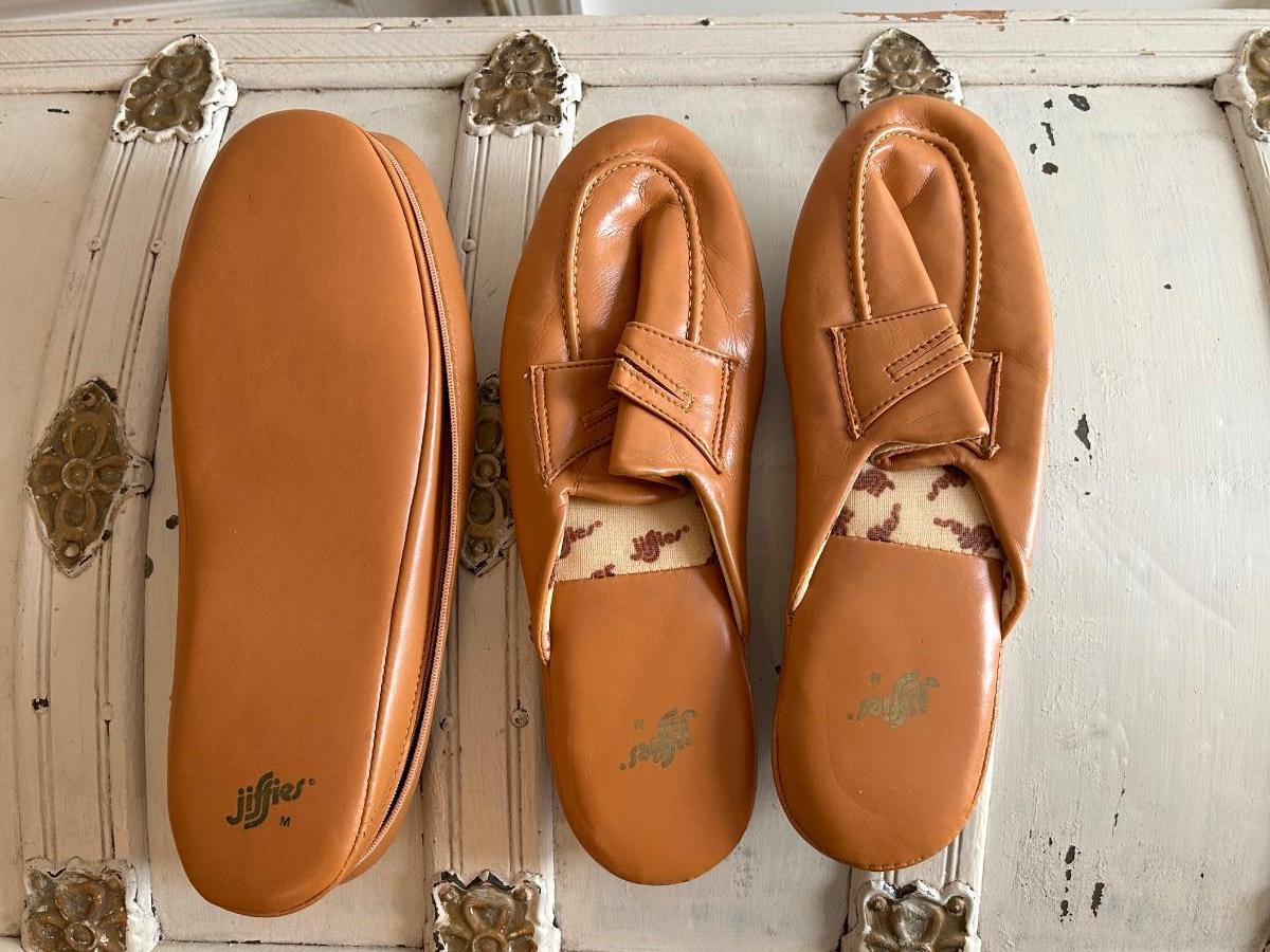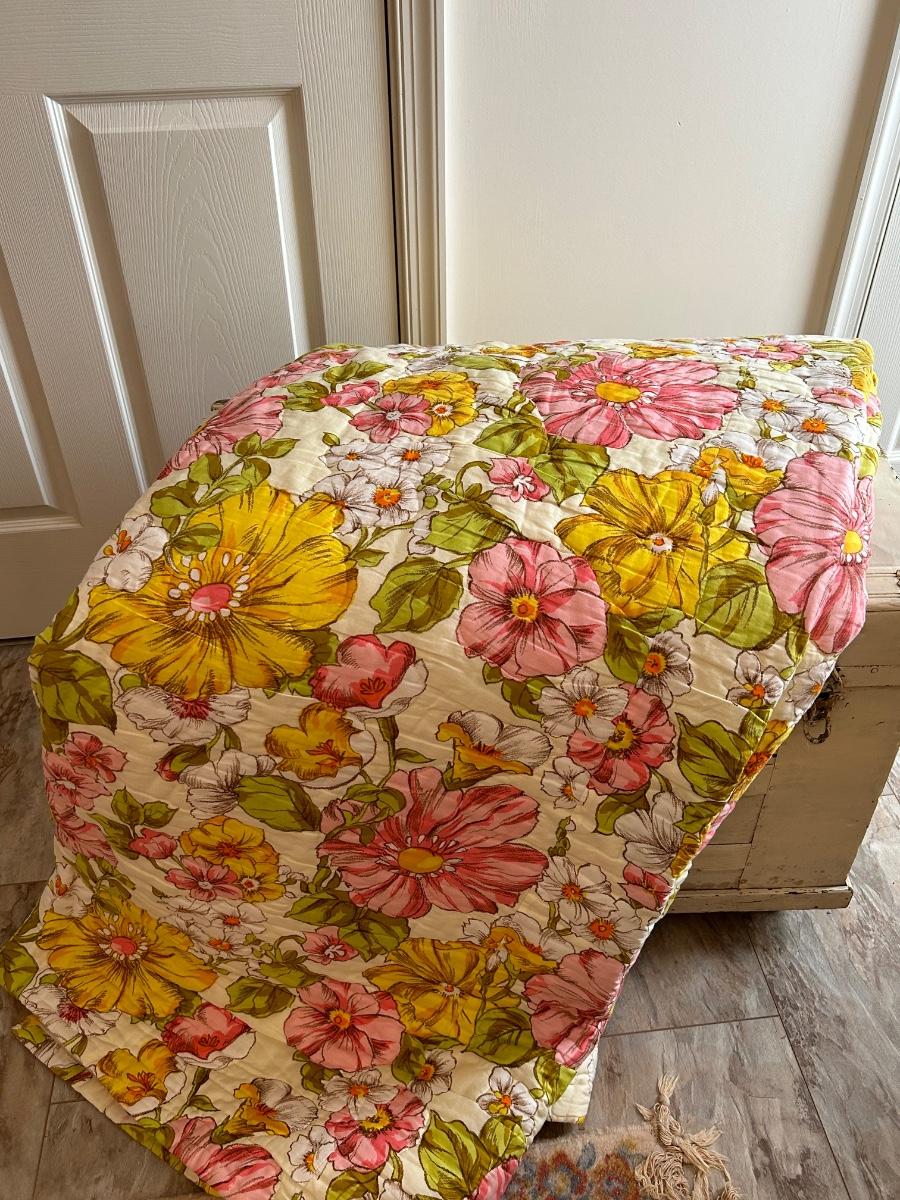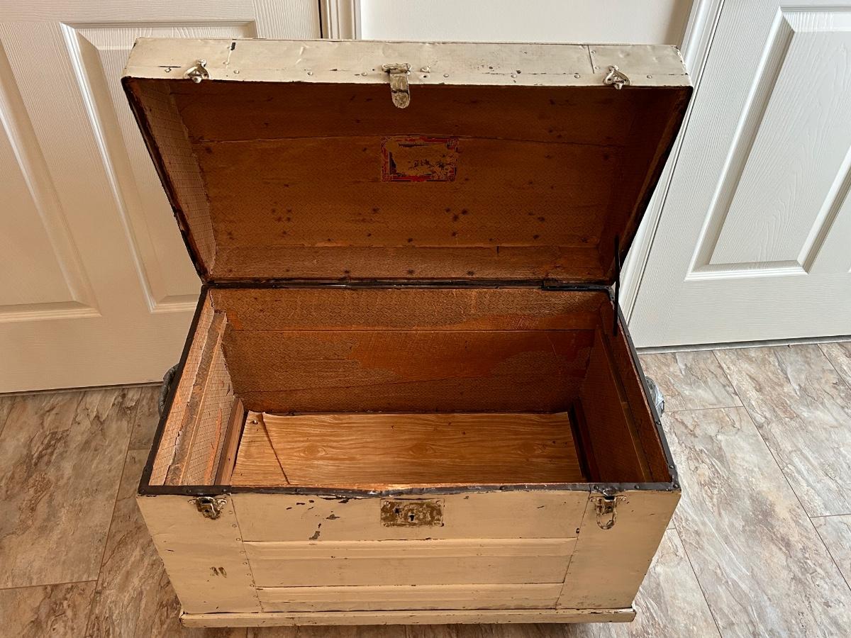 Trunk is on wheels and measures 30"x20"24". Vintage bedspread is in great used condition. Vintage floral tissue box, leather slippers and horse shoehorn.