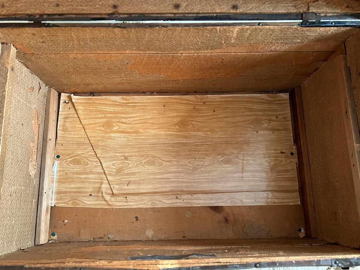 LOT 23C: Vintage Trunk Filled With MCM Bedspread, Tissue Box, Slippers And Shoe Horn