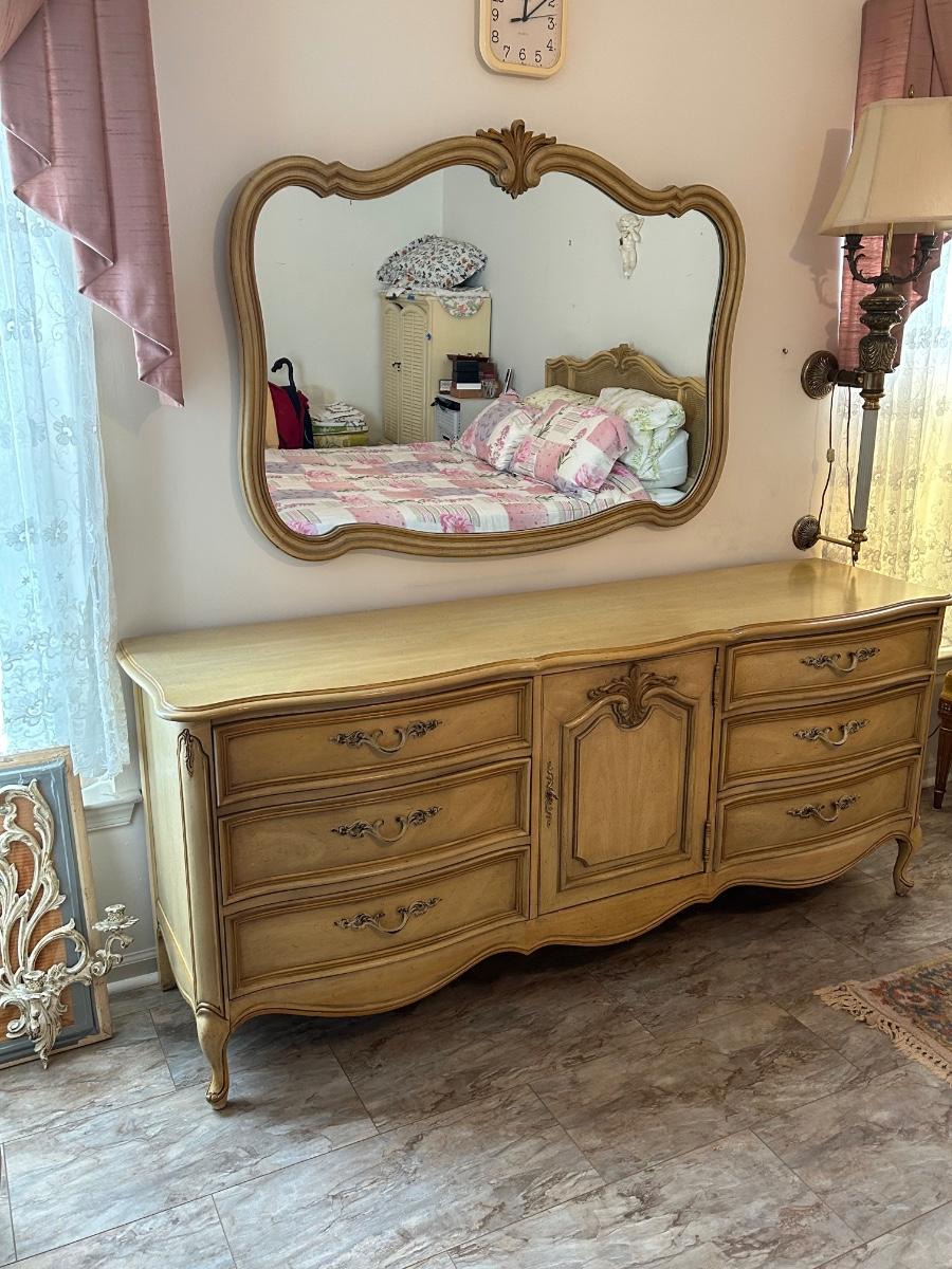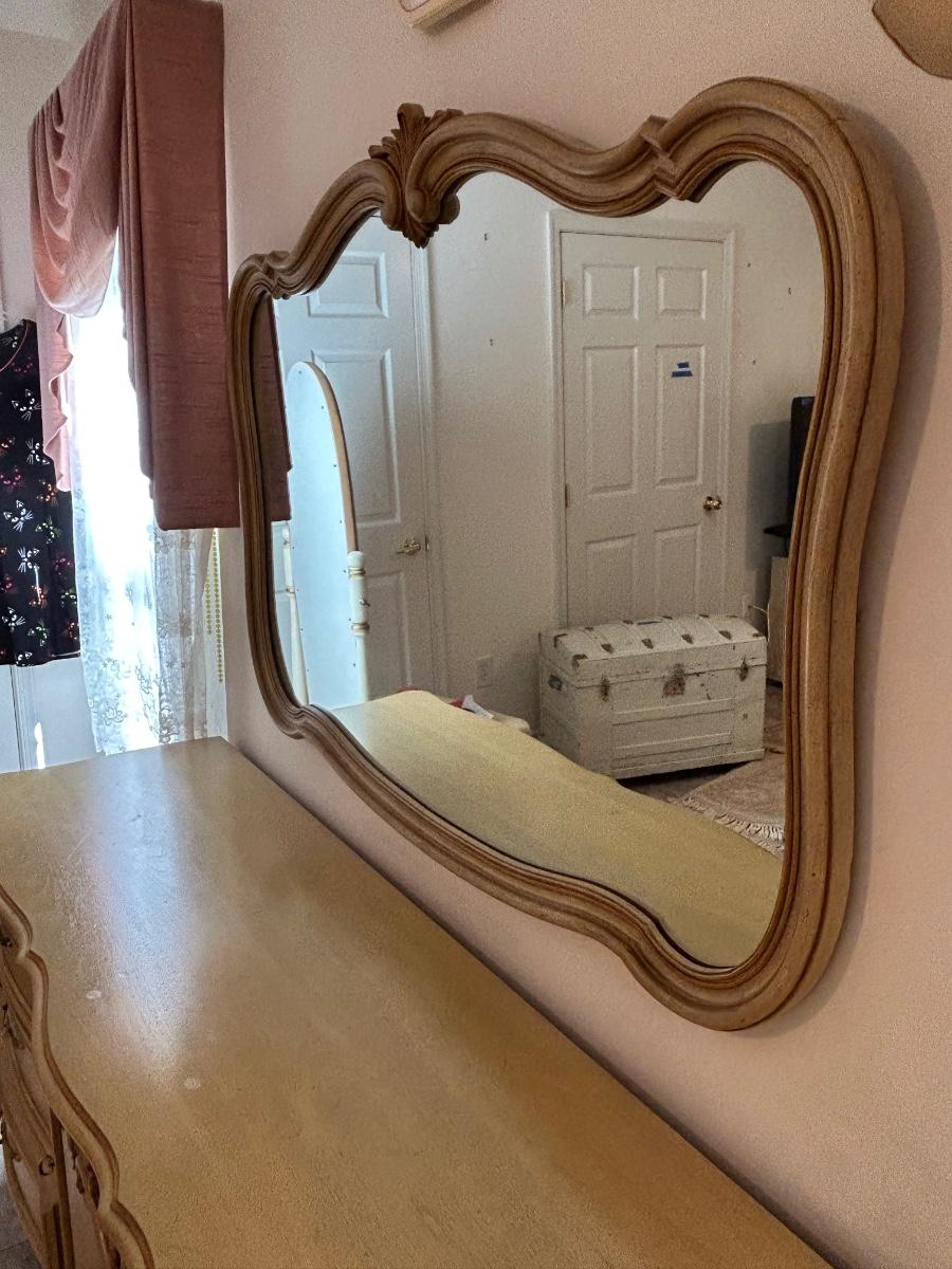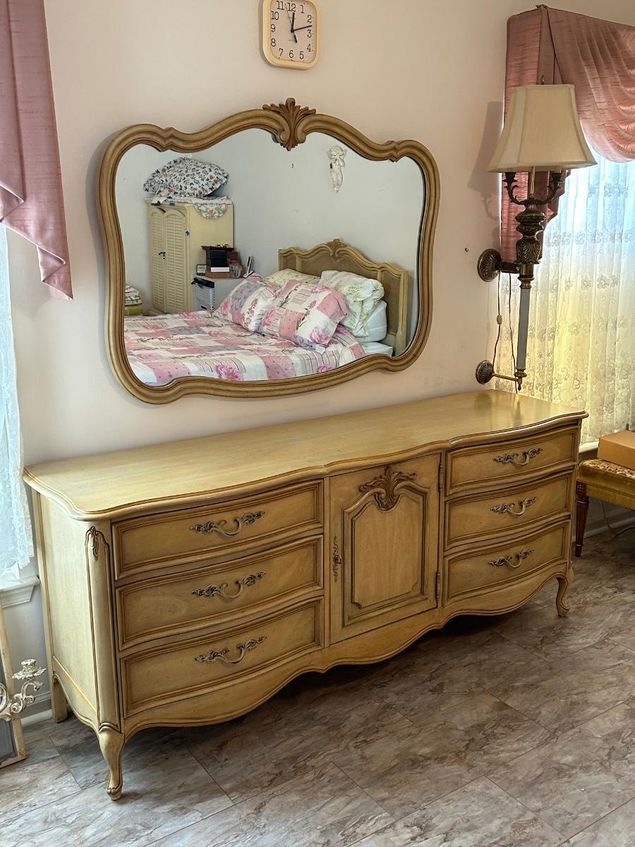 Dresser 72"x21"x32". Mirror 48"x34" and Headboard 30"x22".