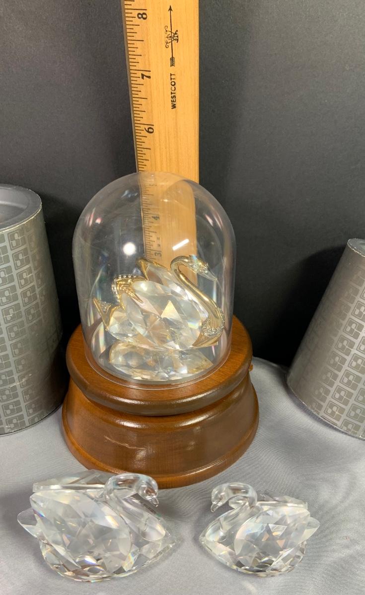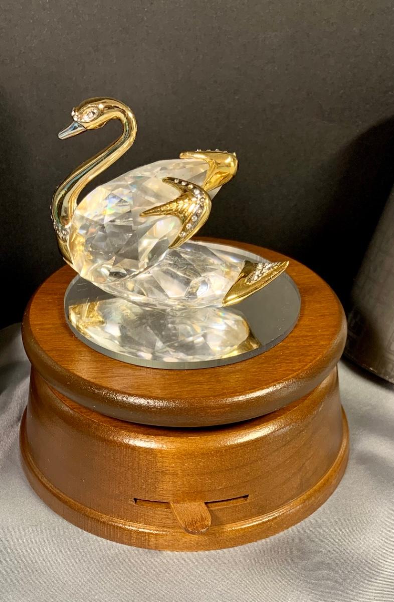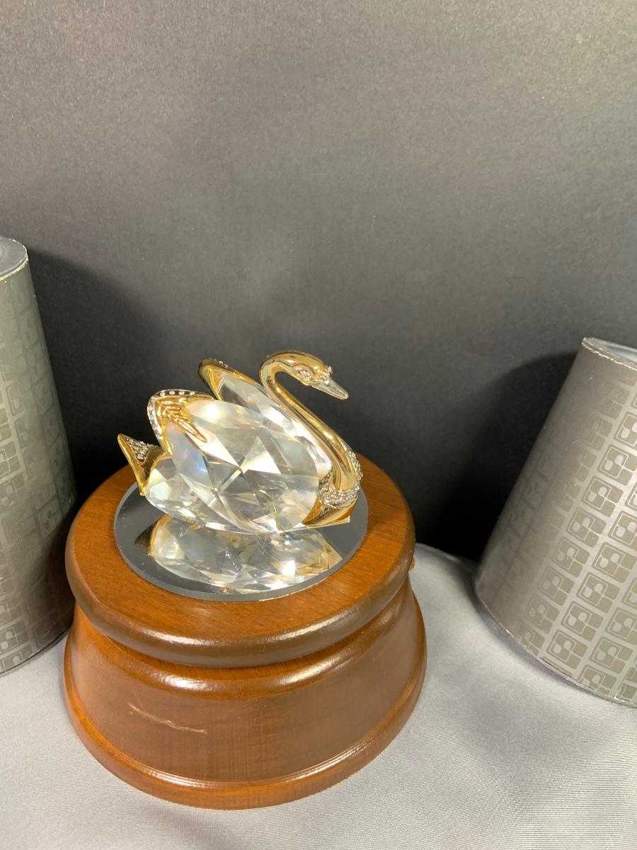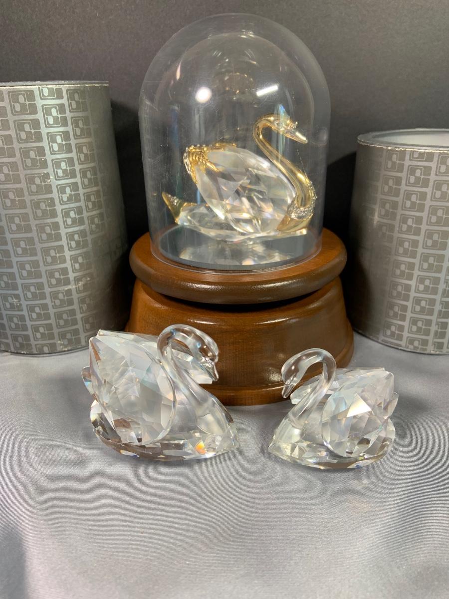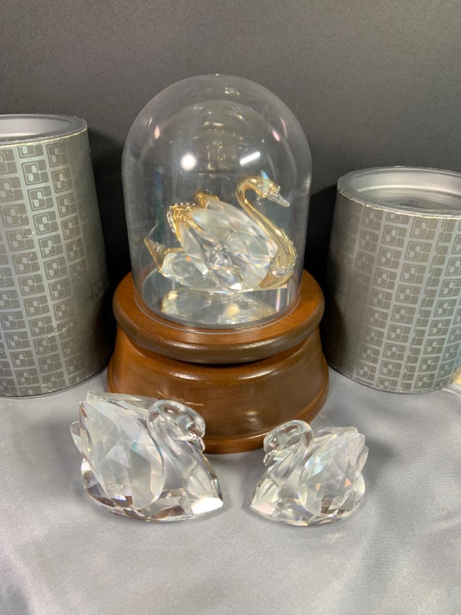LOT:34G: 2 Swarovski Crystal Swans with Original Boxes and a Souviner Swan Music Box