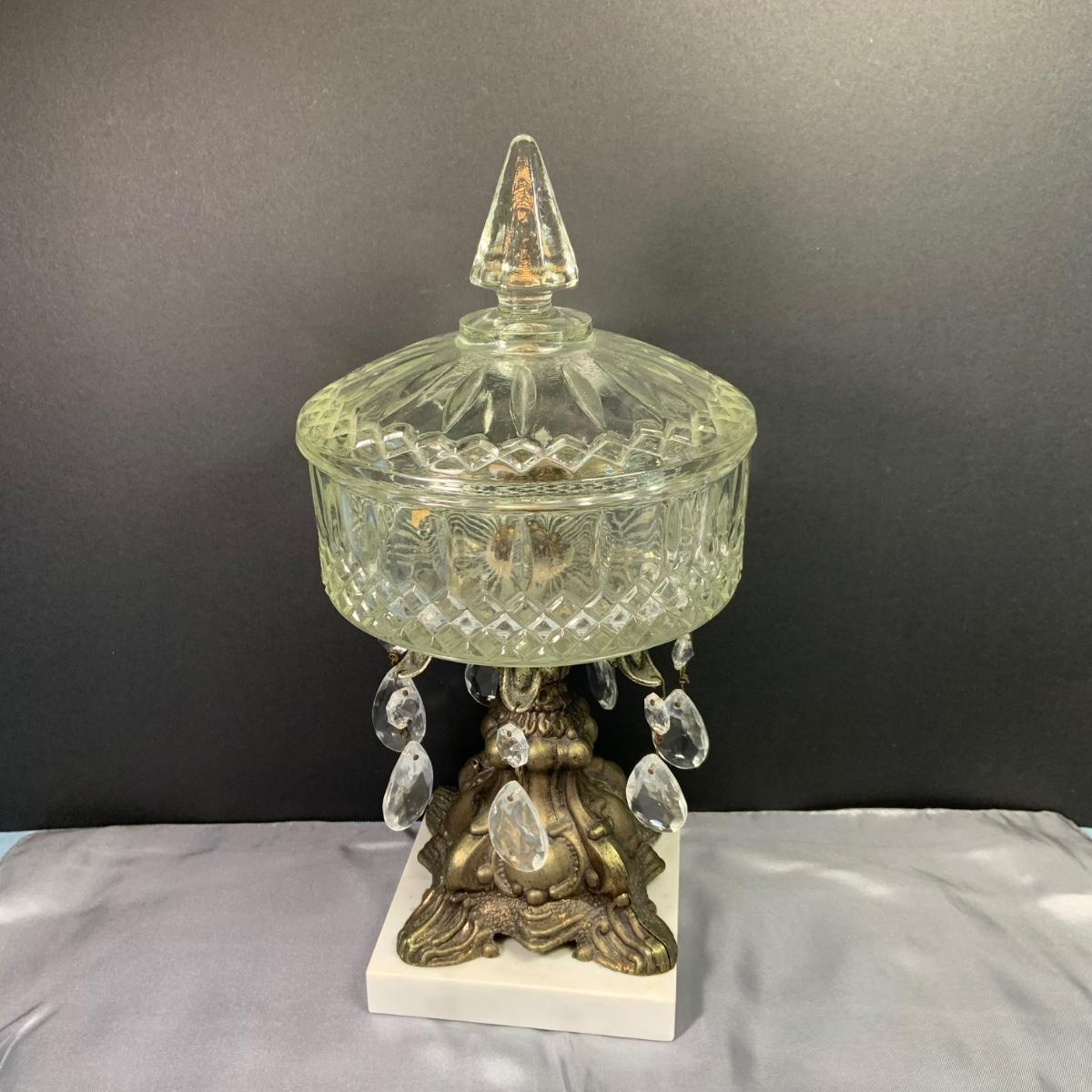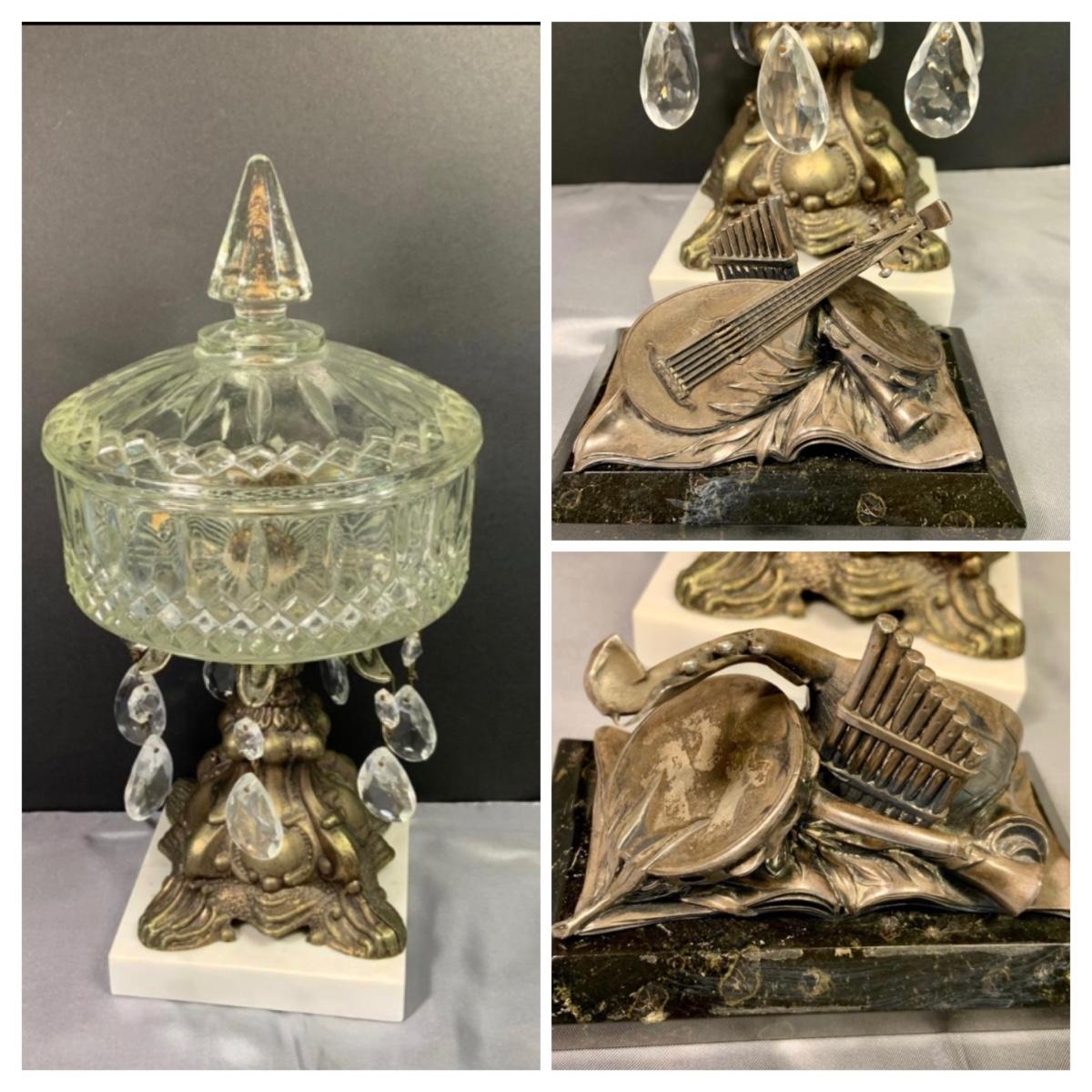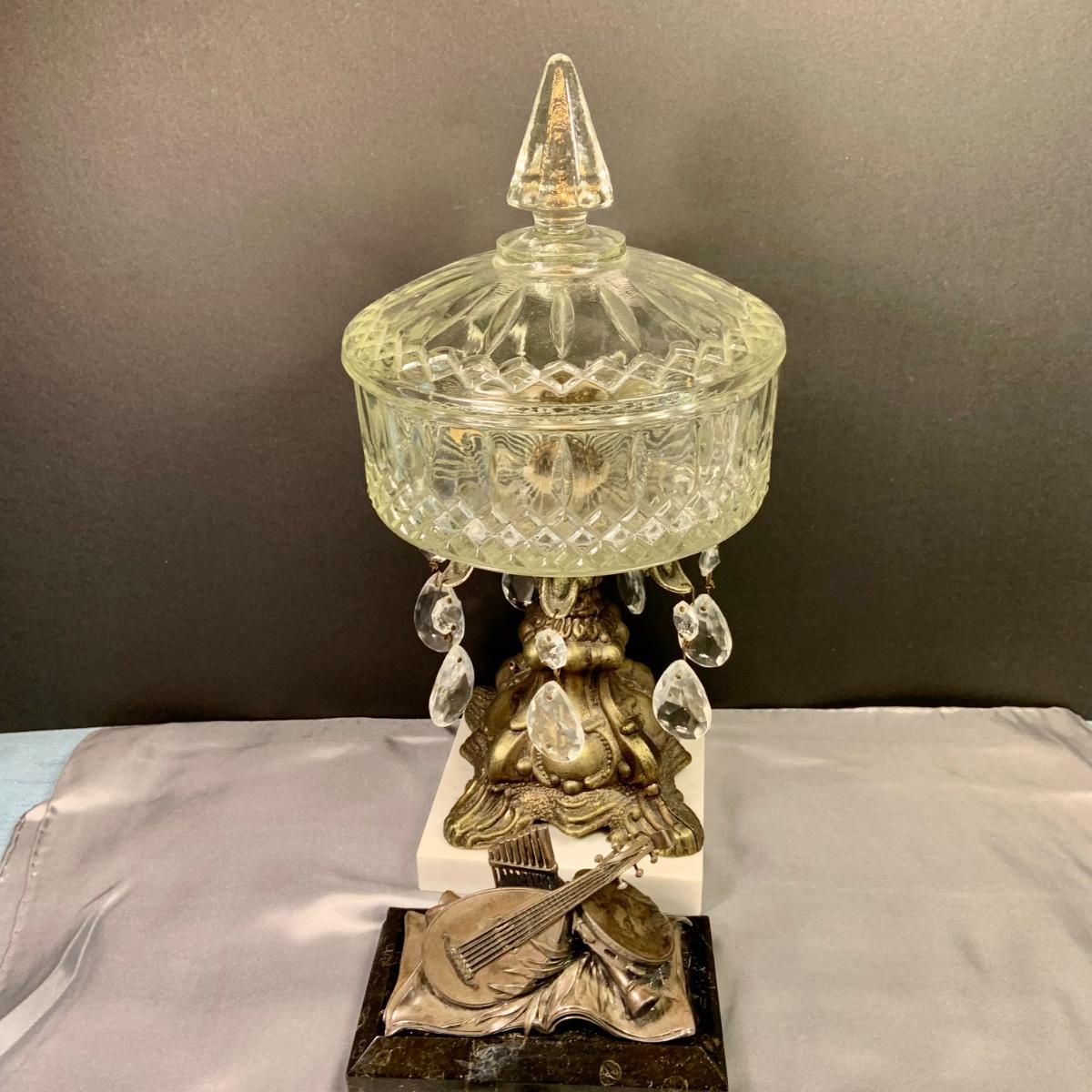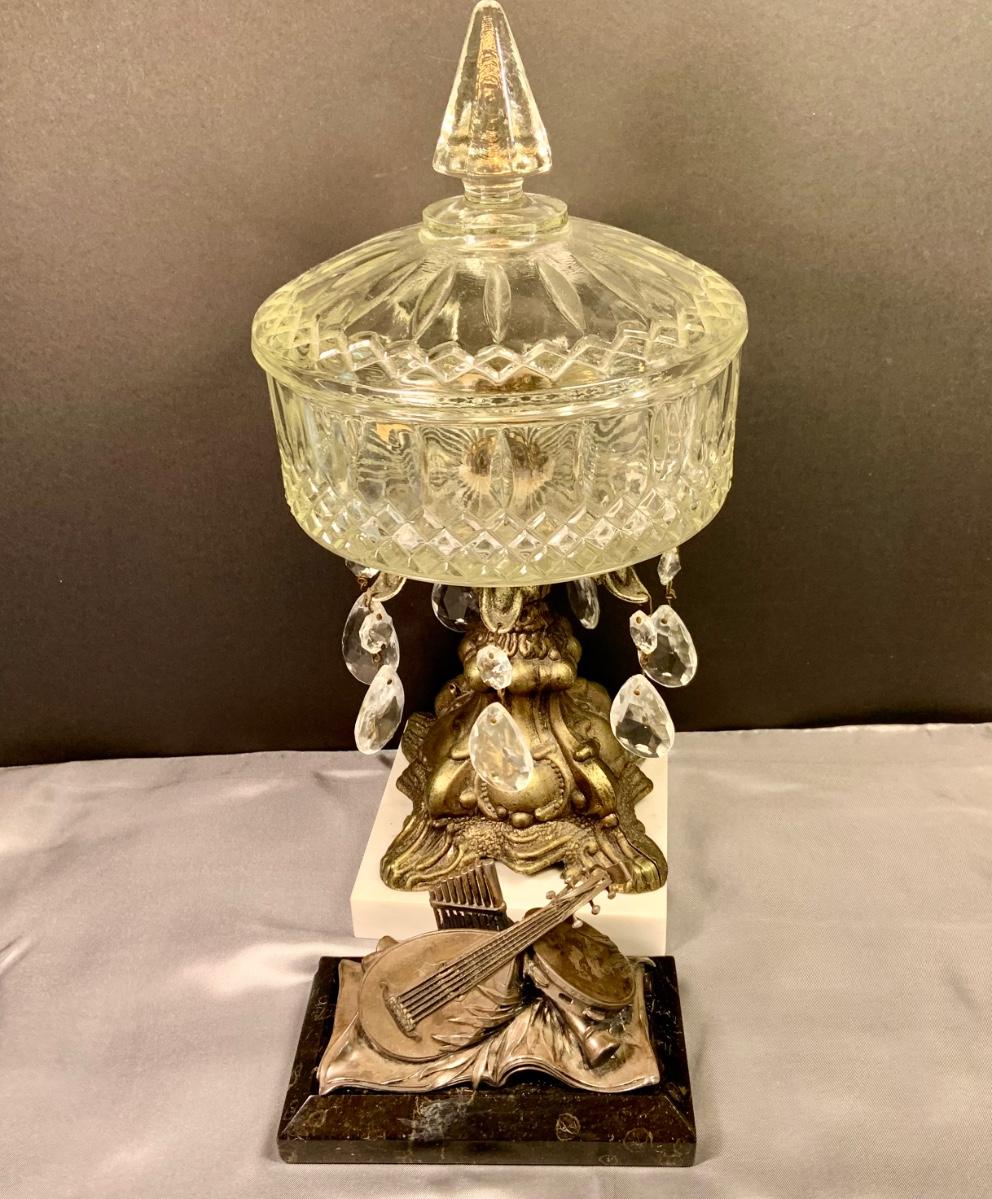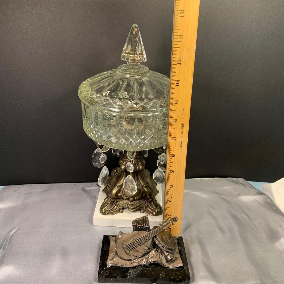 LOT:38G: Crystal Compot Candy Dish with Lid, Crystals and Marble Base and  Musical Instruments Sculpture
