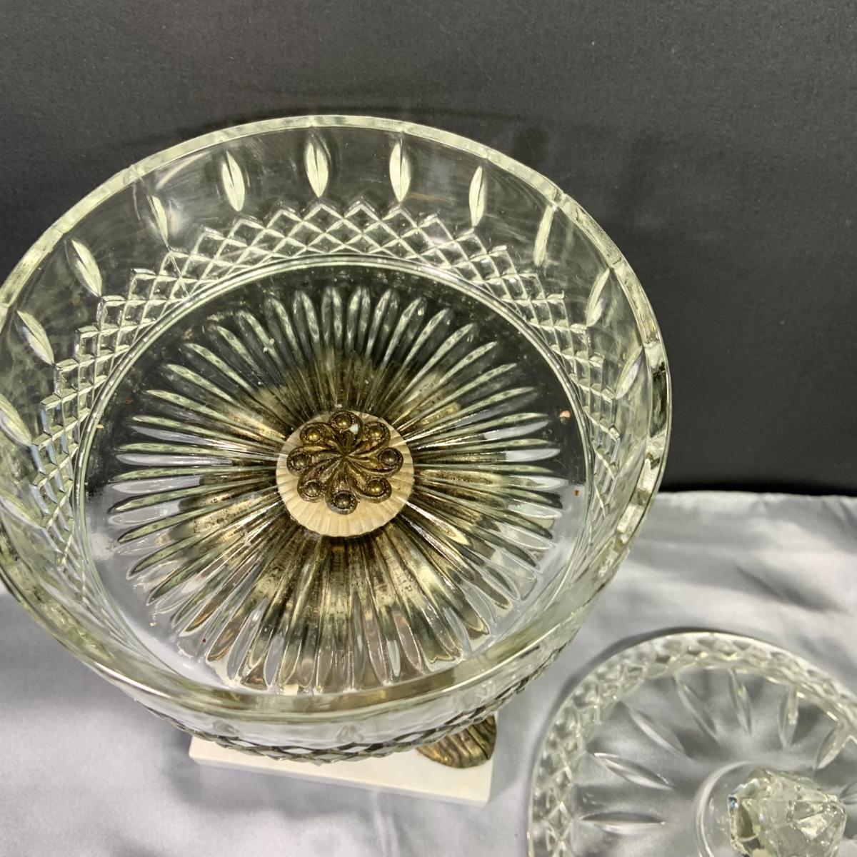 LOT:38G: Crystal Compot Candy Dish with Lid, Crystals and Marble Base and Musical Instruments Sculpture