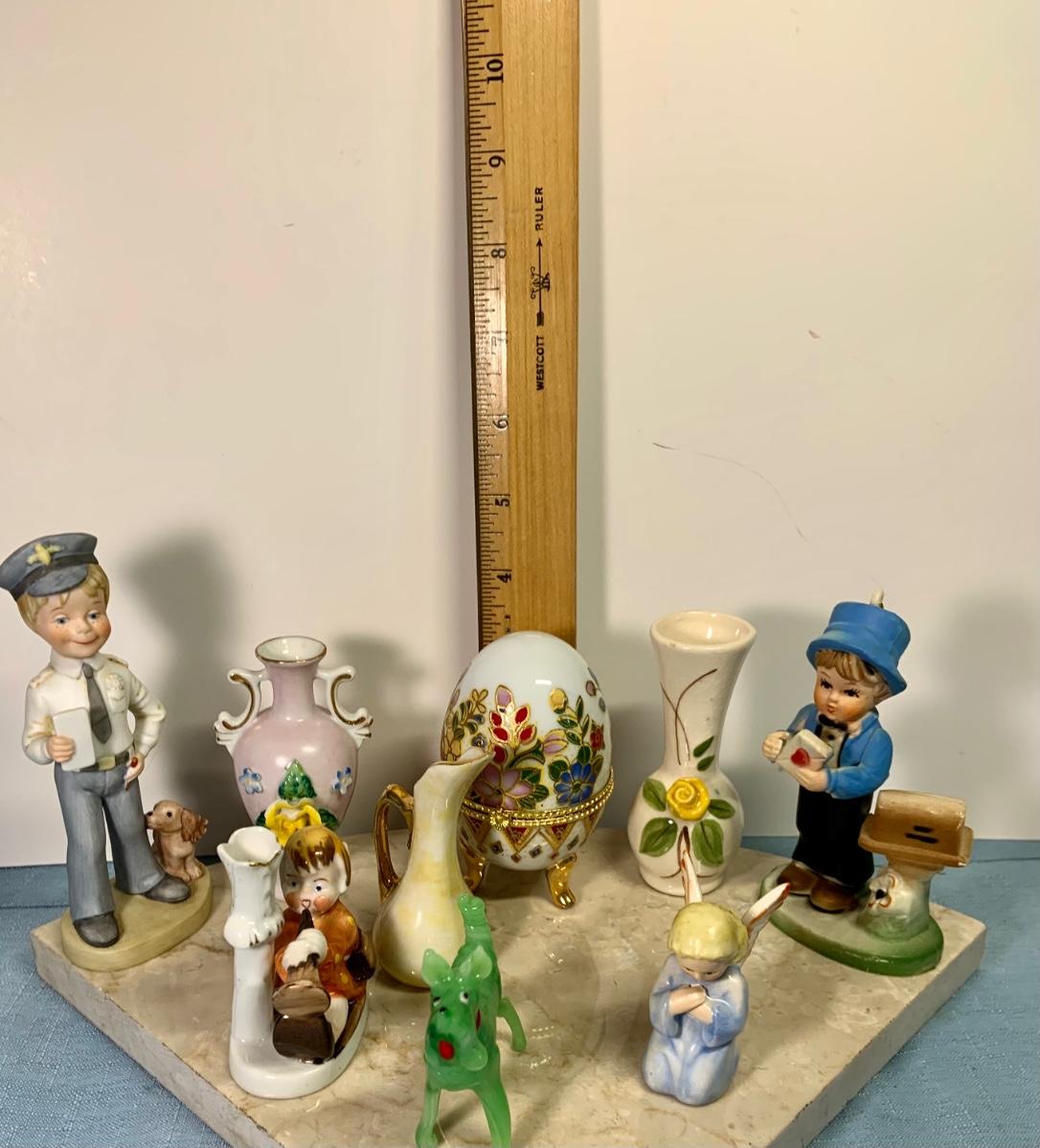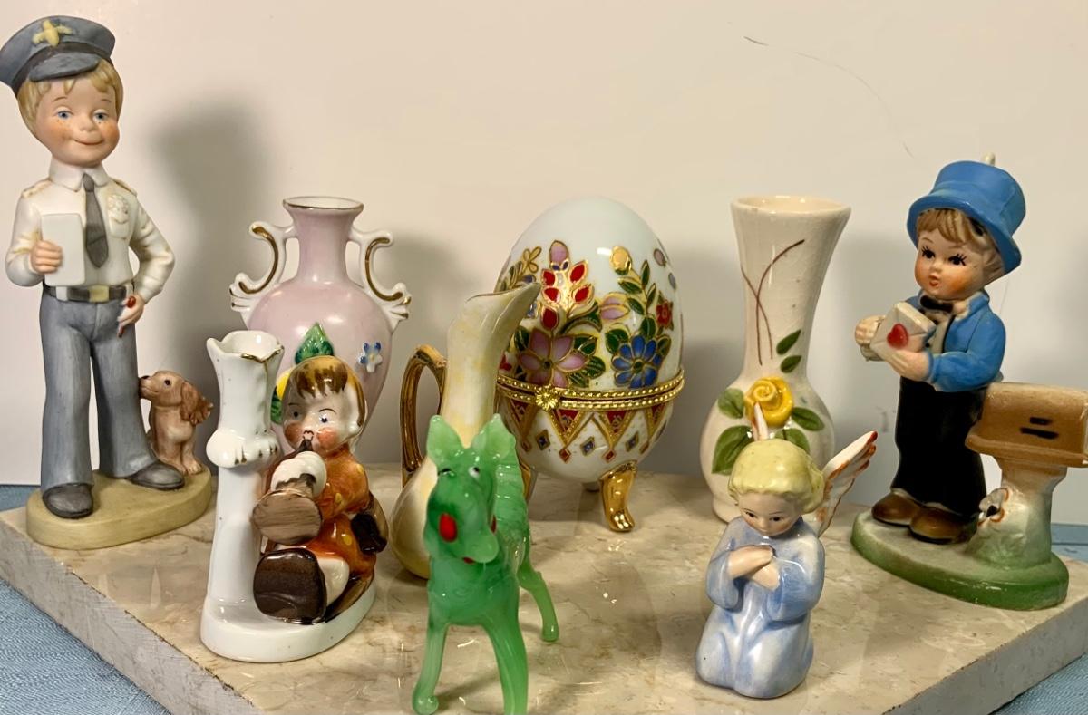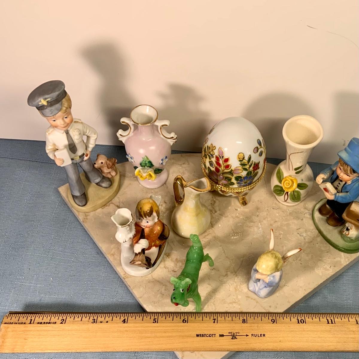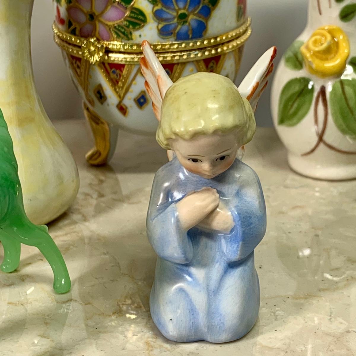 LOT:41G: Vintage Figurines and Assorted Smalls Including Goebel Angel; Vase and Figure Made in Occupied Japan; Green Glass Dog and More