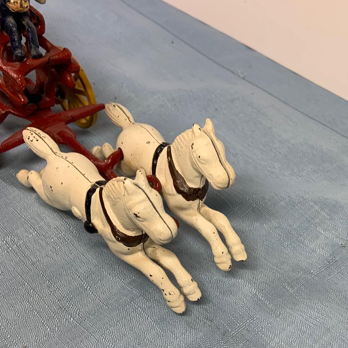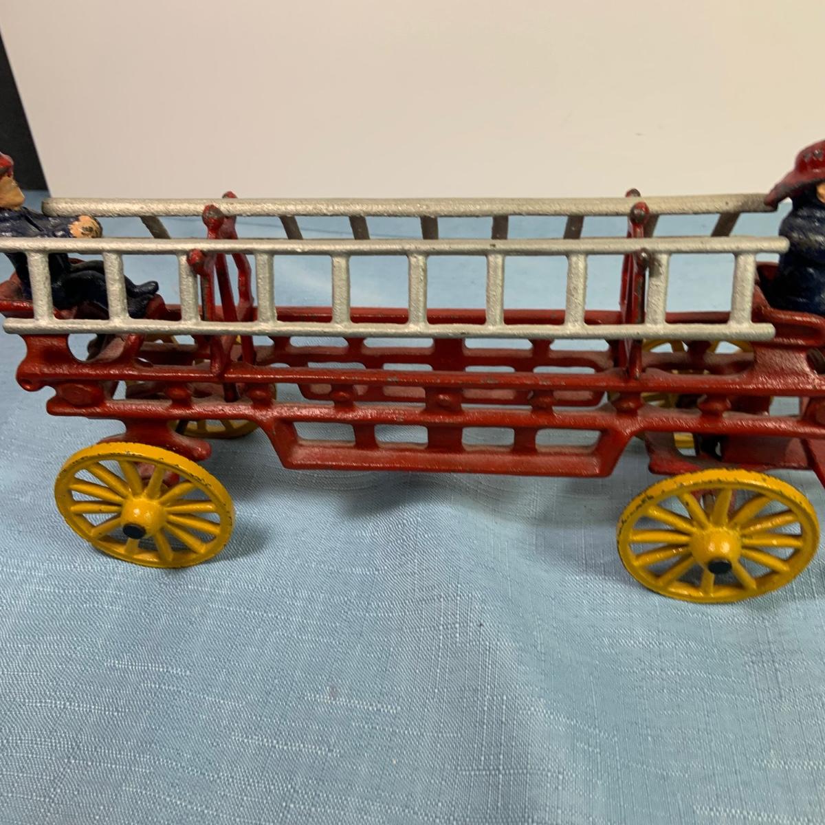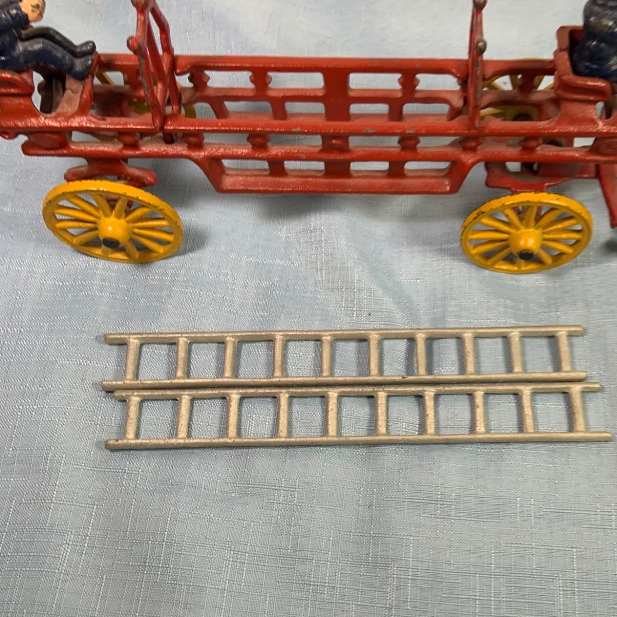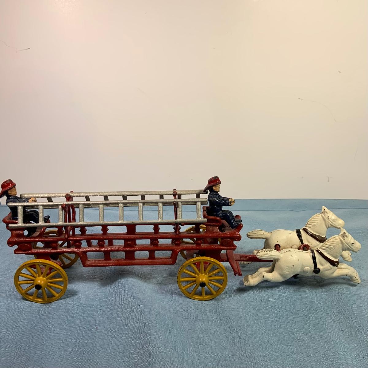 LOT:51G: Cast Iron Toy Horse Drawn Hook and Ladder Fire Carrage with Fightermen
