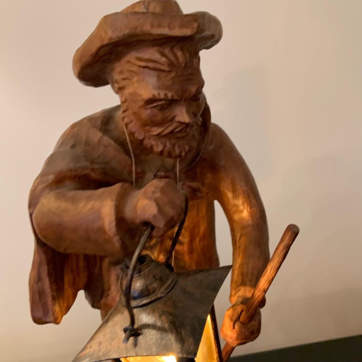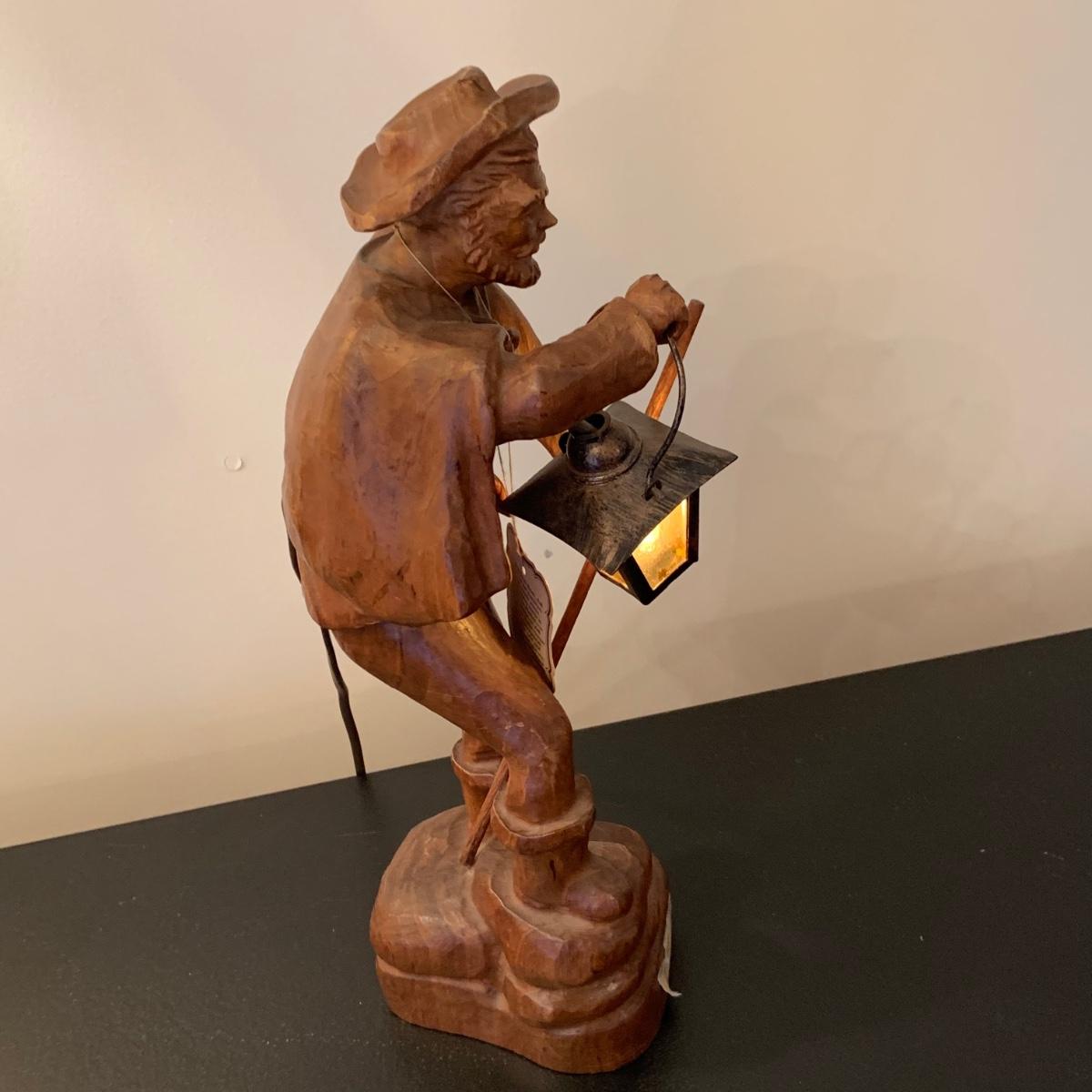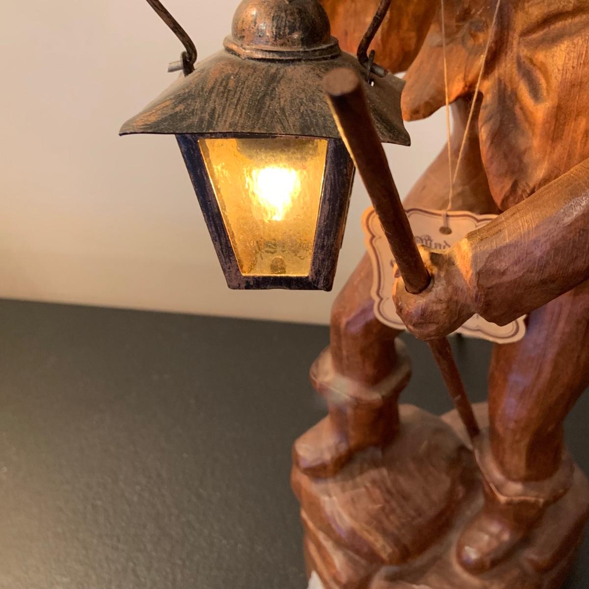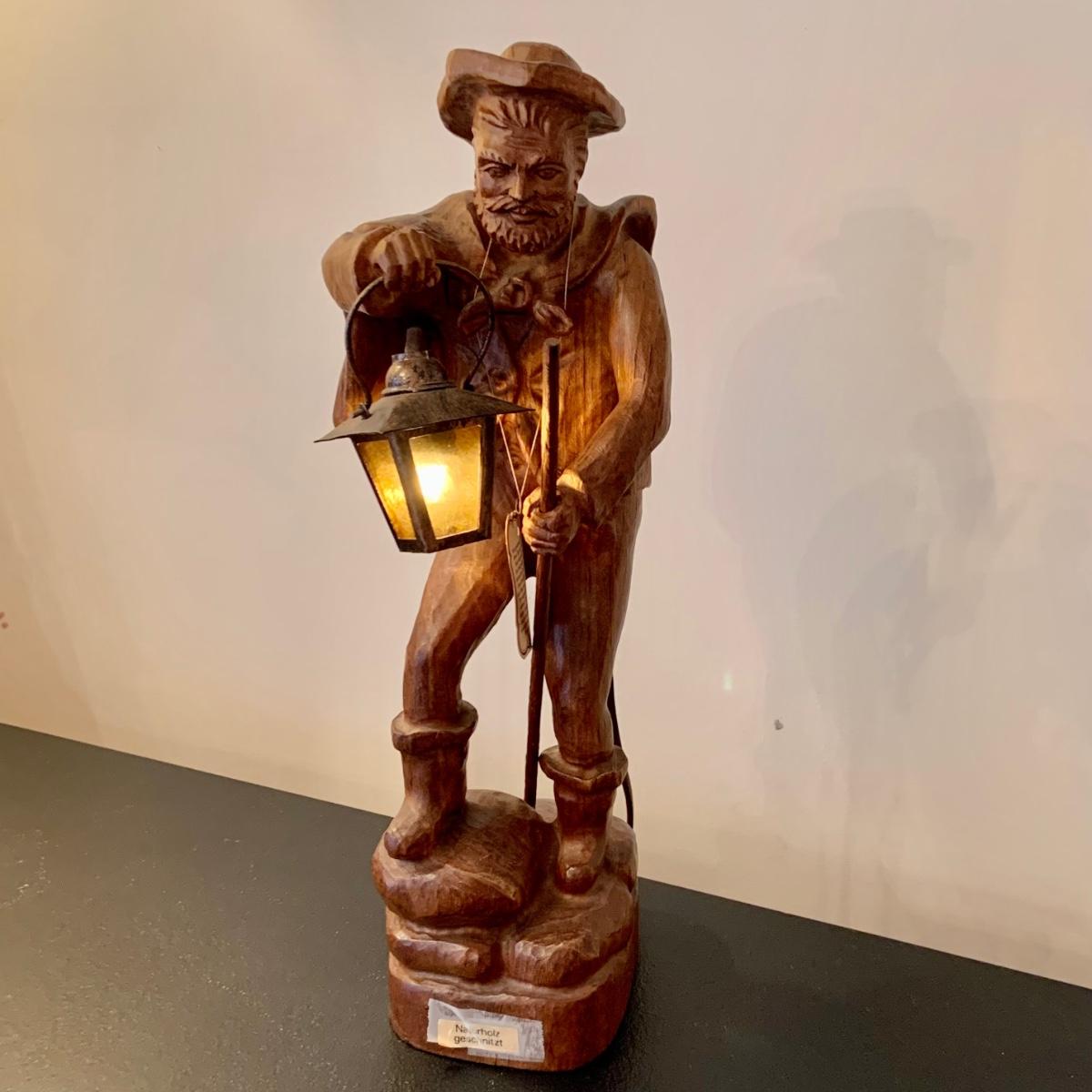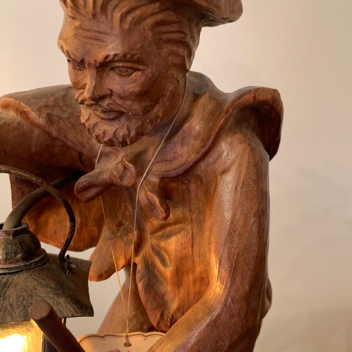 LOT:107G: Vintage Mid Century German Black Forest Carved Wooden Watchman Table Lamp with COA in German