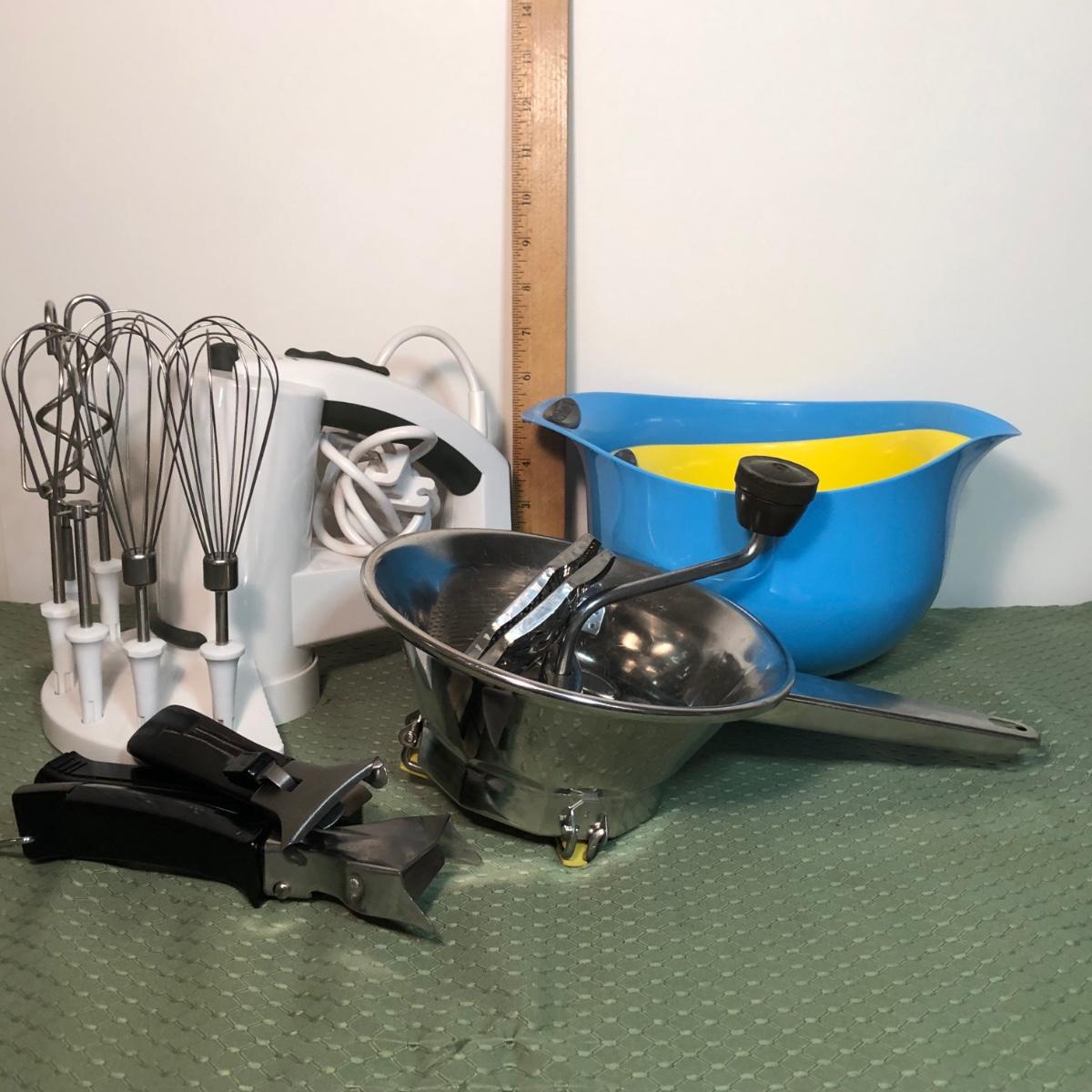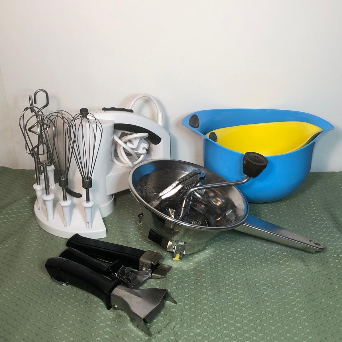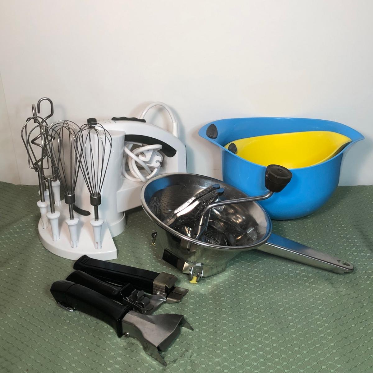 LOT 125M: Oreck Electric Hand Mixer w/ Attachments, Mouli Legumes Slicer & Cuisinart Mixing Bowls