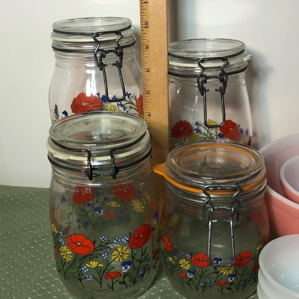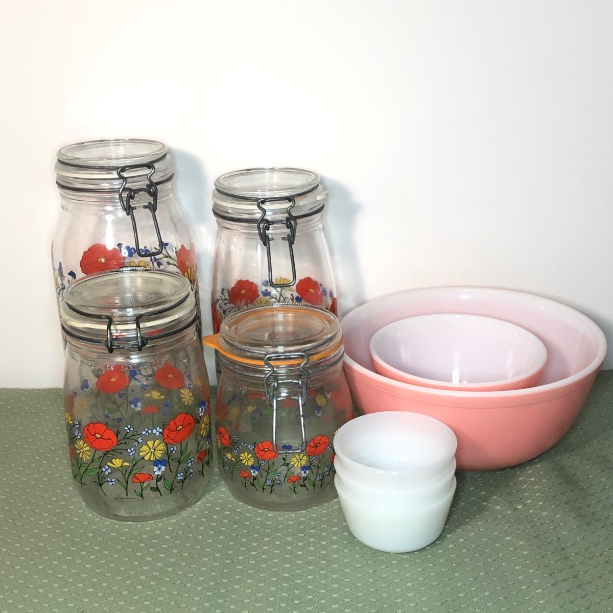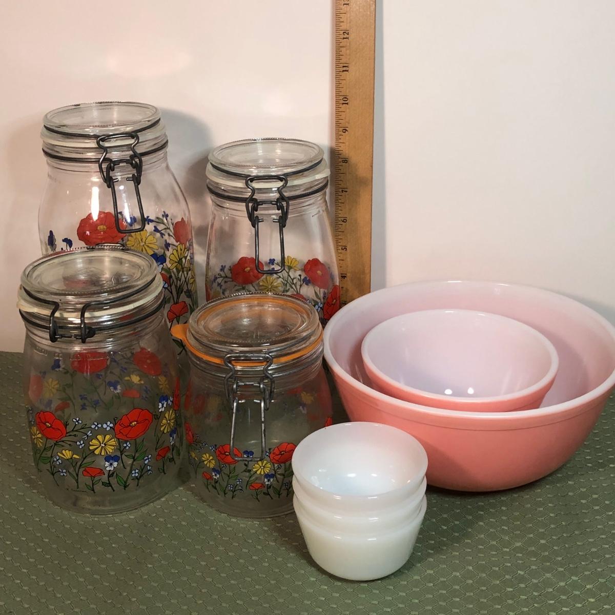 LOT 130M: Arc Glass Poppy Canisters, Pink Pyrex Mixing Bowls & More