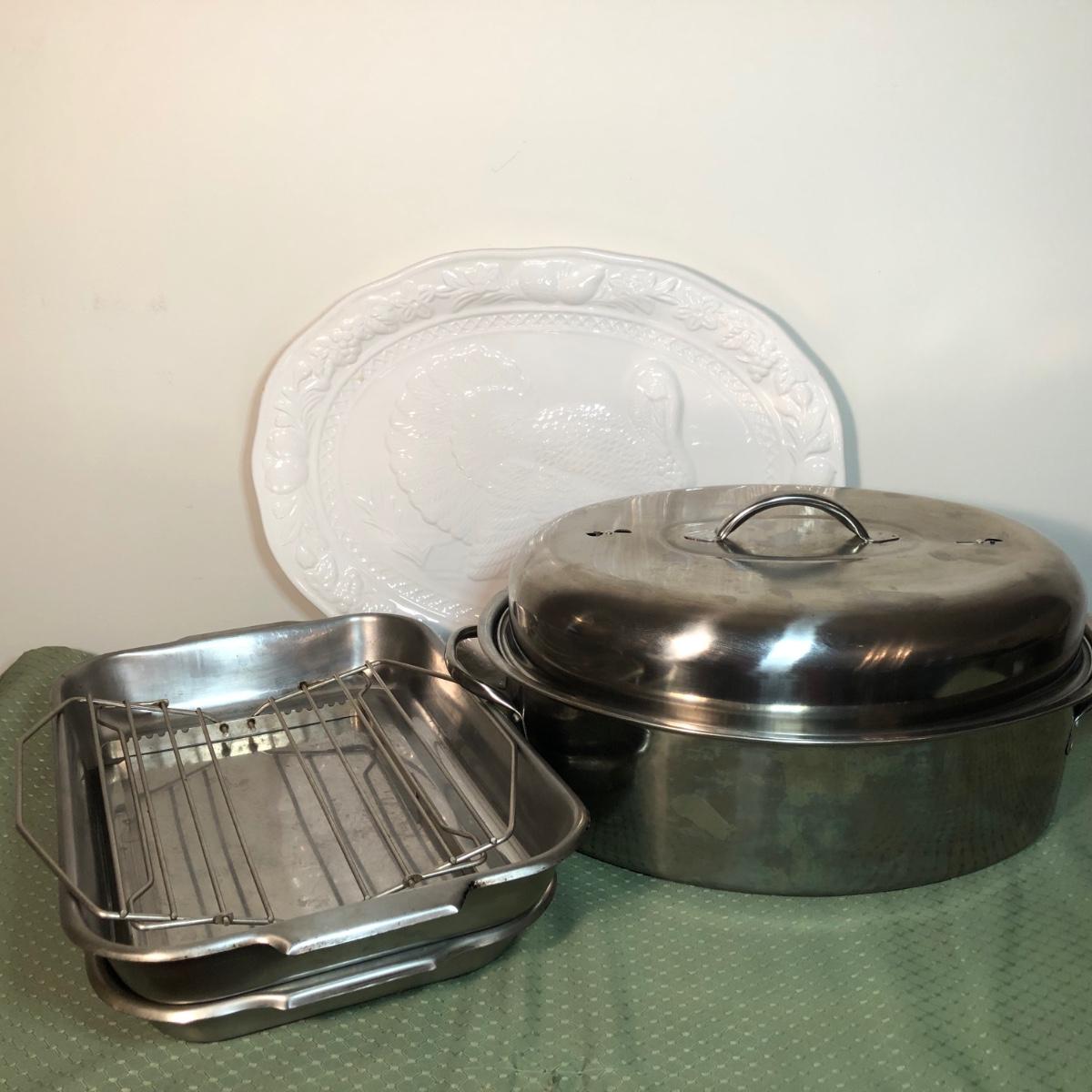 LOT 135M: 1996 White Lotus Turkey Serving Platter, Vollrath Stainless Steel, Gibson Meat Tray & More