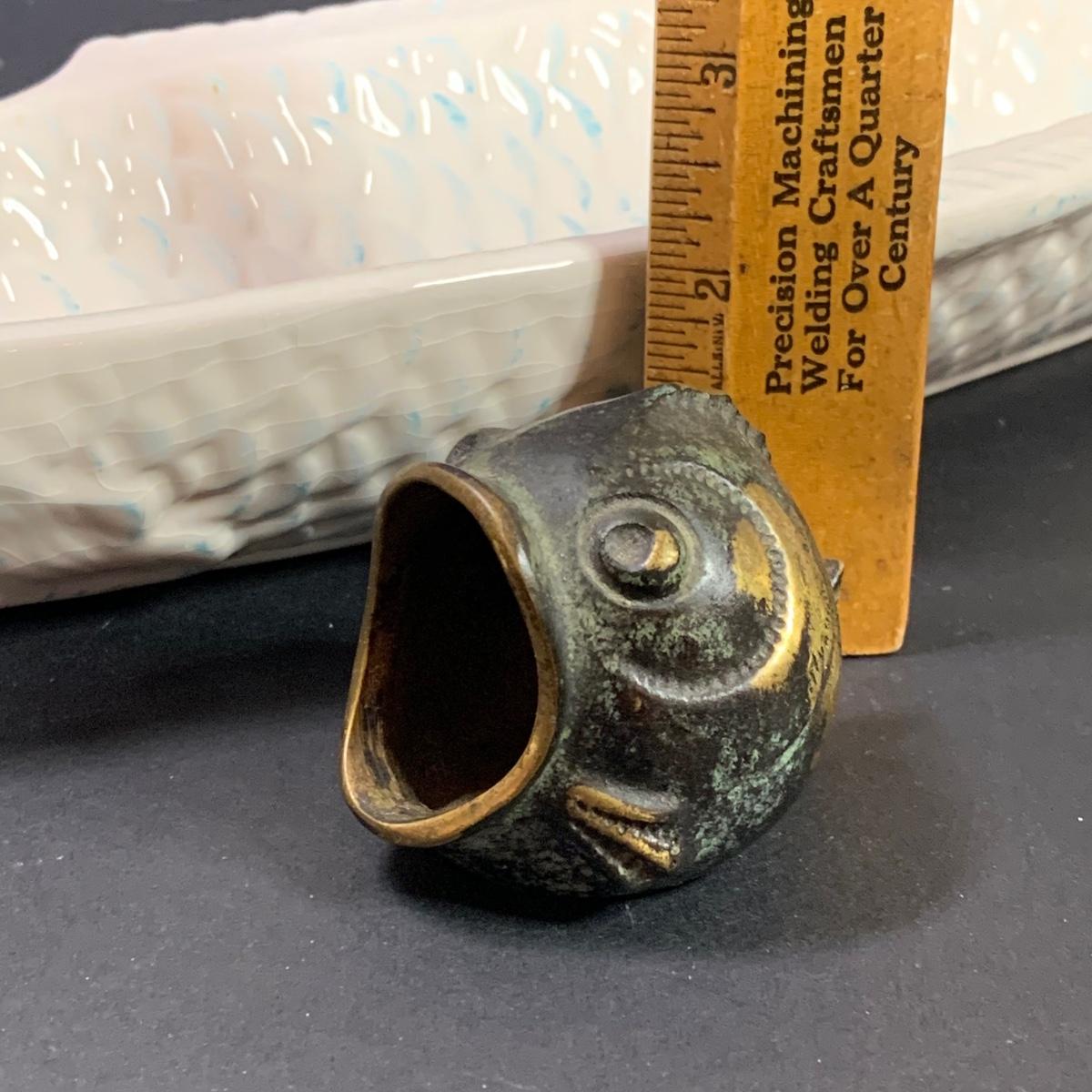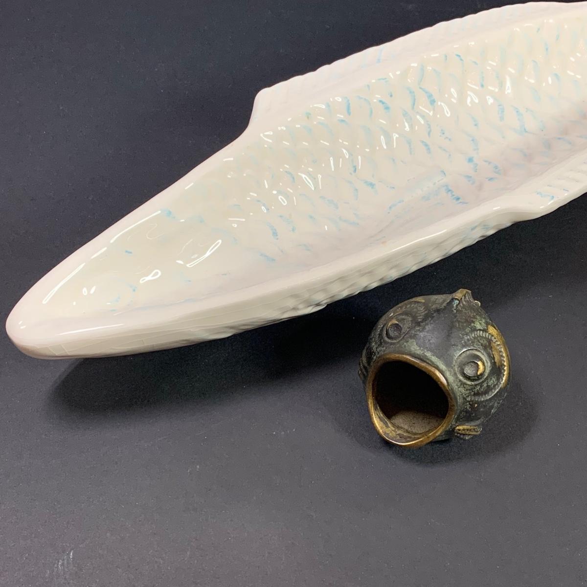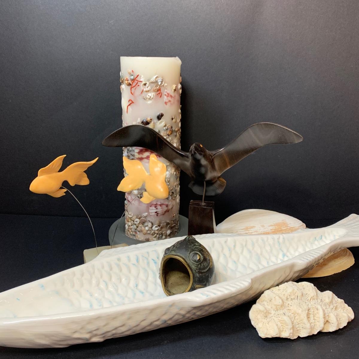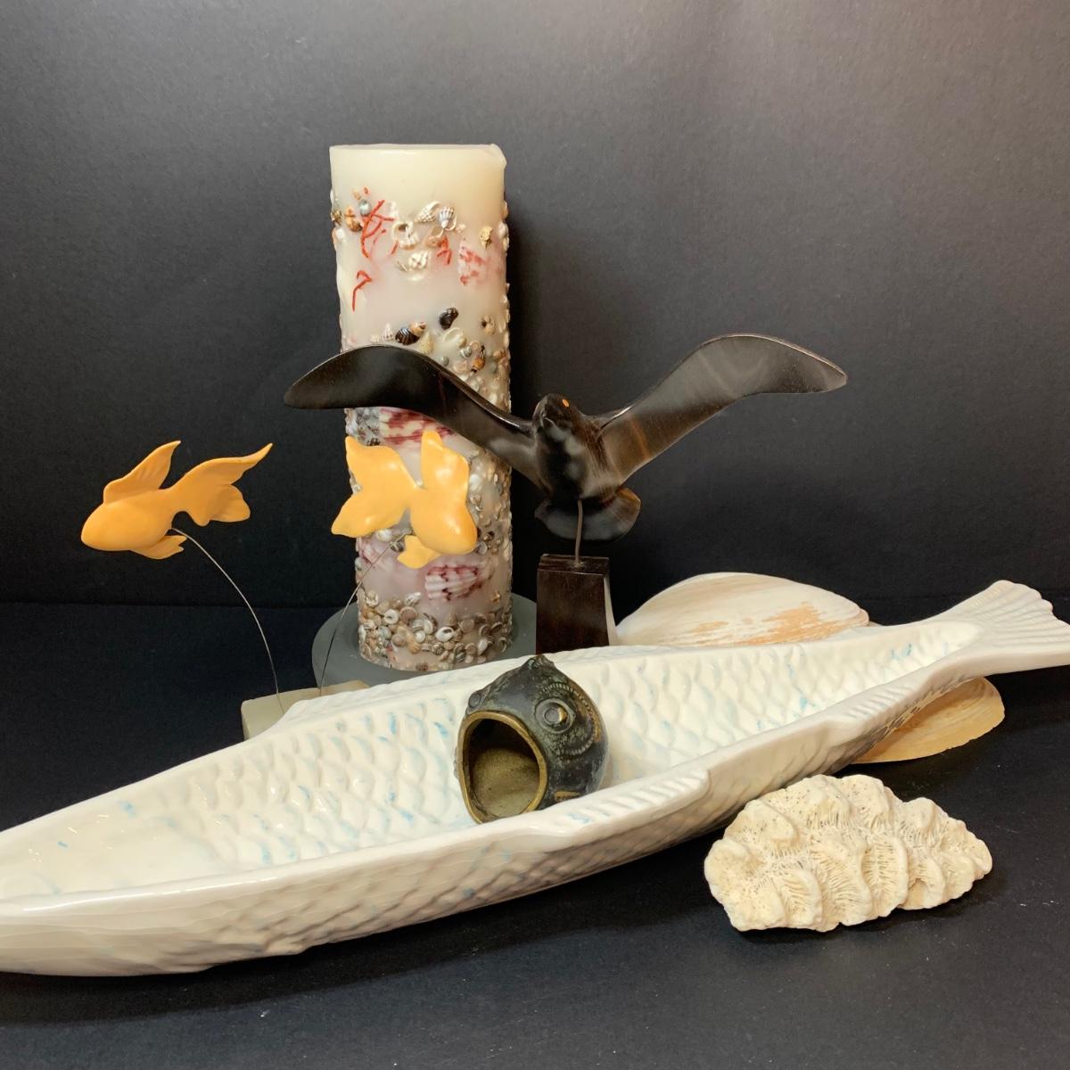 LOT 154R: Vintage Carved Seagull, Wiggle Fish Art w/Stone Base, Brass Ashtray, Boston Warehouse Fish Serving Dish & More