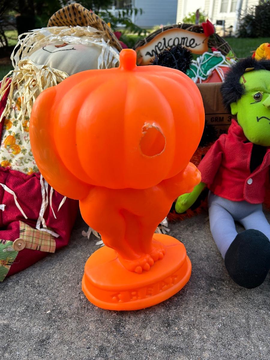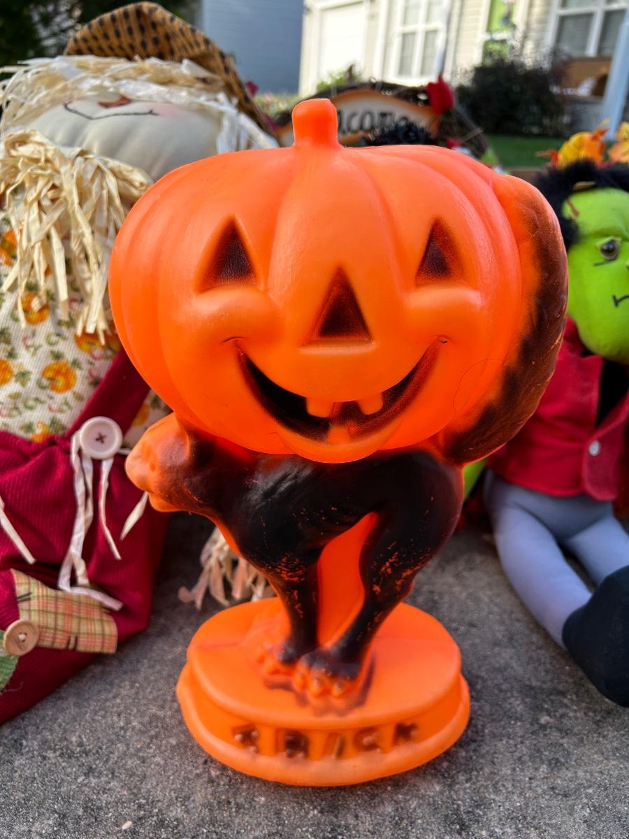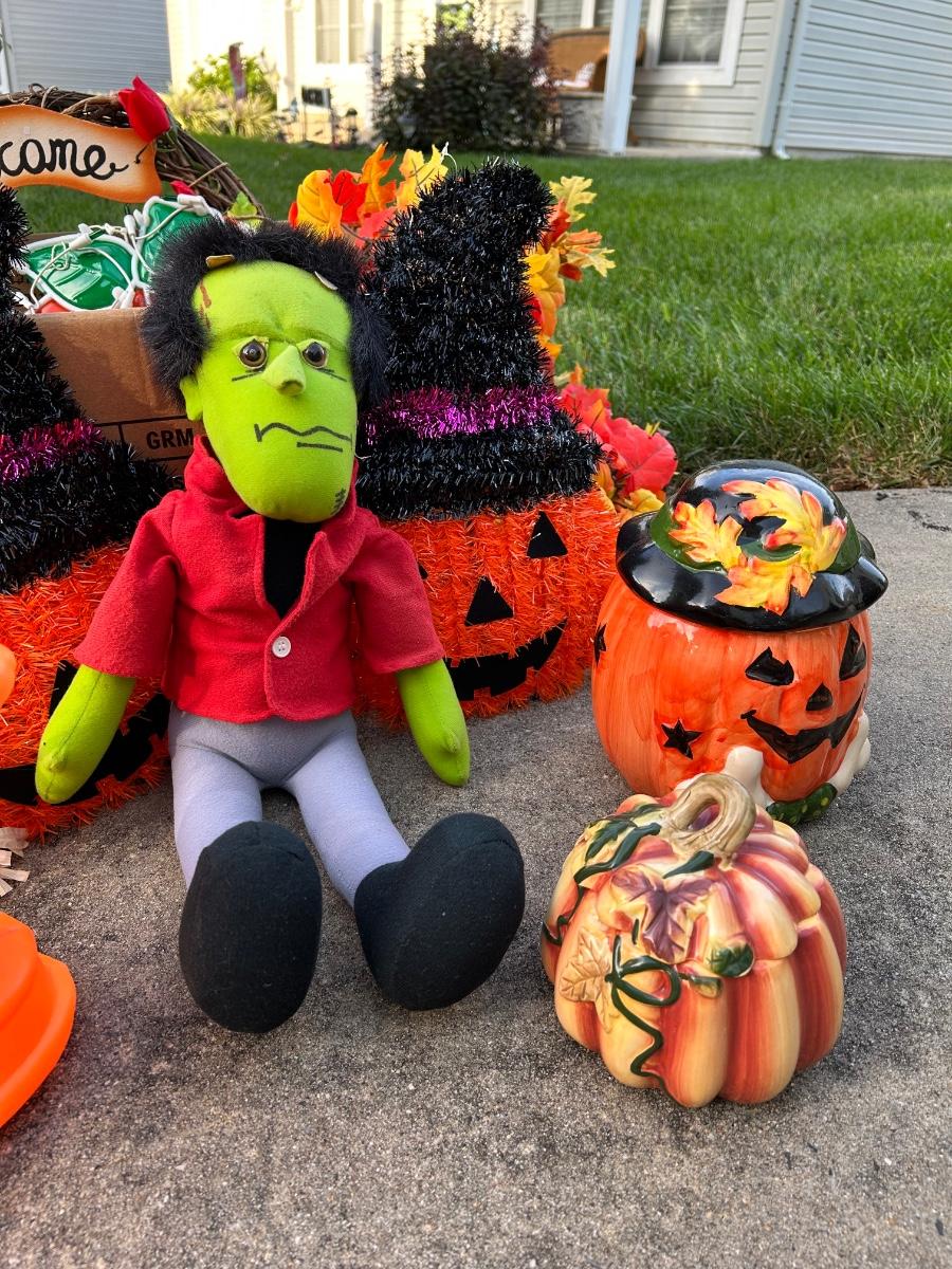 Halloween Glow Mold, wreath, plush pumpkins and scarecrow.