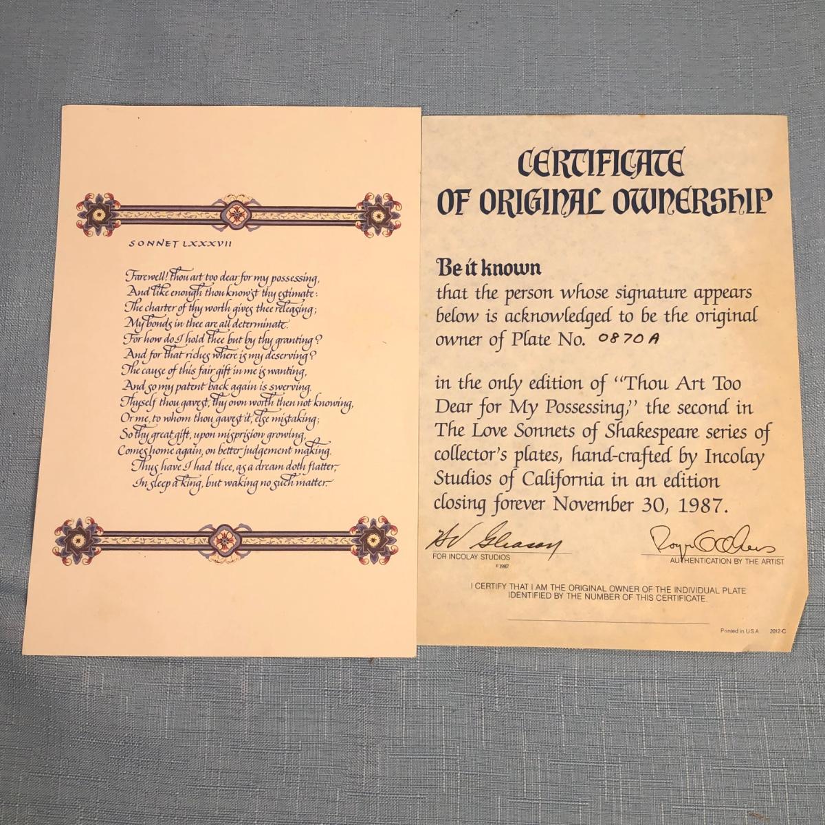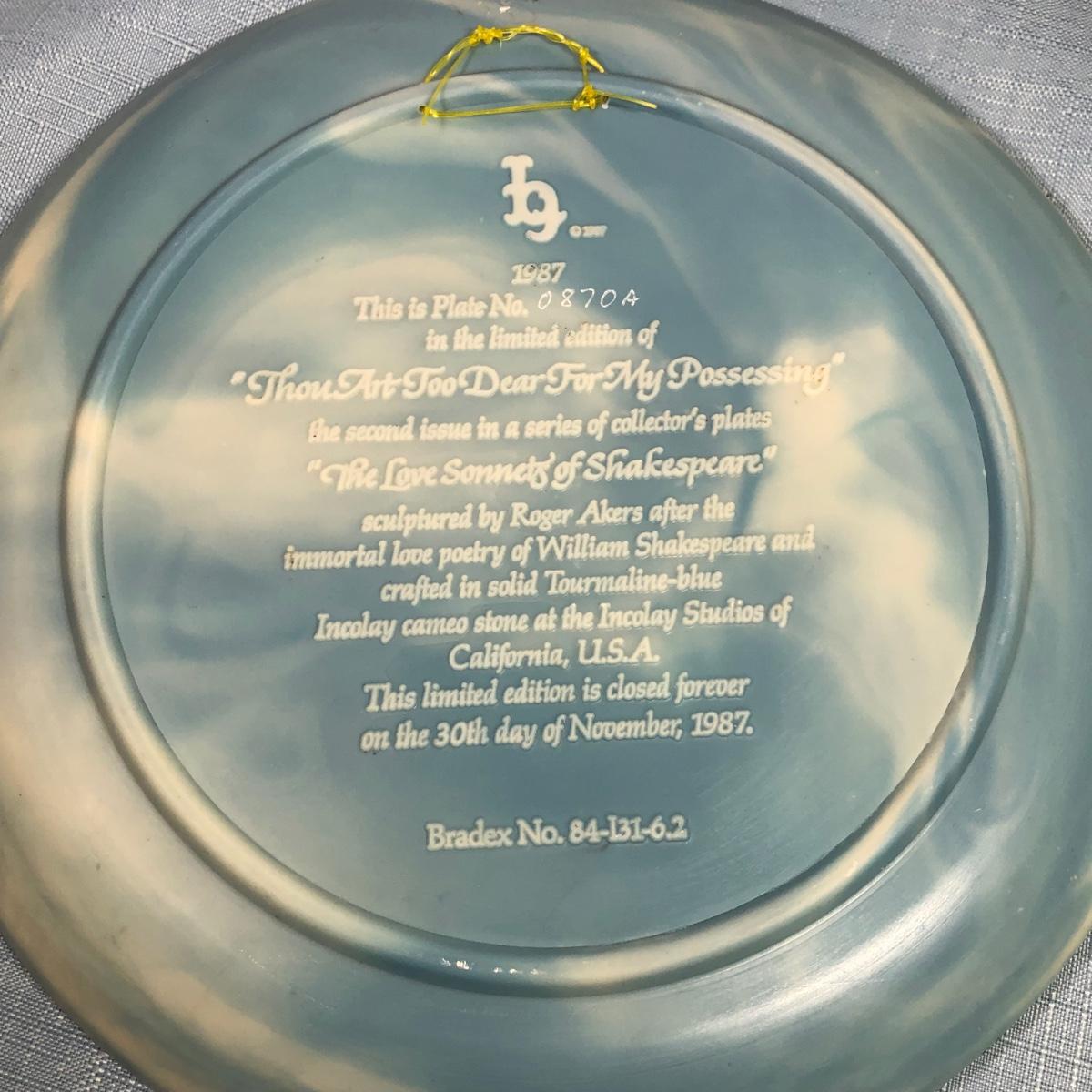 LOT 191M: Love Sonnets of Shakespeare Limited Edition Cameo Collector's Plates w/ Boxes & COAs