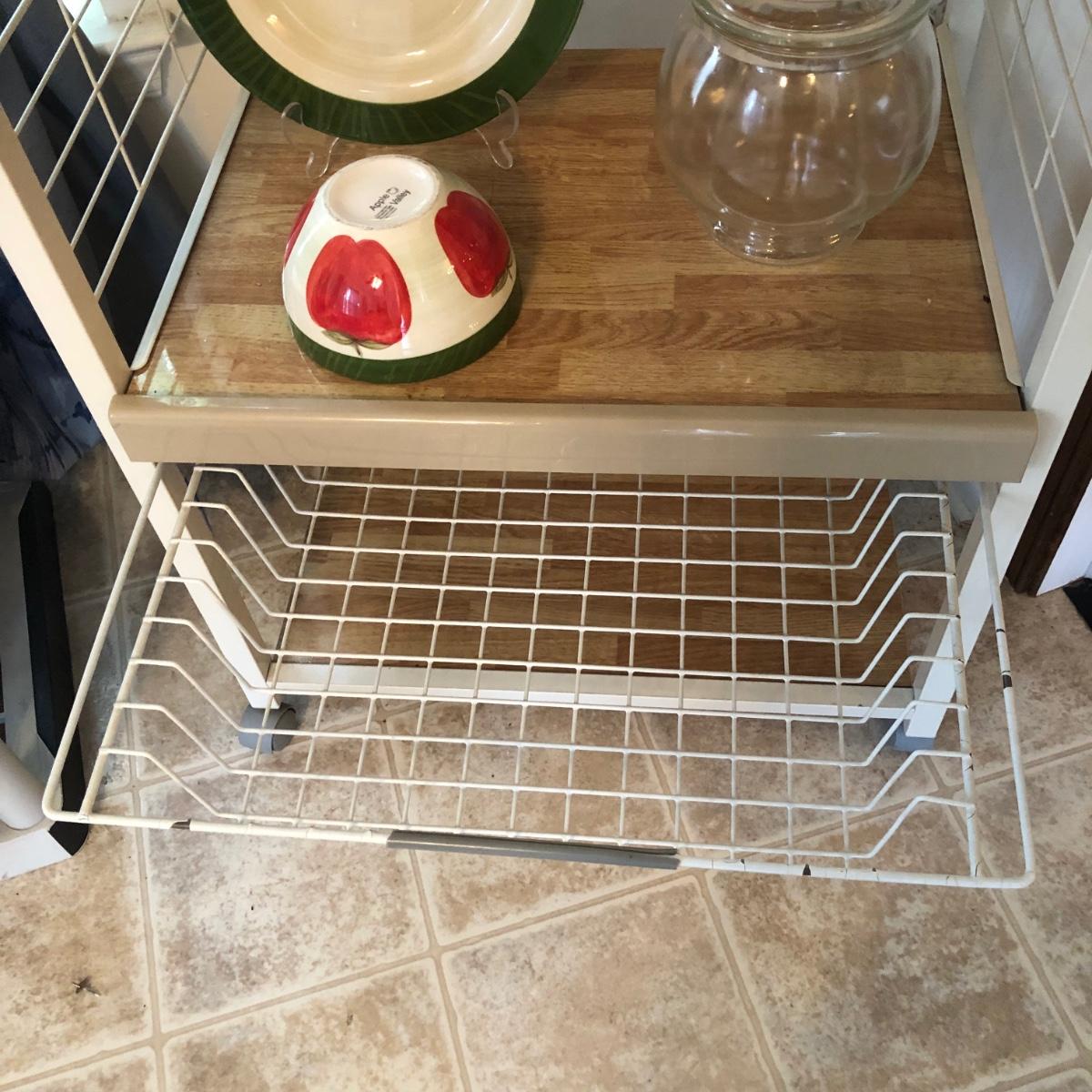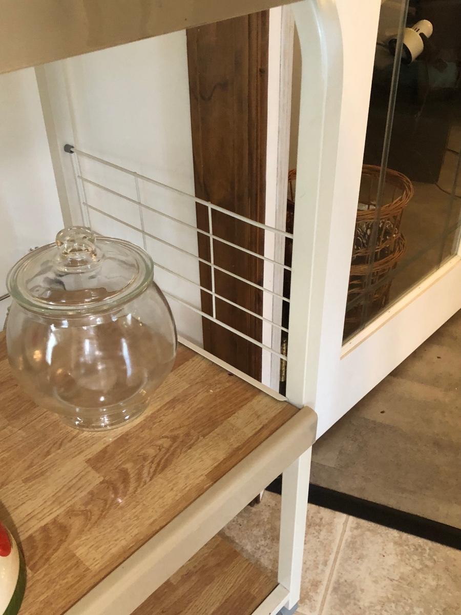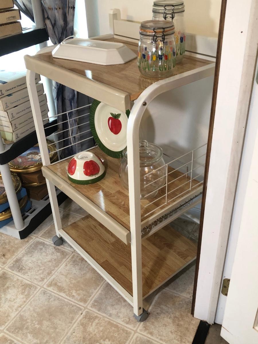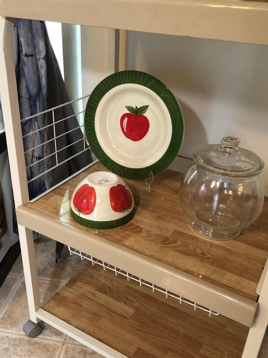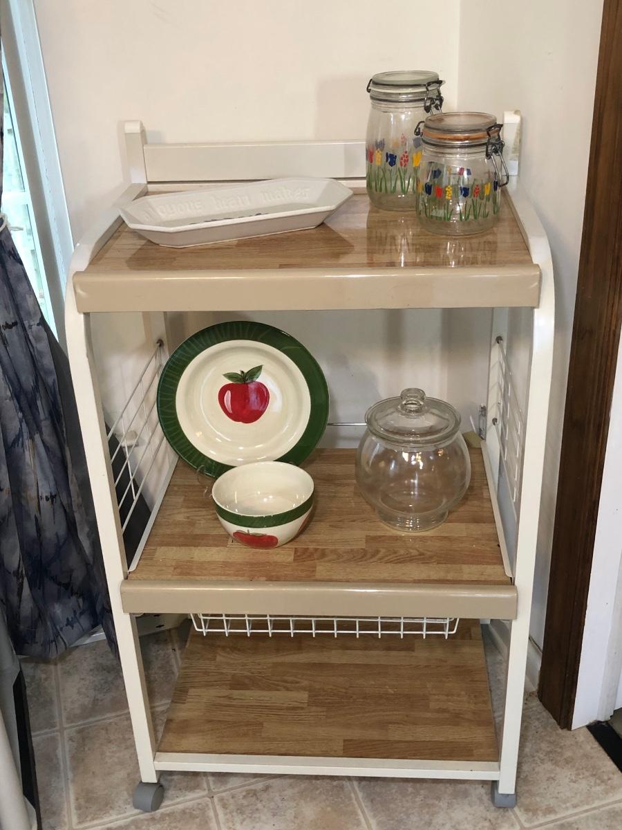 LOT 206M: Kitchen Cart w/ Pfalzgraff Dish, Arc Poppy Canisters, Glass Jar & Apple Valley Matching Bowl/Plate