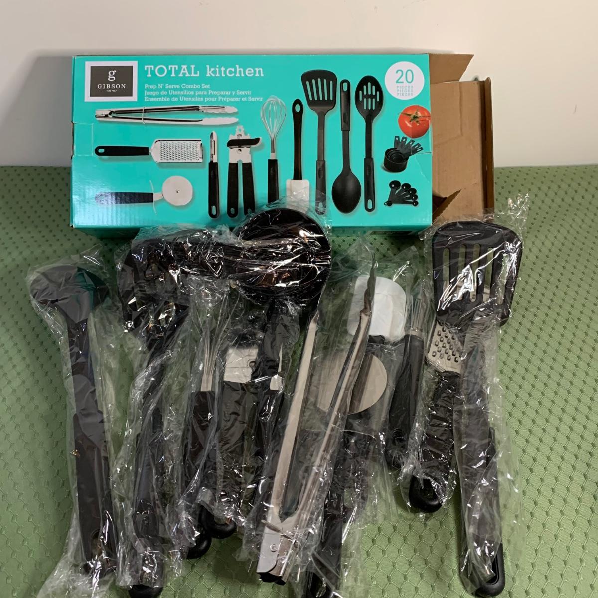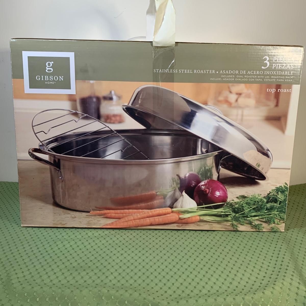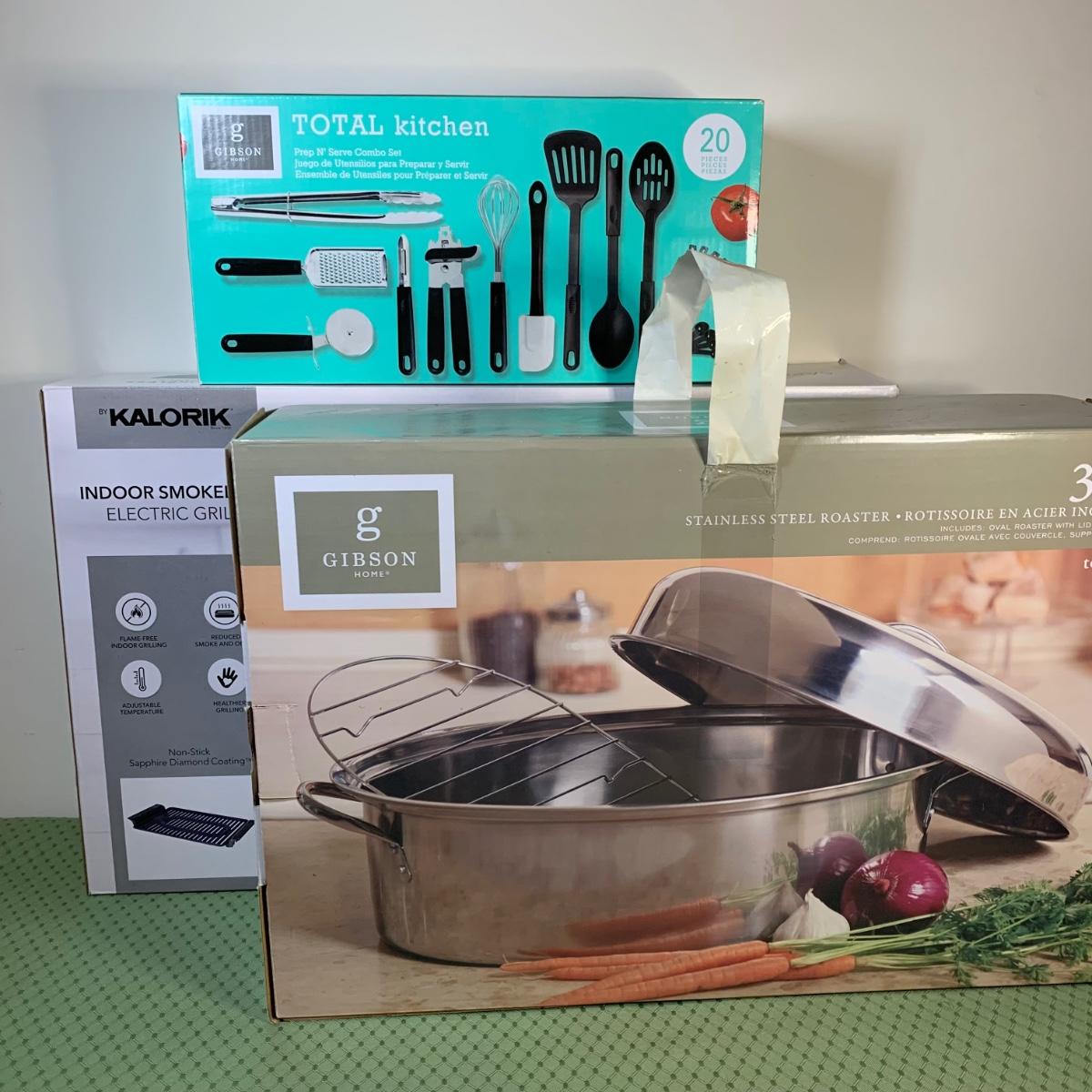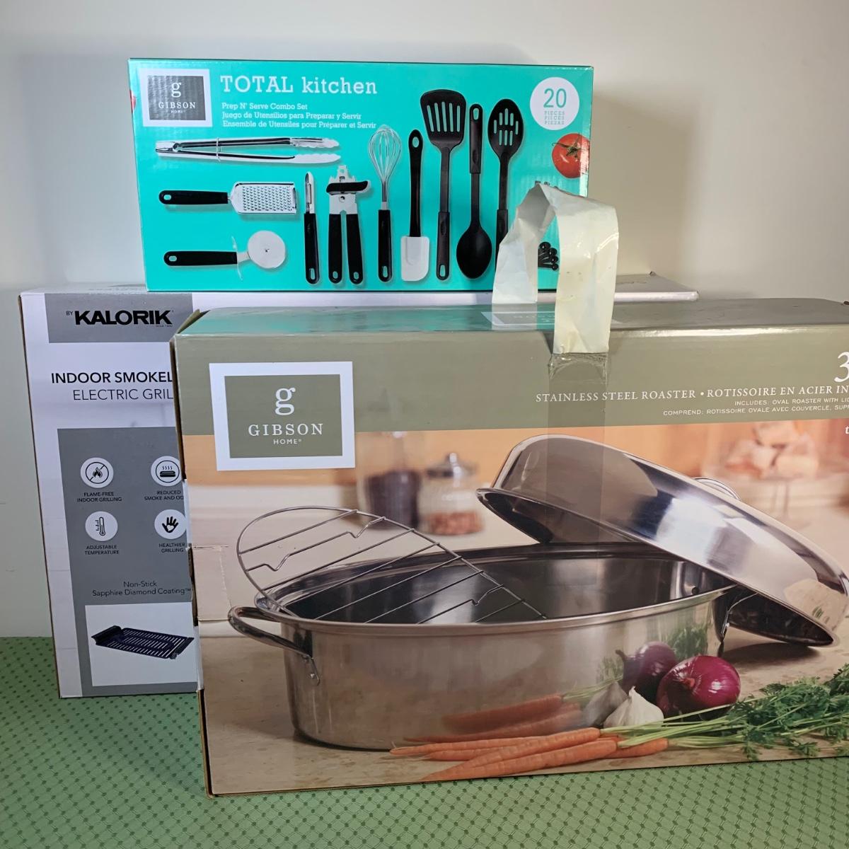 LOT 230R: New Unused - Gibson Stainsless Steel Roaster;  Kalork Indoor Smokeless Electric Grill, and Opened Box of Gibon Prep & Serve Kitchen Utensiles Not Complete