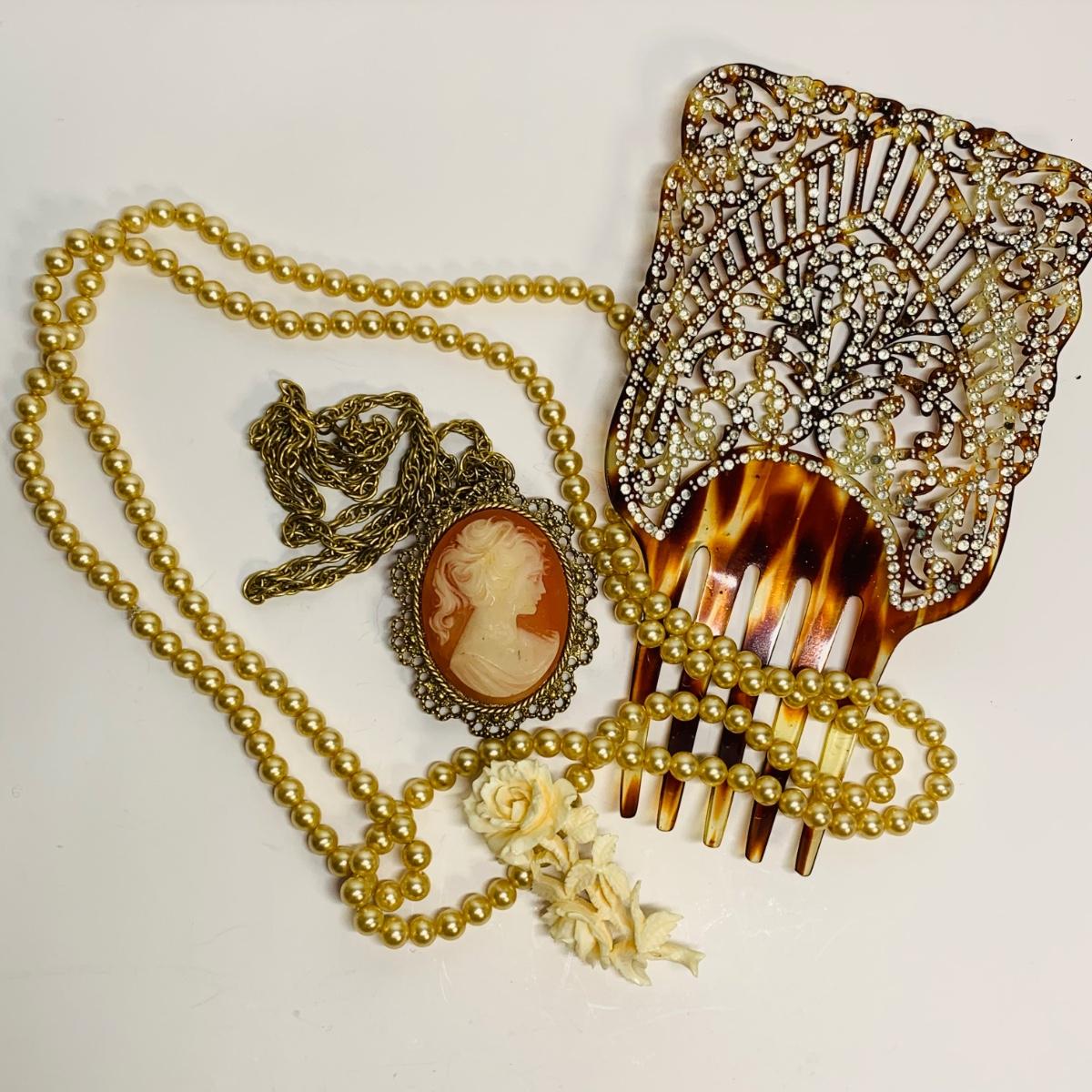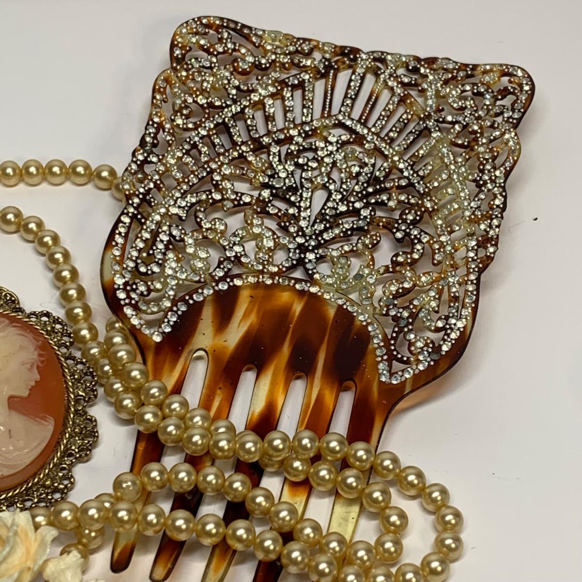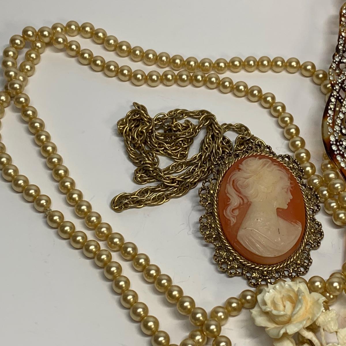LOT 242R: Vintage Faux Pearls, Cameo Necklace/Brooch, Rose Pin & Rhinestone Hair Piece