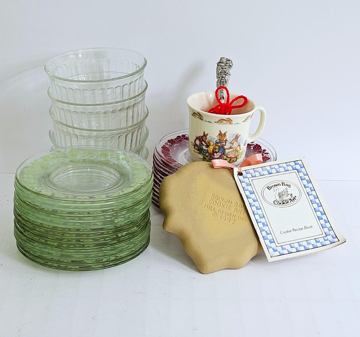 LOT 51K: Starwberry Shortcake Flatware 3pc Set, Bunnykins Mug, Various Dishware, Cookie Mold