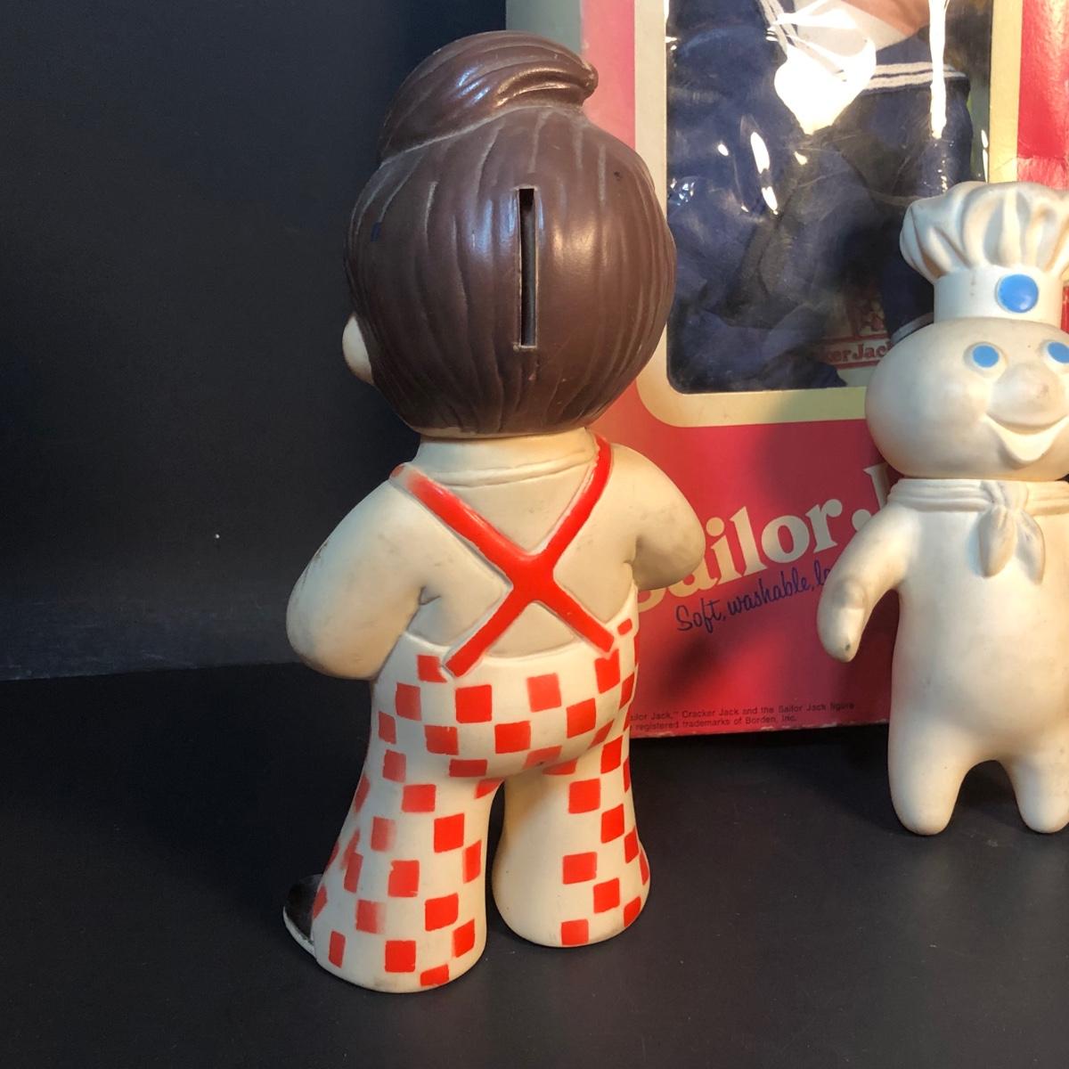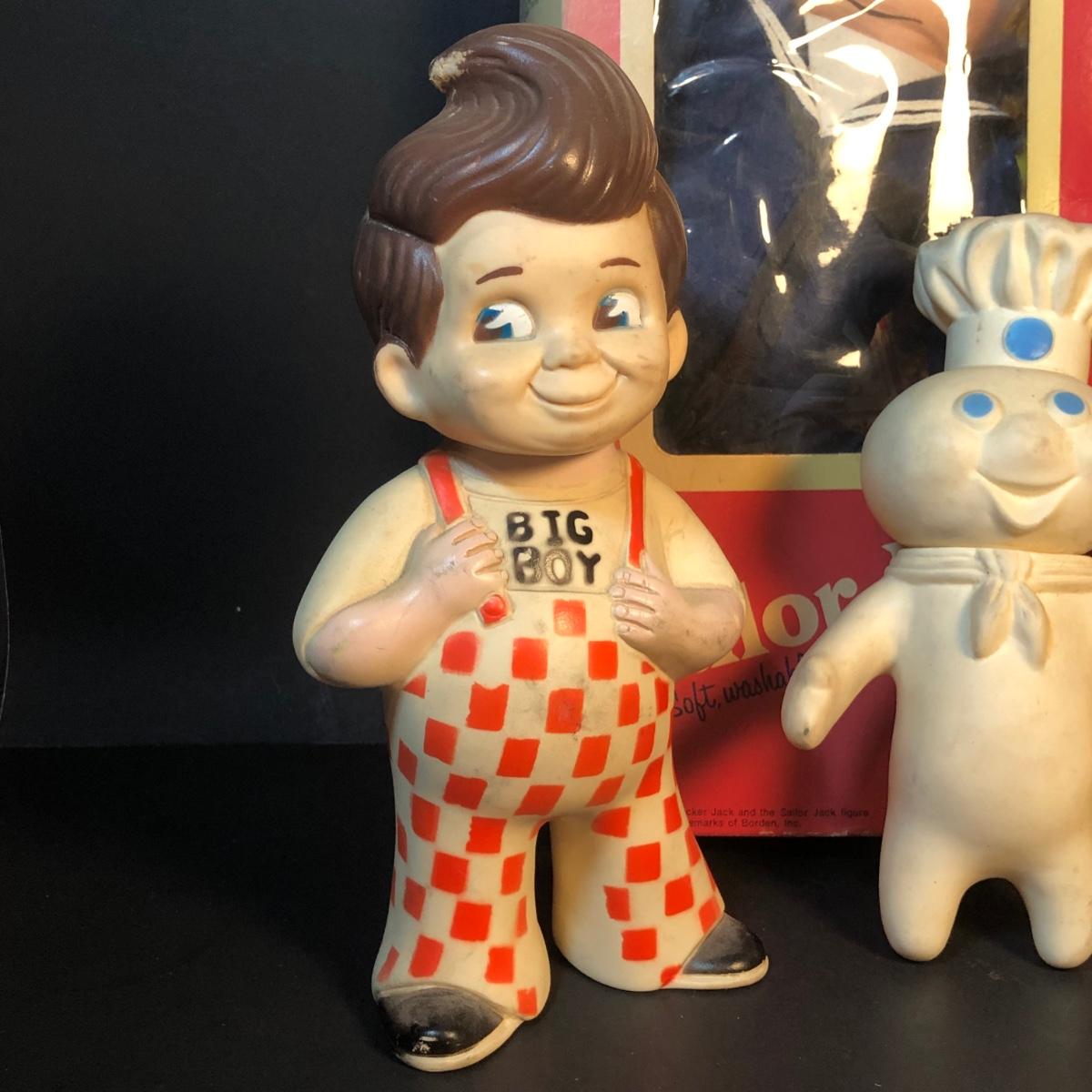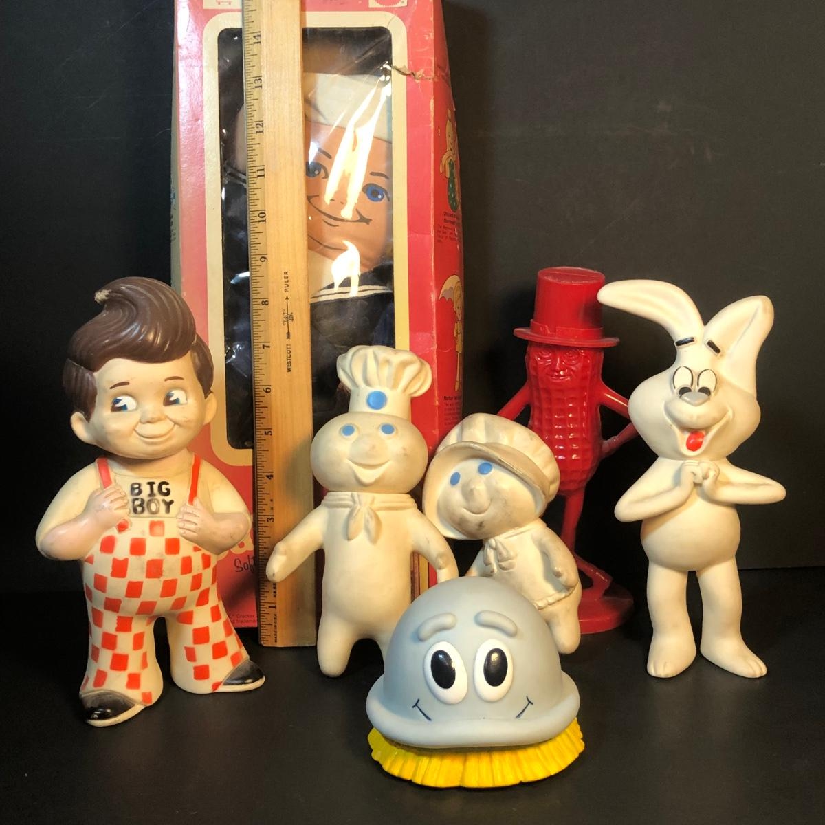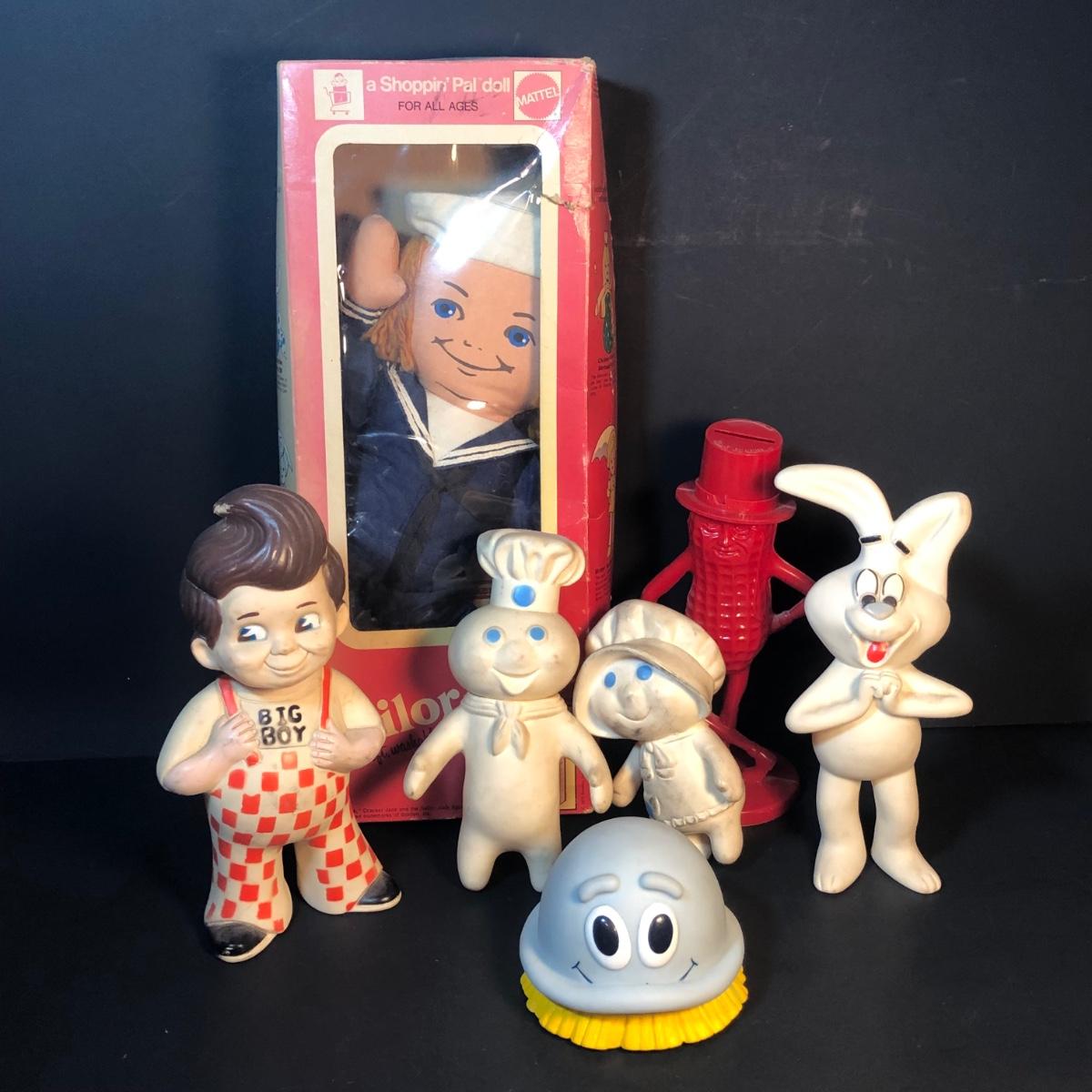LOT 161S: Big Boy Bank, Mr. Peanut Bank, Trix Rabbit, Scrubbing Bubbles, Pillsbury & Mattel Sailor Jack Cloth Doll w/ Original Box