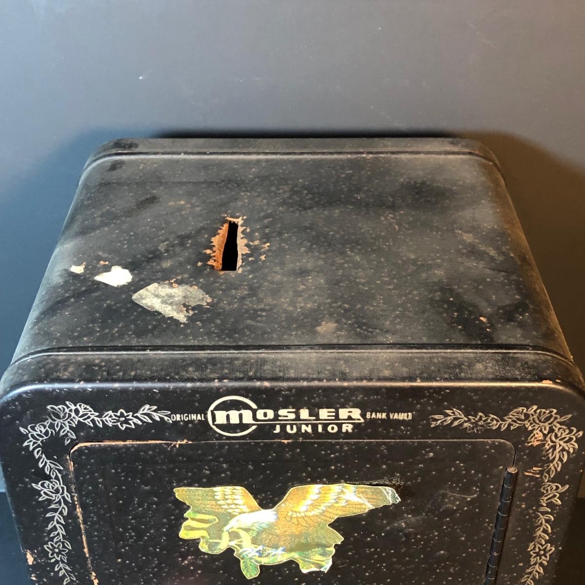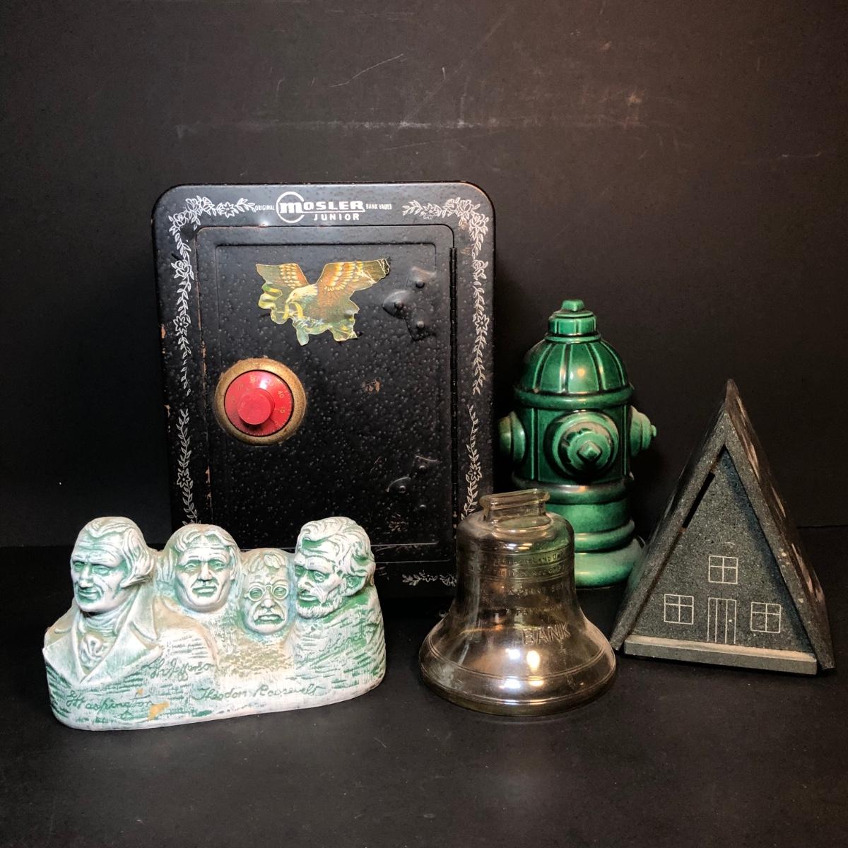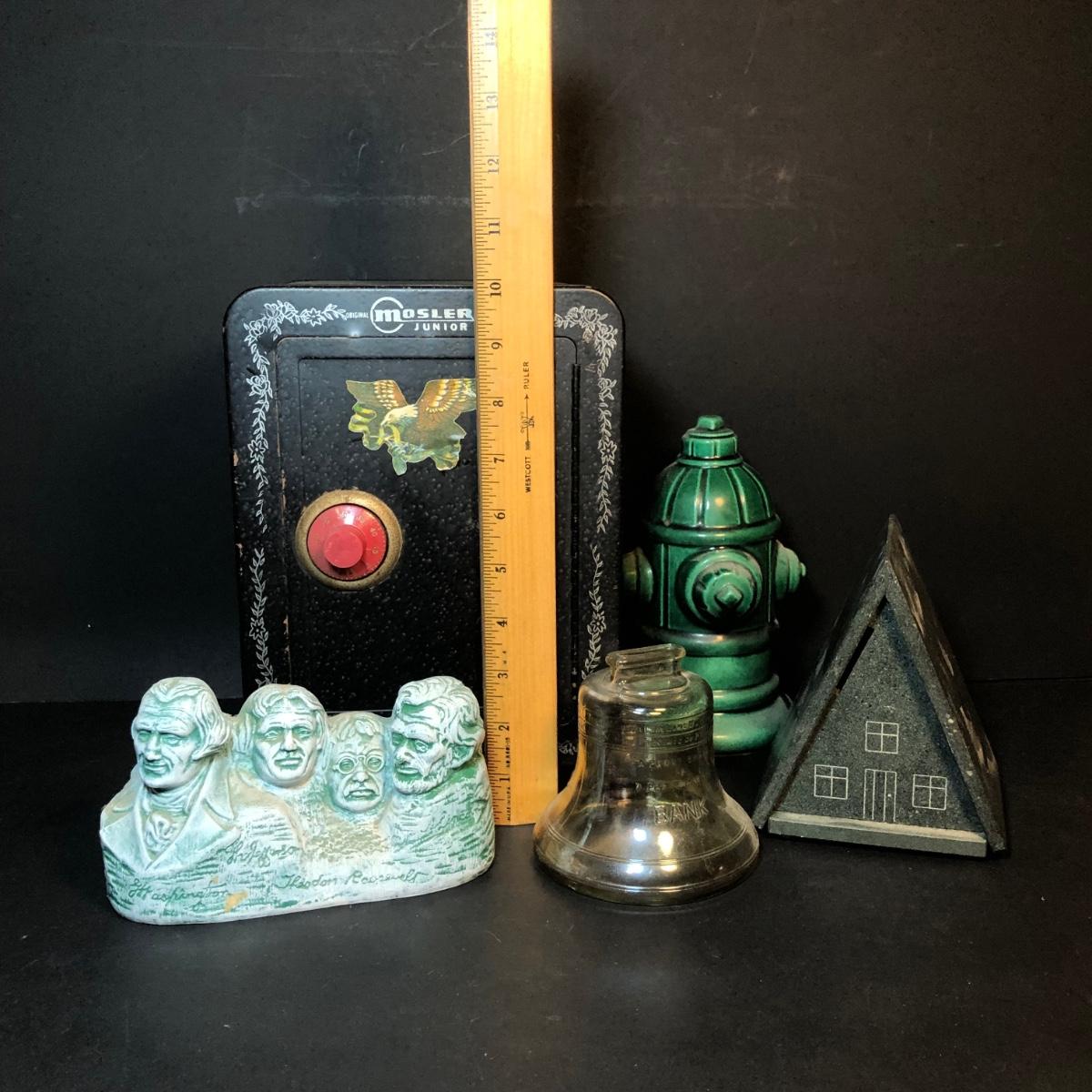 LOT 168S: Vintage Mosler Bank Vault Junior Coin Safe w/ Mt. Rushmore Coin Bank, Liberty Bell Glass Bank & More