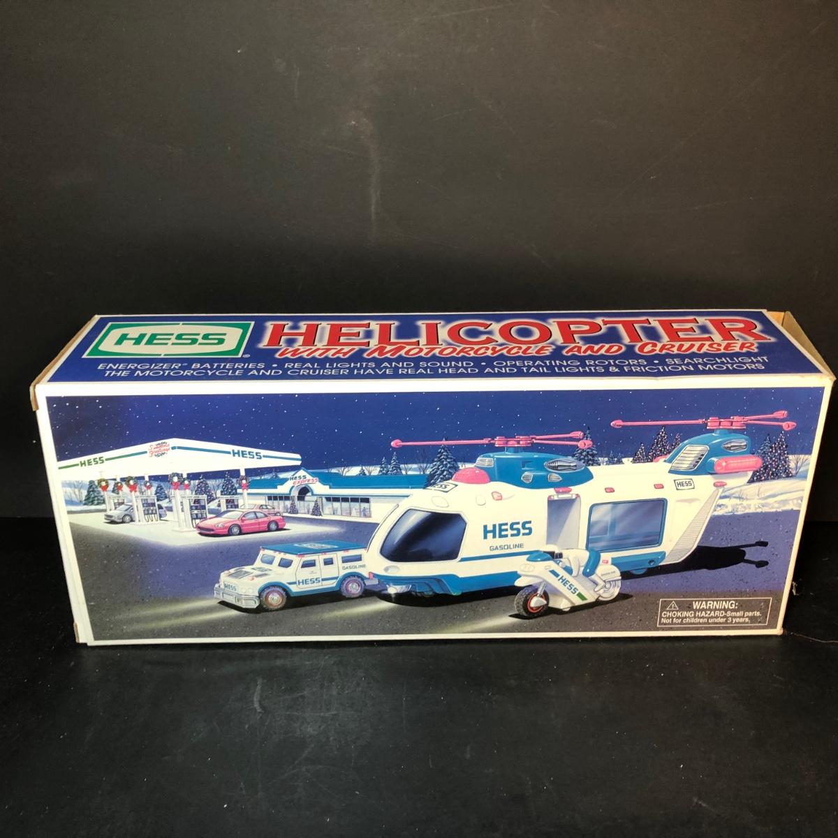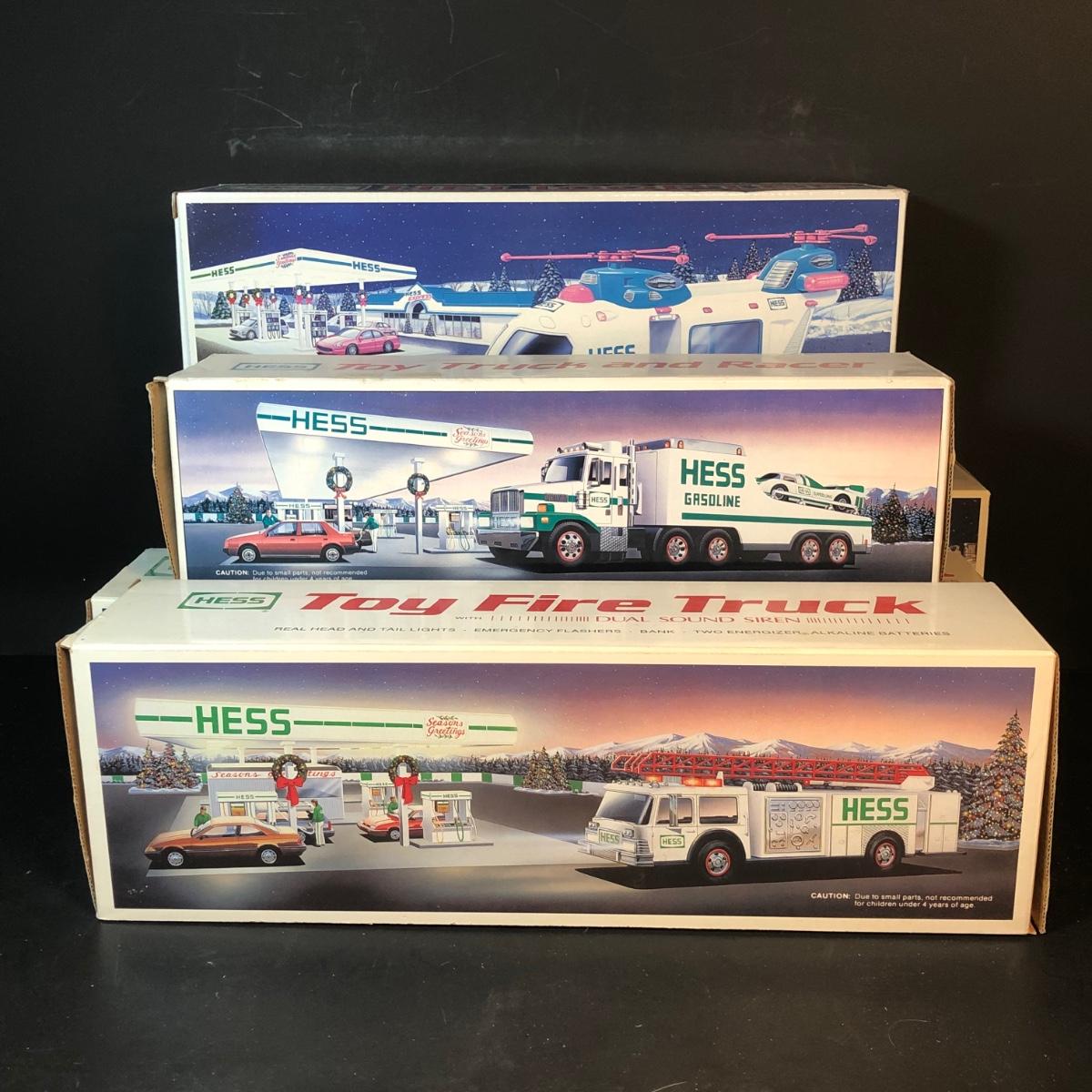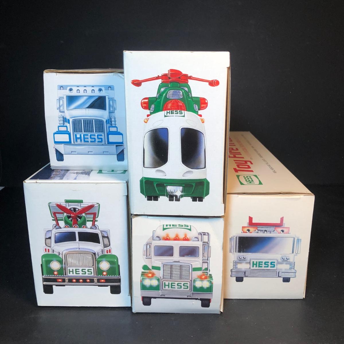 LOT 172S: Hess Collection - 2002 Toy Truck & Airplane, 2001 Helicopter w/ Motorcycle & Cruiser, 1988 Toy Truck & Racer, 1990 Toy Tanker Truck and 1989 Toy Fire Truck
