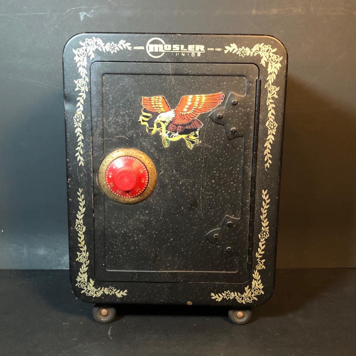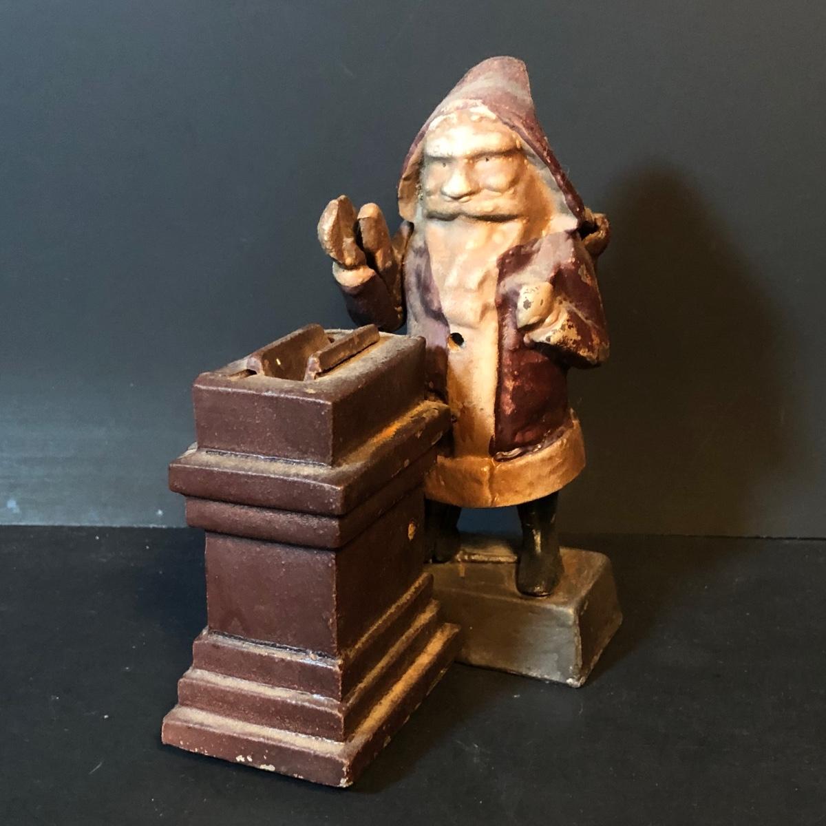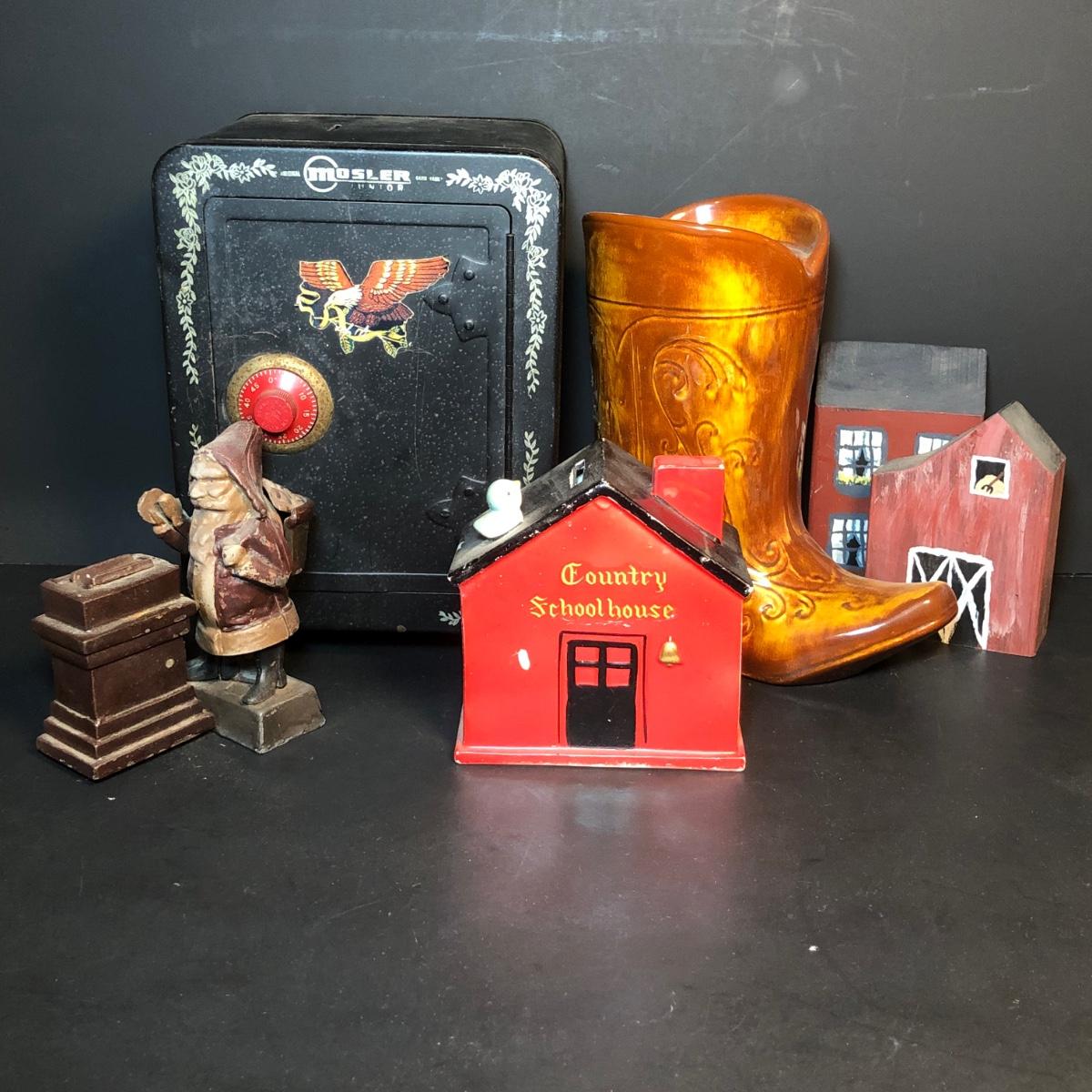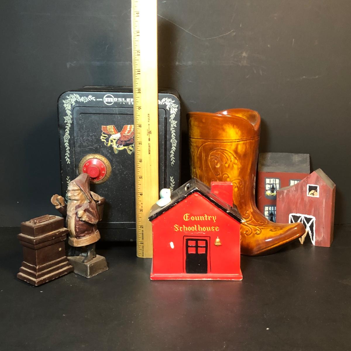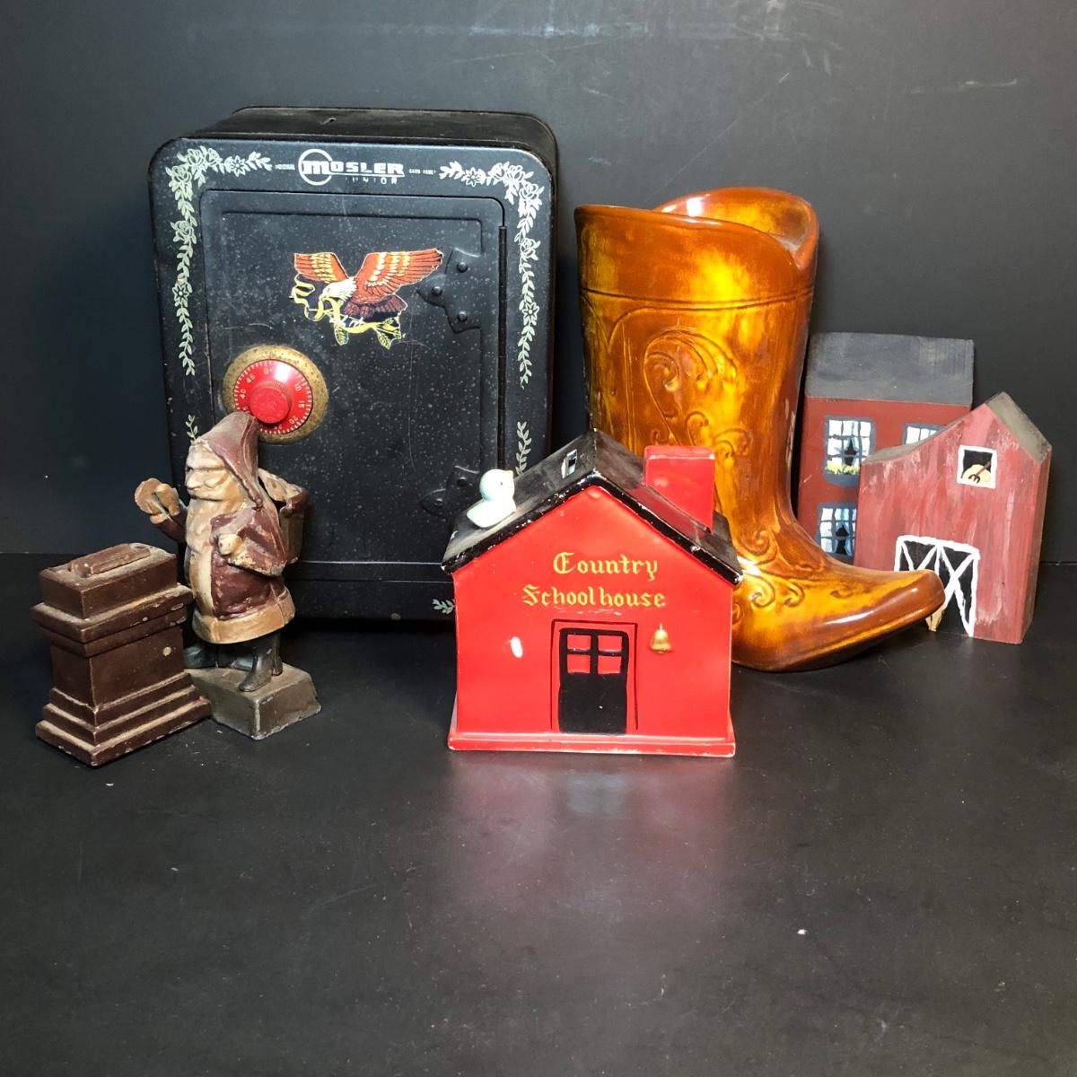 LOT 178S: Vintage Banks: Cast Iron Santa, Mosler Junior Vault, Cowboy Boot Coin Bank & More