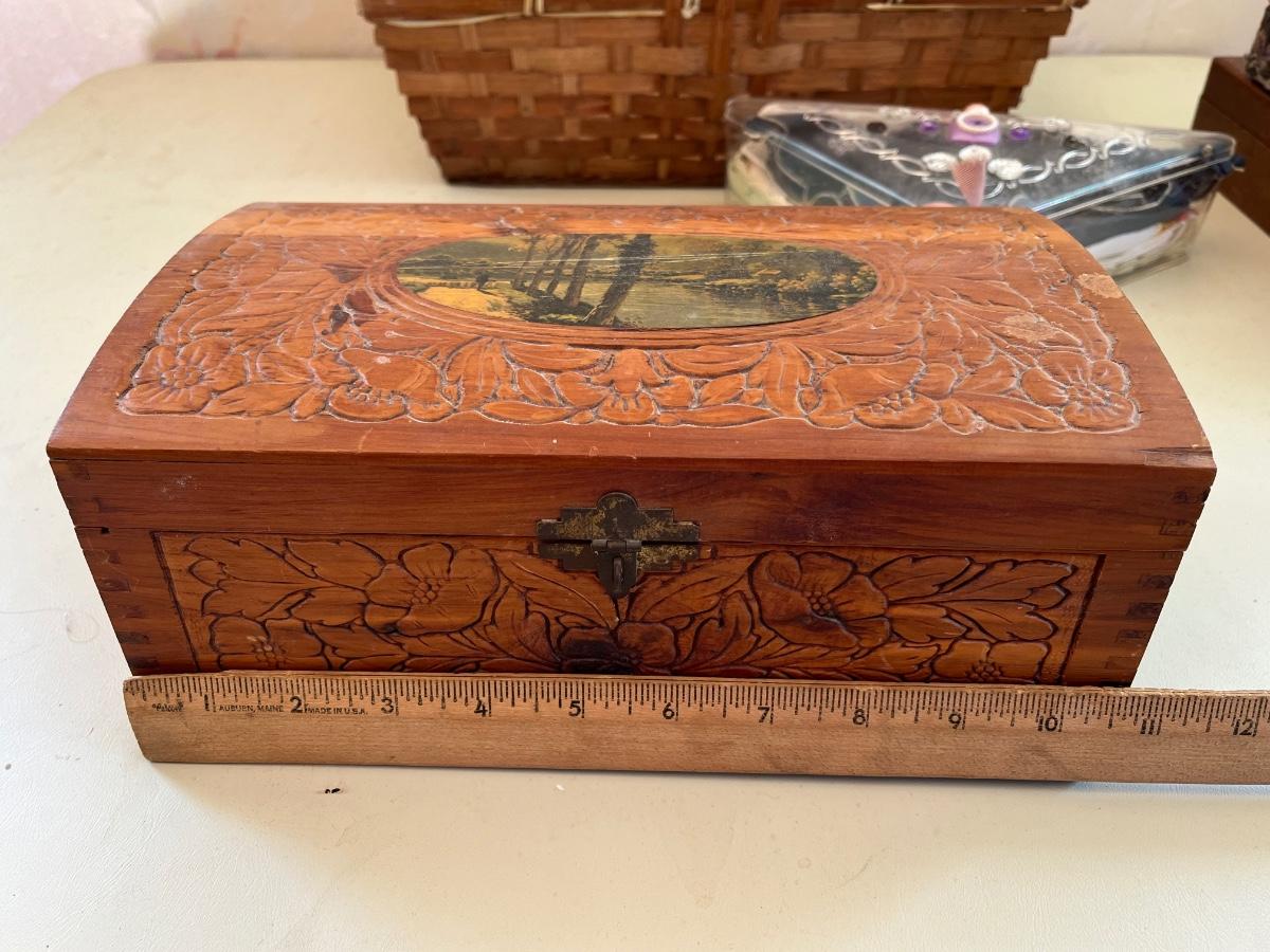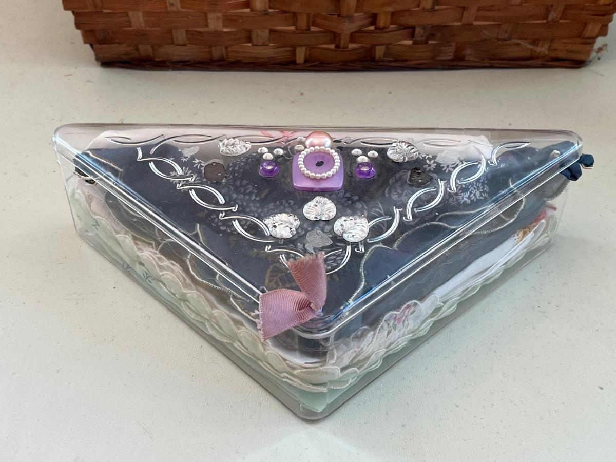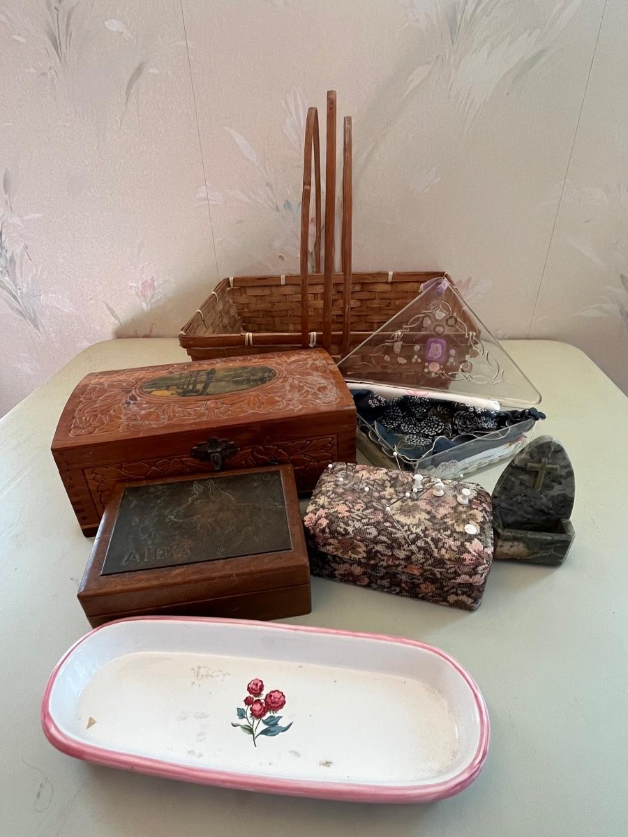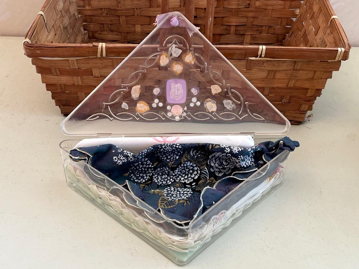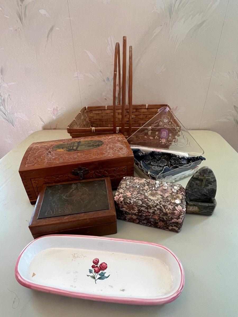 LOT 254C: Fashion Scarves in Box with Trinket Trays, Boxes, Baskets