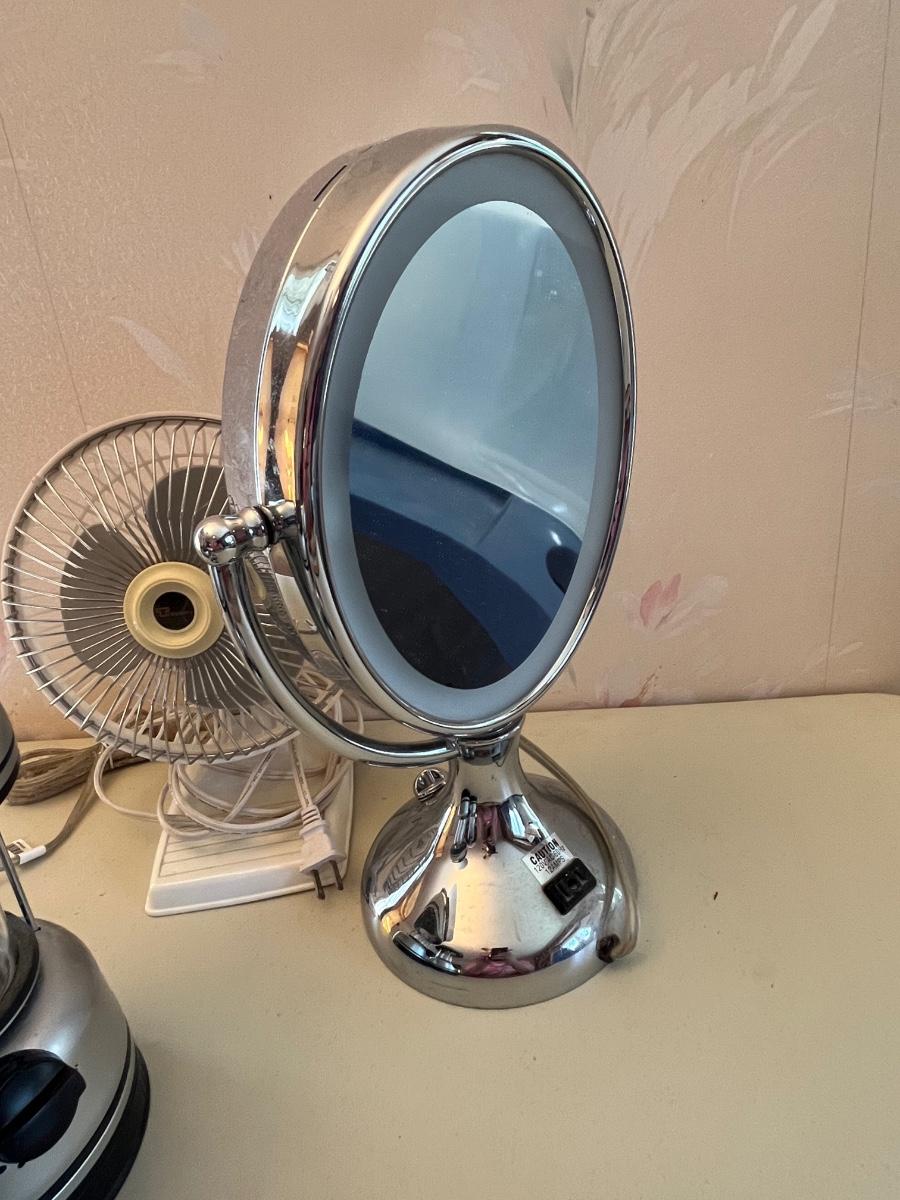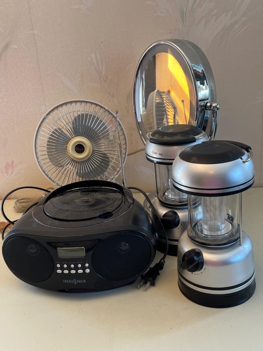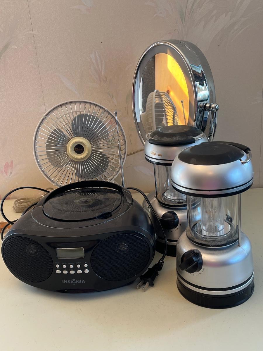 LOT 259C: Small Appliances - Lighted Mirror, Fan, Radio, Lanterns