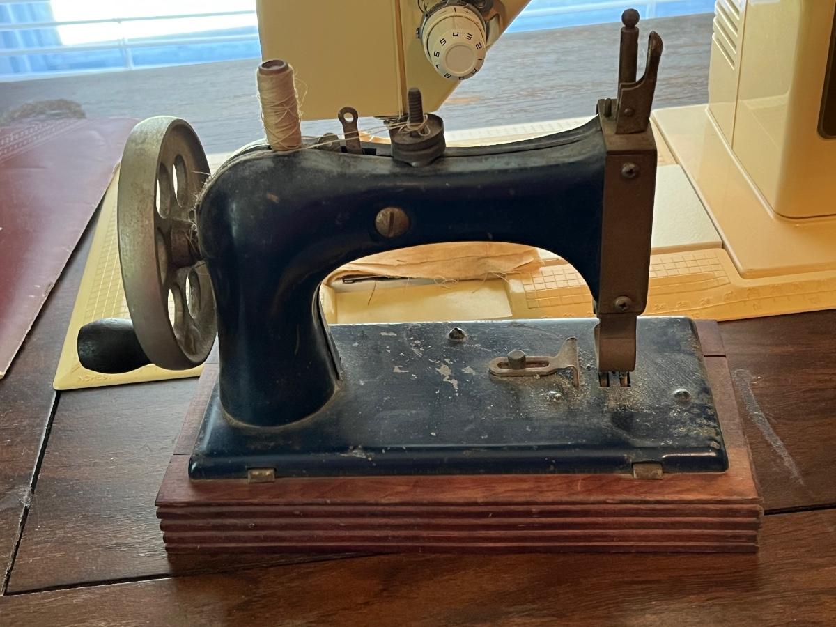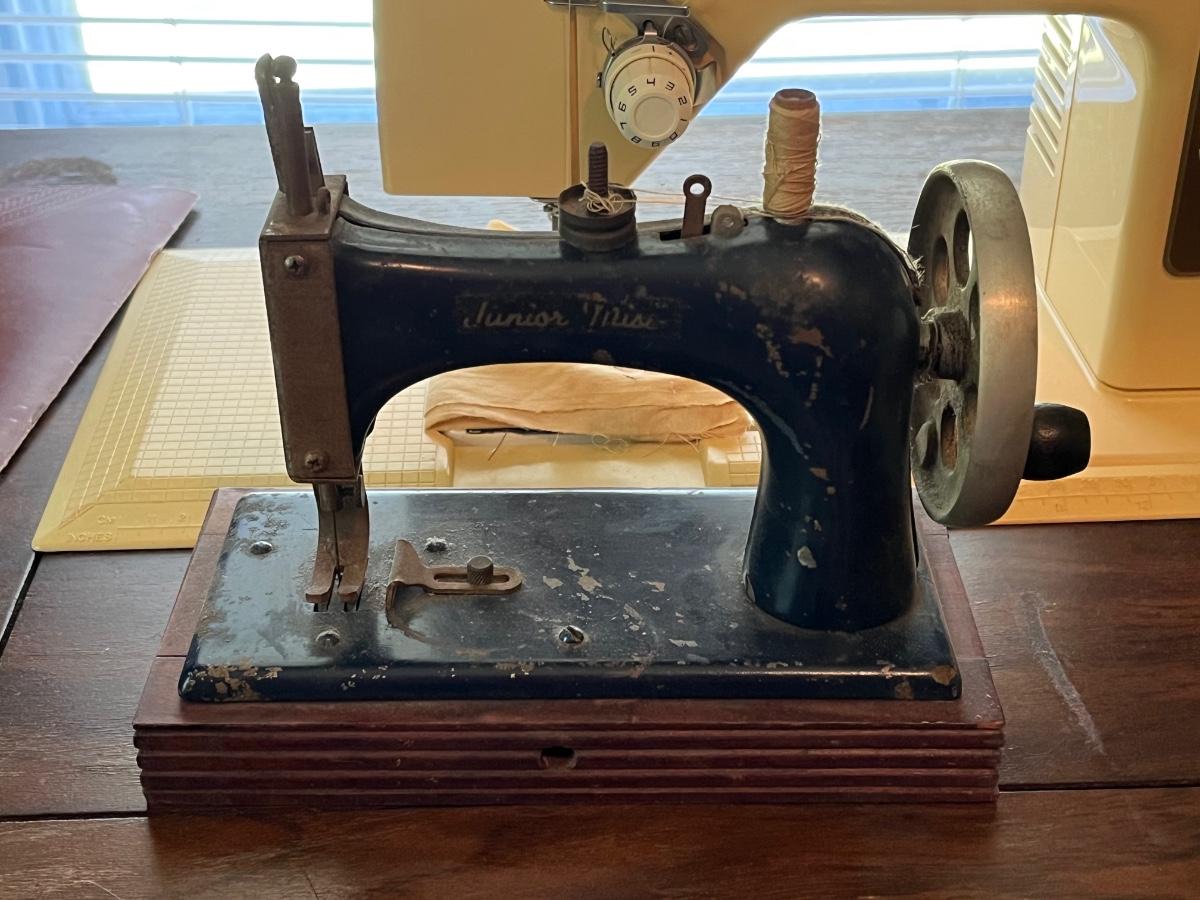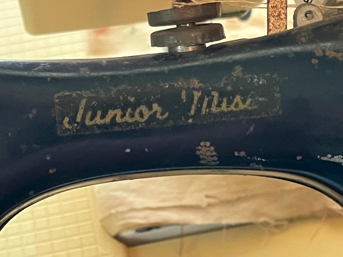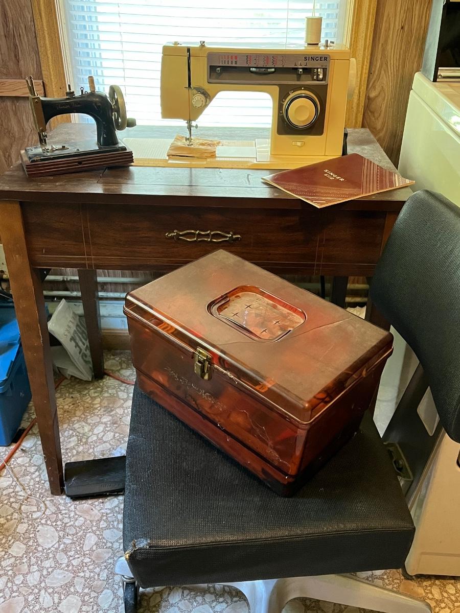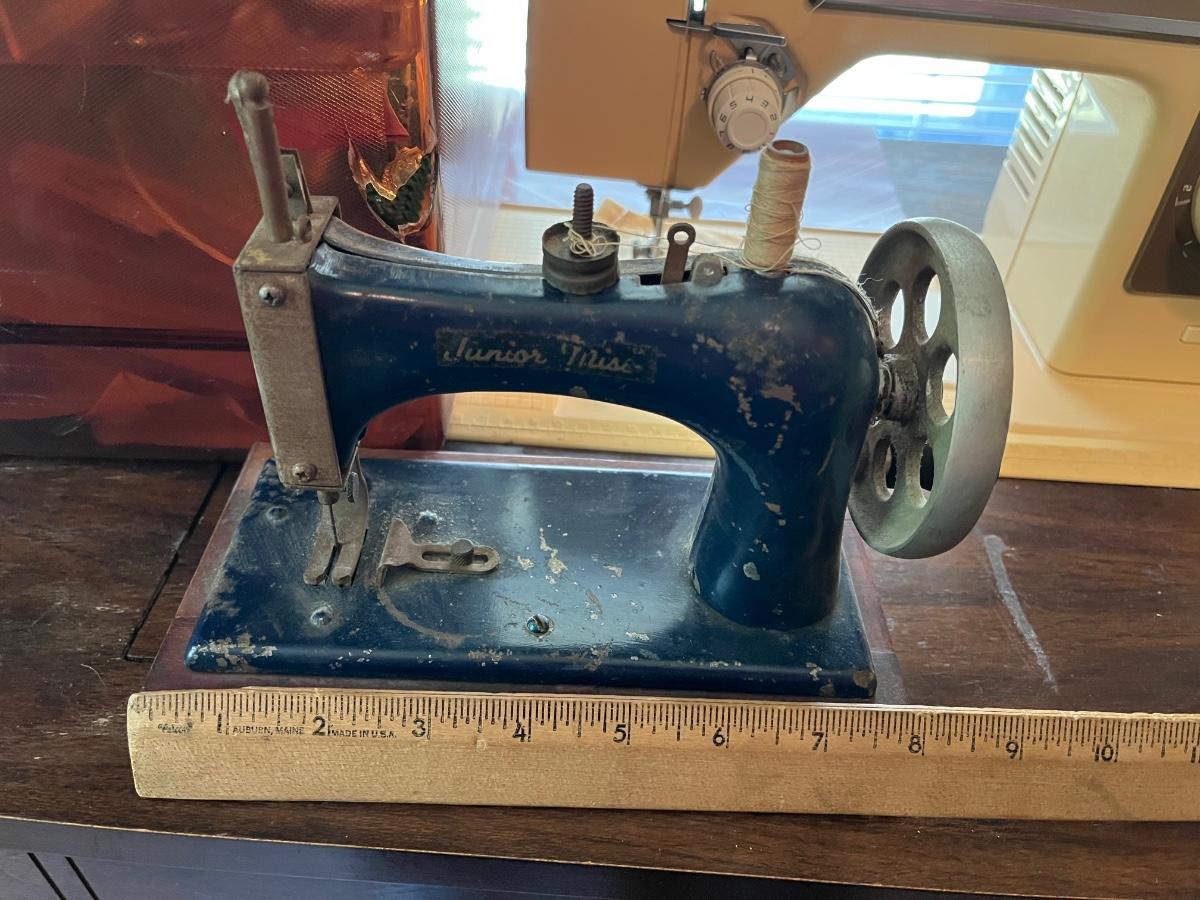 LOT 261S: Singer Sewing Machine on Table with Chair and Vintage Hand Crank Junior Miss Sewing Machine