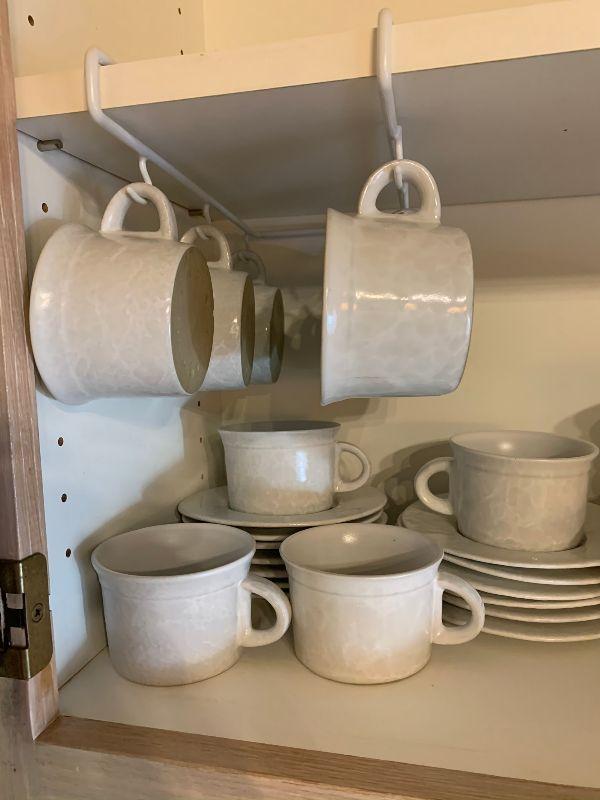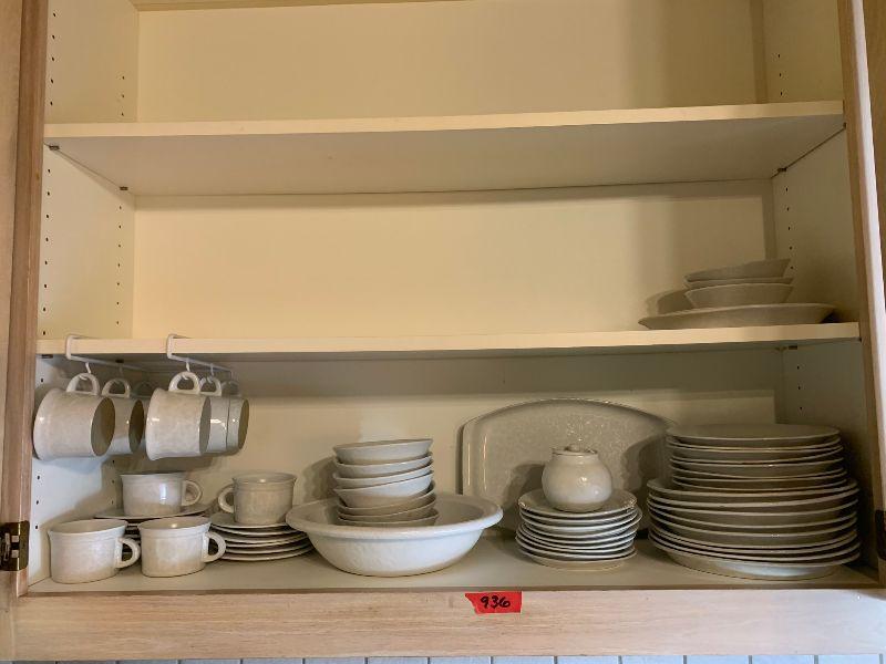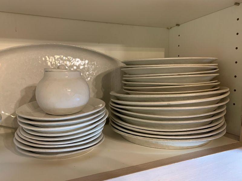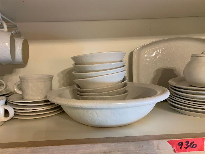 Dishware: Bennington Potters, Vermont #1669 9 dinner plates, 8 salad, 7 bowls, 1 serv platter, 1 serv bowl, 8 bread/desert plates 13 saucers. 10 coffee cups, 5 cracked pieces, 1 sugar dish full service for 7