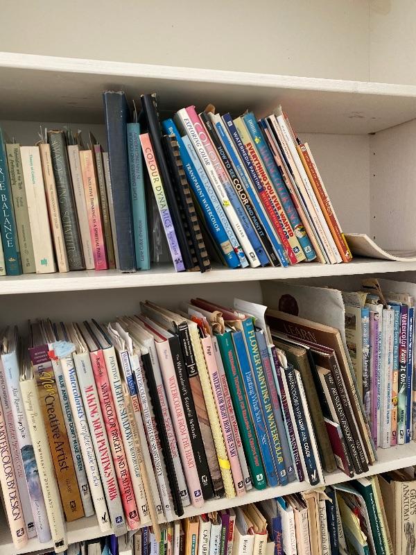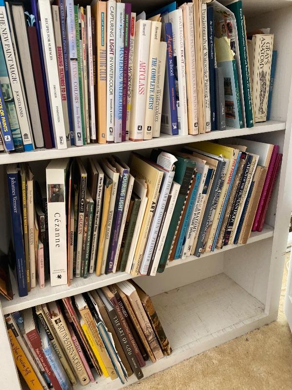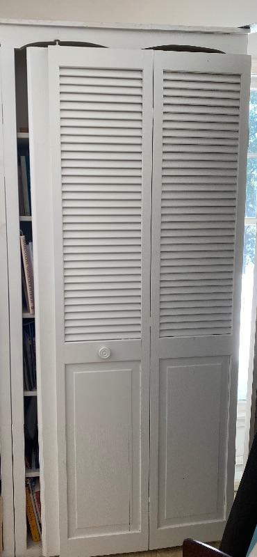 Large white bi-Fold door bookshelf with books
