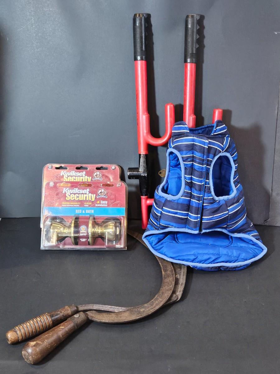LOT 15: Antique Sickles, Doorknobs, Small Dog Jacket & The Club Car Locks